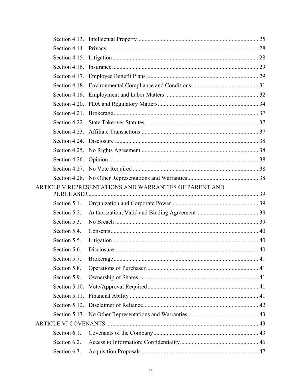 -ii- Section 4.13. Intellectual Property .................................................................................. 25 Section 4.14. Privacy ...................................................................................................... 28 Section 4.15. Litigation ................................................................................................... 28 Section 4.16. Insurance ................................................................................................... 29 Section 4.17. Employee Benefit Plans ............................................................................ 29 Section 4.18. Environmental Compliance and Conditions ............................................. 31 Section 4.19. Employment and Labor Matters ............................................................... 32 Section 4.20. FDA and Regulatory Matters .................................................................... 34 Section 4.21. Brokerage .................................................................................................. 37 Section 4.22. State Takeover Statutes ............................................................................. 37 Section 4.23. Affiliate Transactions................................................................................ 37 Section 4.24. Disclosure ................................................................................................. 38 Section 4.25. No Rights Agreement ............................................................................... 38 Section 4.26. Opinion ..................................................................................................... 38 Section 4.27. No Vote Required ..................................................................................... 38 Section 4.28. No Other Representations and Warranties ................................................ 38 ARTICLE V REPRESENTATIONS AND WARRANTIES OF PARENT AND PURCHASER ................................................................................................................... 39 Section 5.1. Organization and Corporate Power ........................................................... 39 Section 5.2. Authorization; Valid and Binding Agreement .......................................... 39 Section 5.3. No Breach ................................................................................................. 39 Section 5.4. Consents .................................................................................................... 40 Section 5.5. Litigation ................................................................................................... 40 Section 5.6. Disclosure ................................................................................................. 40 Section 5.7. Brokerage .................................................................................................. 41 Section 5.8. Operations of Purchaser ............................................................................ 41 Section 5.9. Ownership of Shares ................................................................................. 41 Section 5.10. Vote/Approval Required ........................................................................... 41 Section 5.11. Financial Ability ....................................................................................... 41 Section 5.12. Disclaimer of Reliance .............................................................................. 42 Section 5.13. No Other Representations and Warranties ................................................ 43 ARTICLE VI COVENANTS ....................................................................................................... 43 Section 6.1. Covenants of the Company ....................................................................... 43 Section 6.2. Access to Information; Confidentiality ..................................................... 46 Section 6.3. Acquisition Proposals ............................................................................... 47