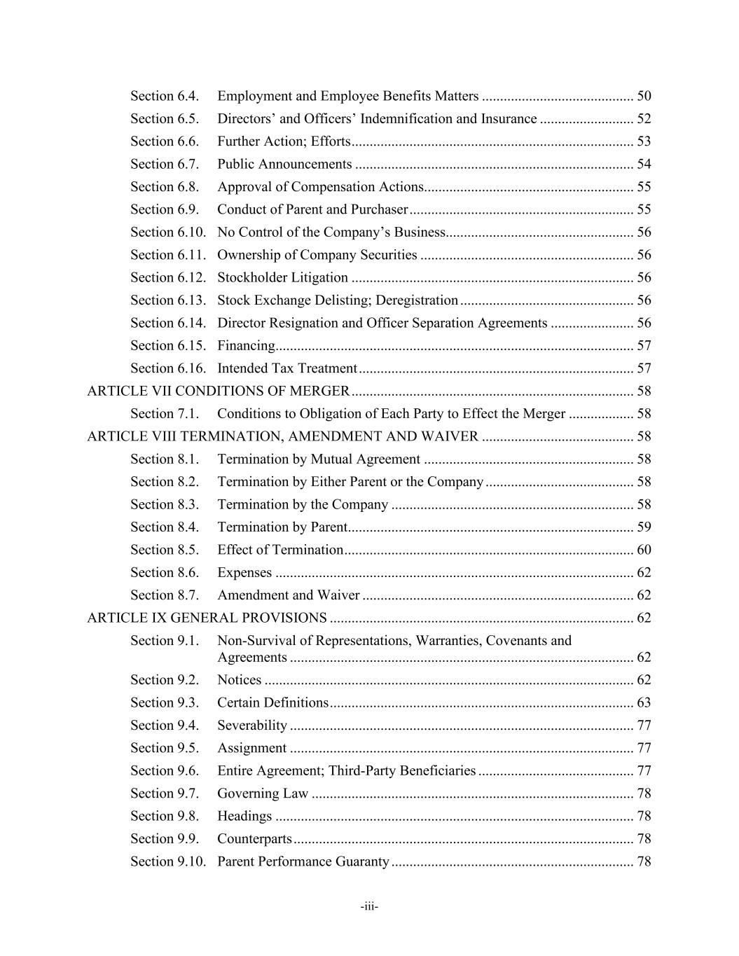 -iii- Section 6.4. Employment and Employee Benefits Matters .......................................... 50 Section 6.5. Directors’ and Officers’ Indemnification and Insurance .......................... 52 Section 6.6. Further Action; Efforts .............................................................................. 53 Section 6.7. Public Announcements ............................................................................. 54 Section 6.8. Approval of Compensation Actions.......................................................... 55 Section 6.9. Conduct of Parent and Purchaser .............................................................. 55 Section 6.10. No Control of the Company’s Business.................................................... 56 Section 6.11. Ownership of Company Securities ........................................................... 56 Section 6.12. Stockholder Litigation .............................................................................. 56 Section 6.13. Stock Exchange Delisting; Deregistration ................................................ 56 Section 6.14. Director Resignation and Officer Separation Agreements ....................... 56 Section 6.15. Financing................................................................................................... 57 Section 6.16. Intended Tax Treatment ............................................................................ 57 ARTICLE VII CONDITIONS OF MERGER .............................................................................. 58 Section 7.1. Conditions to Obligation of Each Party to Effect the Merger .................. 58 ARTICLE VIII TERMINATION, AMENDMENT AND WAIVER .......................................... 58 Section 8.1. Termination by Mutual Agreement .......................................................... 58 Section 8.2. Termination by Either Parent or the Company ......................................... 58 Section 8.3. Termination by the Company ................................................................... 58 Section 8.4. Termination by Parent............................................................................... 59 Section 8.5. Effect of Termination ................................................................................ 60 Section 8.6. Expenses ................................................................................................... 62 Section 8.7. Amendment and Waiver ........................................................................... 62 ARTICLE IX GENERAL PROVISIONS .................................................................................... 62 Section 9.1. Non-Survival of Representations, Warranties, Covenants and Agreements ............................................................................................... 62 Section 9.2. Notices ...................................................................................................... 62 Section 9.3. Certain Definitions .................................................................................... 63 Section 9.4. Severability ............................................................................................... 77 Section 9.5. Assignment ............................................................................................... 77 Section 9.6. Entire Agreement; Third-Party Beneficiaries ........................................... 77 Section 9.7. Governing Law ......................................................................................... 78 Section 9.8. Headings ................................................................................................... 78 Section 9.9. Counterparts .............................................................................................. 78 Section 9.10. Parent Performance Guaranty ................................................................... 78