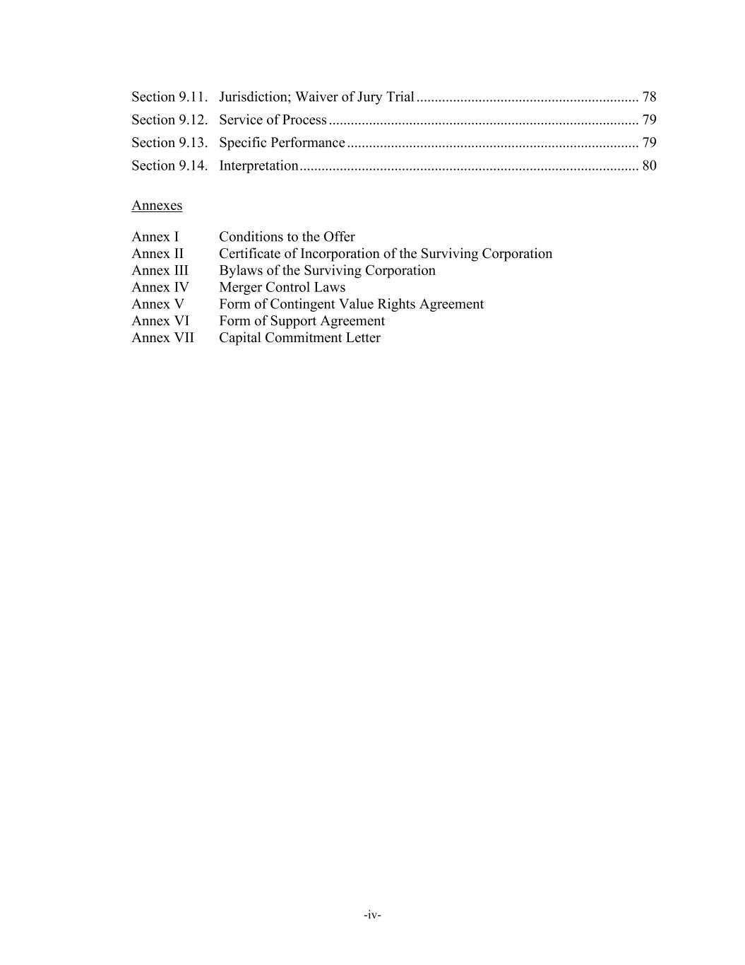 -iv- Section 9.11. Jurisdiction; Waiver of Jury Trial ............................................................. 78 Section 9.12. Service of Process ..................................................................................... 79 Section 9.13. Specific Performance ................................................................................ 79 Section 9.14. Interpretation ............................................................................................. 80 Annexes Annex I Conditions to the Offer Annex II Certificate of Incorporation of the Surviving Corporation Annex III Bylaws of the Surviving Corporation Annex IV Merger Control Laws Annex V Form of Contingent Value Rights Agreement Annex VI Form of Support Agreement Annex VII Capital Commitment Letter