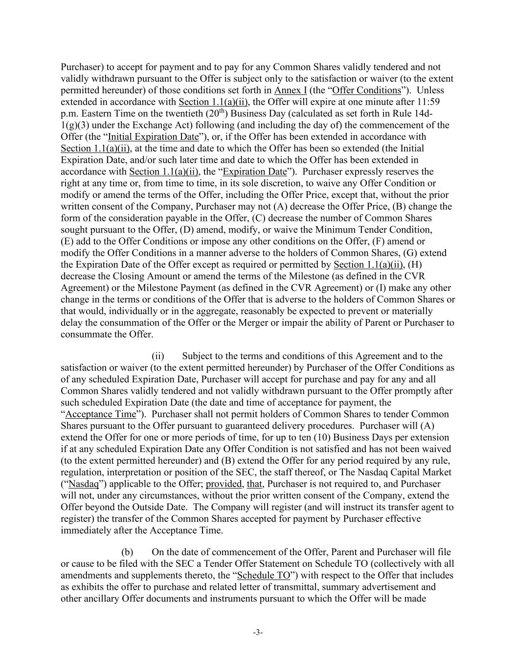 -3- Purchaser) to accept for payment and to pay for any Common Shares validly tendered and not validly withdrawn pursuant to the Offer is subject only to the satisfaction or waiver (to the extent permitted hereunder) of those conditions set forth in Annex I (the “Offer Conditions”). Unless extended in accordance with Section 1.1(a)(ii), the Offer will expire at one minute after 11:59 p.m. Eastern Time on the twentieth (20th) Business Day (calculated as set forth in Rule 14d- 1(g)(3) under the Exchange Act) following (and including the day of) the commencement of the Offer (the “Initial Expiration Date”), or, if the Offer has been extended in accordance with Section 1.1(a)(ii), at the time and date to which the Offer has been so extended (the Initial Expiration Date, and/or such later time and date to which the Offer has been extended in accordance with Section 1.1(a)(ii), the “Expiration Date”). Purchaser expressly reserves the right at any time or, from time to time, in its sole discretion, to waive any Offer Condition or modify or amend the terms of the Offer, including the Offer Price, except that, without the prior written consent of the Company, Purchaser may not (A) decrease the Offer Price, (B) change the form of the consideration payable in the Offer, (C) decrease the number of Common Shares sought pursuant to the Offer, (D) amend, modify, or waive the Minimum Tender Condition, (E) add to the Offer Conditions or impose any other conditions on the Offer, (F) amend or modify the Offer Conditions in a manner adverse to the holders of Common Shares, (G) extend the Expiration Date of the Offer except as required or permitted by Section 1.1(a)(ii), (H) decrease the Closing Amount or amend the terms of the Milestone (as defined in the CVR Agreement) or the Milestone Payment (as defined in the CVR Agreement) or (I) make any other change in the terms or conditions of the Offer that is adverse to the holders of Common Shares or that would, individually or in the aggregate, reasonably be expected to prevent or materially delay the consummation of the Offer or the Merger or impair the ability of Parent or Purchaser to consummate the Offer. (ii) Subject to the terms and conditions of this Agreement and to the satisfaction or waiver (to the extent permitted hereunder) by Purchaser of the Offer Conditions as of any scheduled Expiration Date, Purchaser will accept for purchase and pay for any and all Common Shares validly tendered and not validly withdrawn pursuant to the Offer promptly after such scheduled Expiration Date (the date and time of acceptance for payment, the “Acceptance Time”). Purchaser shall not permit holders of Common Shares to tender Common Shares pursuant to the Offer pursuant to guaranteed delivery procedures. Purchaser will (A) extend the Offer for one or more periods of time, for up to ten (10) Business Days per extension if at any scheduled Expiration Date any Offer Condition is not satisfied and has not been waived (to the extent permitted hereunder) and (B) extend the Offer for any period required by any rule, regulation, interpretation or position of the SEC, the staff thereof, or The Nasdaq Capital Market (“Nasdaq”) applicable to the Offer; provided, that, Purchaser is not required to, and Purchaser will not, under any circumstances, without the prior written consent of the Company, extend the Offer beyond the Outside Date. The Company will register (and will instruct its transfer agent to register) the transfer of the Common Shares accepted for payment by Purchaser effective immediately after the Acceptance Time. (b) On the date of commencement of the Offer, Parent and Purchaser will file or cause to be filed with the SEC a Tender Offer Statement on Schedule TO (collectively with all amendments and supplements thereto, the “Schedule TO”) with respect to the Offer that includes as exhibits the offer to purchase and related letter of transmittal, summary advertisement and other ancillary Offer documents and instruments pursuant to which the Offer will be made