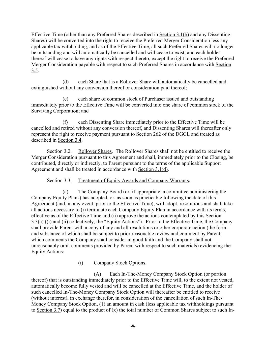 -8- Effective Time (other than any Preferred Shares described in Section 3.1(b) and any Dissenting Shares) will be converted into the right to receive the Preferred Merger Consideration less any applicable tax withholding, and as of the Effective Time, all such Preferred Shares will no longer be outstanding and will automatically be cancelled and will cease to exist, and each holder thereof will cease to have any rights with respect thereto, except the right to receive the Preferred Merger Consideration payable with respect to such Preferred Shares in accordance with Section 3.5. (d) each Share that is a Rollover Share will automatically be cancelled and extinguished without any conversion thereof or consideration paid thereof; (e) each share of common stock of Purchaser issued and outstanding immediately prior to the Effective Time will be converted into one share of common stock of the Surviving Corporation; and (f) each Dissenting Share immediately prior to the Effective Time will be cancelled and retired without any conversion thereof, and Dissenting Shares will thereafter only represent the right to receive payment pursuant to Section 262 of the DGCL and treated as described in Section 3.4. Section 3.2. Rollover Shares. The Rollover Shares shall not be entitled to receive the Merger Consideration pursuant to this Agreement and shall, immediately prior to the Closing, be contributed, directly or indirectly, to Parent pursuant to the terms of the applicable Support Agreement and shall be treated in accordance with Section 3.1(d). Section 3.3. Treatment of Equity Awards and Company Warrants. (a) The Company Board (or, if appropriate, a committee administering the Company Equity Plans) has adopted, or, as soon as practicable following the date of this Agreement (and, in any event, prior to the Effective Time), will adopt, resolutions and shall take all actions necessary to (i) terminate each Company Equity Plan in accordance with its terms, effective as of the Effective Time and (ii) approve the actions contemplated by this Section 3.3(a) ((i) and (ii) collectively, the “Equity Actions”). Prior to the Effective Time, the Company shall provide Parent with a copy of any and all resolutions or other corporate action (the form and substance of which shall be subject to prior reasonable review and comment by Parent, which comments the Company shall consider in good faith and the Company shall not unreasonably omit comments provided by Parent with respect to such materials) evidencing the Equity Actions: (i) Company Stock Options. (A) Each In-The-Money Company Stock Option (or portion thereof) that is outstanding immediately prior to the Effective Time will, to the extent not vested, automatically become fully vested and will be cancelled at the Effective Time, and the holder of such cancelled In-The-Money Company Stock Option will thereafter be entitled to receive (without interest), in exchange therefor, in consideration of the cancellation of such In-The- Money Company Stock Option, (1) an amount in cash (less applicable tax withholdings pursuant to Section 3.7) equal to the product of (x) the total number of Common Shares subject to such In-