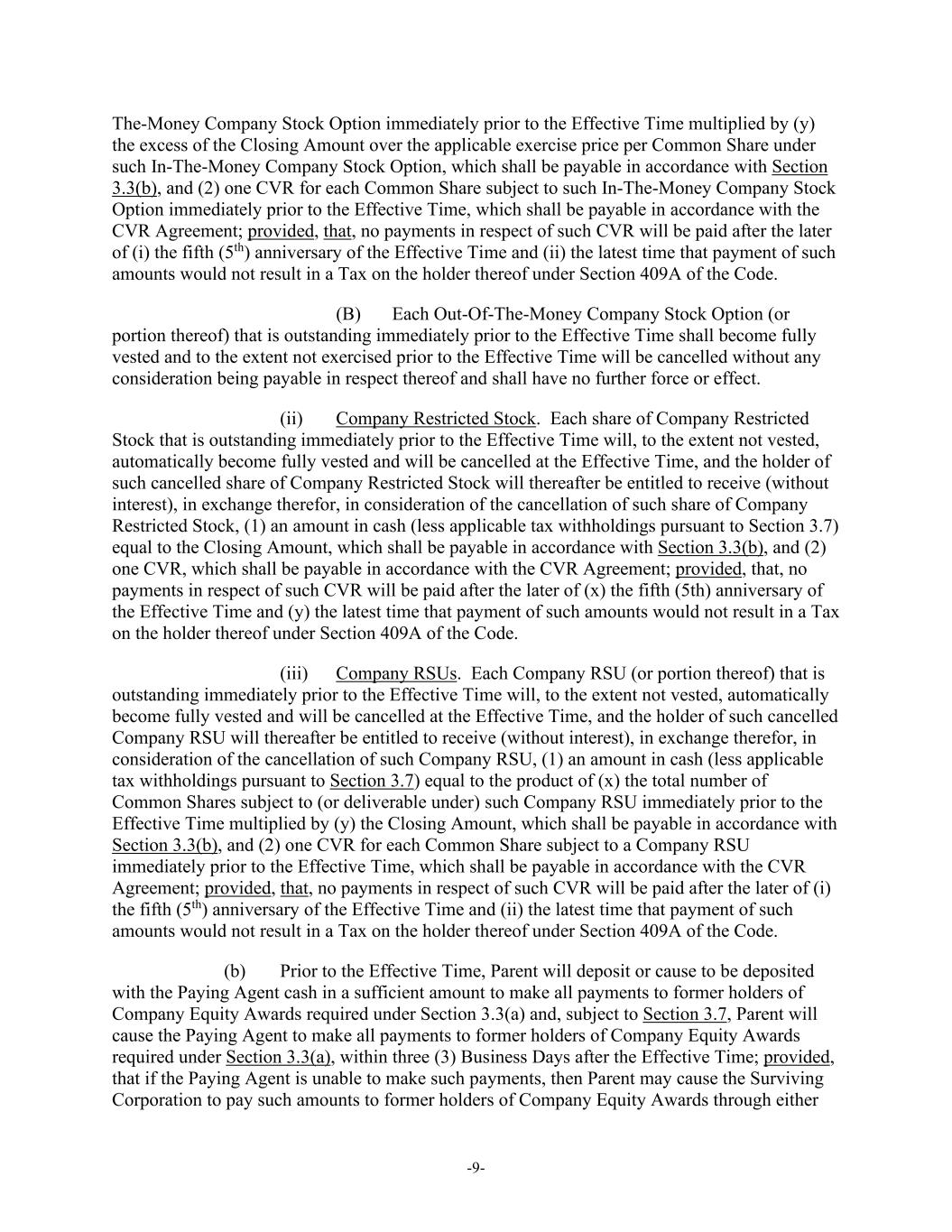 -9- The-Money Company Stock Option immediately prior to the Effective Time multiplied by (y) the excess of the Closing Amount over the applicable exercise price per Common Share under such In-The-Money Company Stock Option, which shall be payable in accordance with Section 3.3(b), and (2) one CVR for each Common Share subject to such In-The-Money Company Stock Option immediately prior to the Effective Time, which shall be payable in accordance with the CVR Agreement; provided, that, no payments in respect of such CVR will be paid after the later of (i) the fifth (5th) anniversary of the Effective Time and (ii) the latest time that payment of such amounts would not result in a Tax on the holder thereof under Section 409A of the Code. (B) Each Out-Of-The-Money Company Stock Option (or portion thereof) that is outstanding immediately prior to the Effective Time shall become fully vested and to the extent not exercised prior to the Effective Time will be cancelled without any consideration being payable in respect thereof and shall have no further force or effect. (ii) Company Restricted Stock. Each share of Company Restricted Stock that is outstanding immediately prior to the Effective Time will, to the extent not vested, automatically become fully vested and will be cancelled at the Effective Time, and the holder of such cancelled share of Company Restricted Stock will thereafter be entitled to receive (without interest), in exchange therefor, in consideration of the cancellation of such share of Company Restricted Stock, (1) an amount in cash (less applicable tax withholdings pursuant to Section 3.7) equal to the Closing Amount, which shall be payable in accordance with Section 3.3(b), and (2) one CVR, which shall be payable in accordance with the CVR Agreement; provided, that, no payments in respect of such CVR will be paid after the later of (x) the fifth (5th) anniversary of the Effective Time and (y) the latest time that payment of such amounts would not result in a Tax on the holder thereof under Section 409A of the Code. (iii) Company RSUs. Each Company RSU (or portion thereof) that is outstanding immediately prior to the Effective Time will, to the extent not vested, automatically become fully vested and will be cancelled at the Effective Time, and the holder of such cancelled Company RSU will thereafter be entitled to receive (without interest), in exchange therefor, in consideration of the cancellation of such Company RSU, (1) an amount in cash (less applicable tax withholdings pursuant to Section 3.7) equal to the product of (x) the total number of Common Shares subject to (or deliverable under) such Company RSU immediately prior to the Effective Time multiplied by (y) the Closing Amount, which shall be payable in accordance with Section 3.3(b), and (2) one CVR for each Common Share subject to a Company RSU immediately prior to the Effective Time, which shall be payable in accordance with the CVR Agreement; provided, that, no payments in respect of such CVR will be paid after the later of (i) the fifth (5th) anniversary of the Effective Time and (ii) the latest time that payment of such amounts would not result in a Tax on the holder thereof under Section 409A of the Code. (b) Prior to the Effective Time, Parent will deposit or cause to be deposited with the Paying Agent cash in a sufficient amount to make all payments to former holders of Company Equity Awards required under Section 3.3(a) and, subject to Section 3.7, Parent will cause the Paying Agent to make all payments to former holders of Company Equity Awards required under Section 3.3(a), within three (3) Business Days after the Effective Time; provided, that if the Paying Agent is unable to make such payments, then Parent may cause the Surviving Corporation to pay such amounts to former holders of Company Equity Awards through either