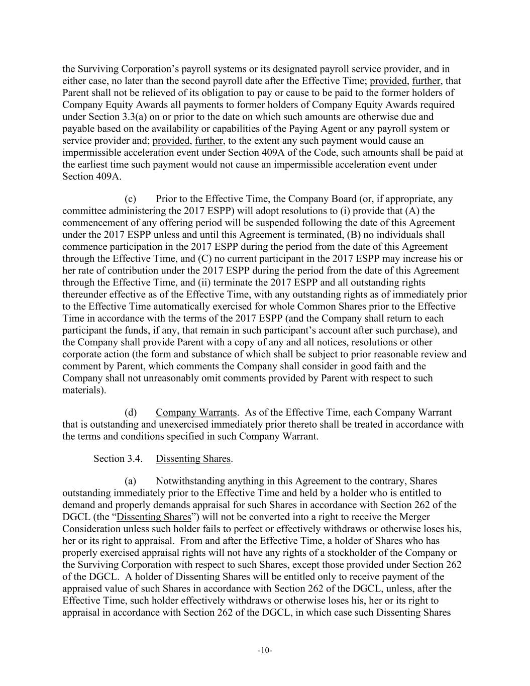 -10- the Surviving Corporation’s payroll systems or its designated payroll service provider, and in either case, no later than the second payroll date after the Effective Time; provided, further, that Parent shall not be relieved of its obligation to pay or cause to be paid to the former holders of Company Equity Awards all payments to former holders of Company Equity Awards required under Section 3.3(a) on or prior to the date on which such amounts are otherwise due and payable based on the availability or capabilities of the Paying Agent or any payroll system or service provider and; provided, further, to the extent any such payment would cause an impermissible acceleration event under Section 409A of the Code, such amounts shall be paid at the earliest time such payment would not cause an impermissible acceleration event under Section 409A. (c) Prior to the Effective Time, the Company Board (or, if appropriate, any committee administering the 2017 ESPP) will adopt resolutions to (i) provide that (A) the commencement of any offering period will be suspended following the date of this Agreement under the 2017 ESPP unless and until this Agreement is terminated, (B) no individuals shall commence participation in the 2017 ESPP during the period from the date of this Agreement through the Effective Time, and (C) no current participant in the 2017 ESPP may increase his or her rate of contribution under the 2017 ESPP during the period from the date of this Agreement through the Effective Time, and (ii) terminate the 2017 ESPP and all outstanding rights thereunder effective as of the Effective Time, with any outstanding rights as of immediately prior to the Effective Time automatically exercised for whole Common Shares prior to the Effective Time in accordance with the terms of the 2017 ESPP (and the Company shall return to each participant the funds, if any, that remain in such participant’s account after such purchase), and the Company shall provide Parent with a copy of any and all notices, resolutions or other corporate action (the form and substance of which shall be subject to prior reasonable review and comment by Parent, which comments the Company shall consider in good faith and the Company shall not unreasonably omit comments provided by Parent with respect to such materials). (d) Company Warrants. As of the Effective Time, each Company Warrant that is outstanding and unexercised immediately prior thereto shall be treated in accordance with the terms and conditions specified in such Company Warrant. Section 3.4. Dissenting Shares. (a) Notwithstanding anything in this Agreement to the contrary, Shares outstanding immediately prior to the Effective Time and held by a holder who is entitled to demand and properly demands appraisal for such Shares in accordance with Section 262 of the DGCL (the “Dissenting Shares”) will not be converted into a right to receive the Merger Consideration unless such holder fails to perfect or effectively withdraws or otherwise loses his, her or its right to appraisal. From and after the Effective Time, a holder of Shares who has properly exercised appraisal rights will not have any rights of a stockholder of the Company or the Surviving Corporation with respect to such Shares, except those provided under Section 262 of the DGCL. A holder of Dissenting Shares will be entitled only to receive payment of the appraised value of such Shares in accordance with Section 262 of the DGCL, unless, after the Effective Time, such holder effectively withdraws or otherwise loses his, her or its right to appraisal in accordance with Section 262 of the DGCL, in which case such Dissenting Shares