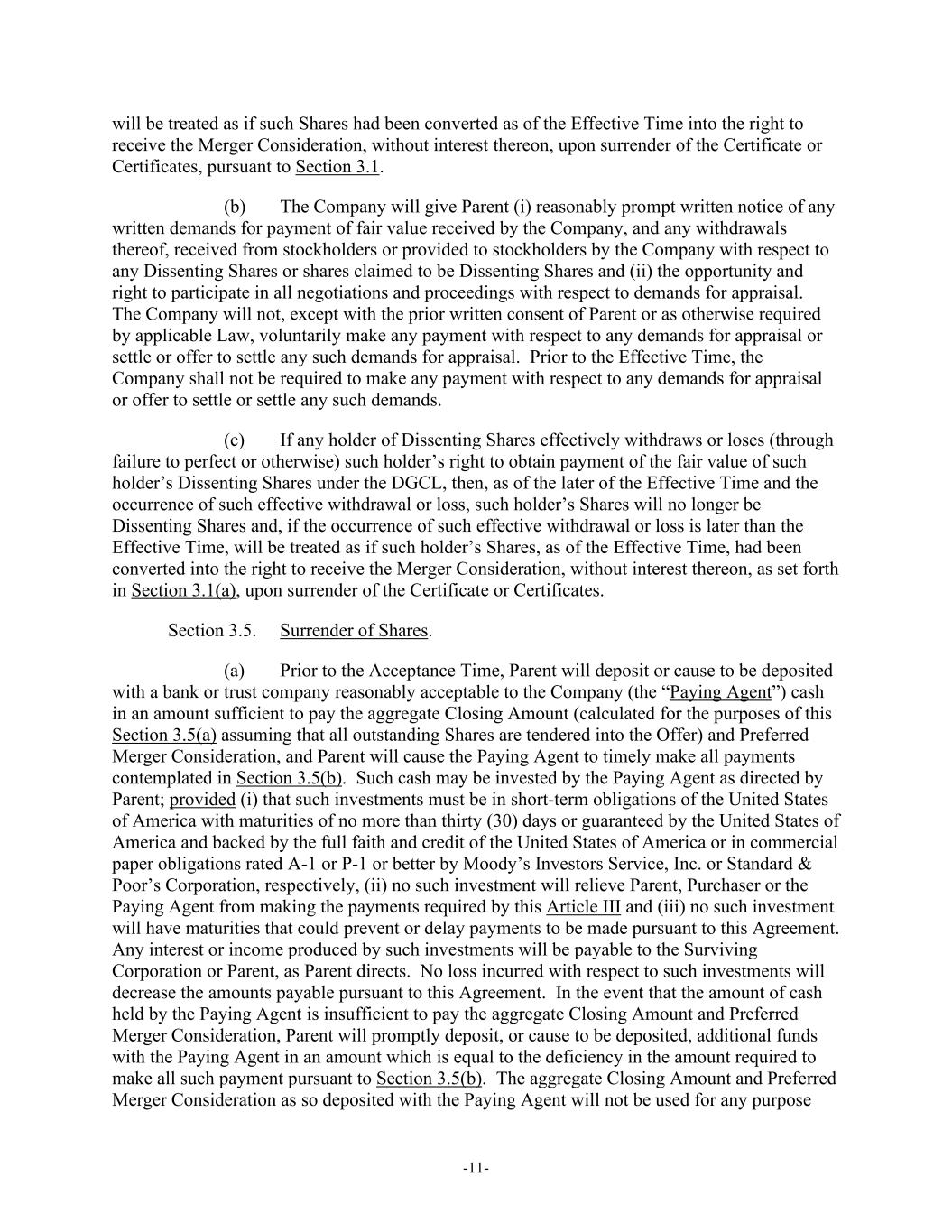 -11- will be treated as if such Shares had been converted as of the Effective Time into the right to receive the Merger Consideration, without interest thereon, upon surrender of the Certificate or Certificates, pursuant to Section 3.1. (b) The Company will give Parent (i) reasonably prompt written notice of any written demands for payment of fair value received by the Company, and any withdrawals thereof, received from stockholders or provided to stockholders by the Company with respect to any Dissenting Shares or shares claimed to be Dissenting Shares and (ii) the opportunity and right to participate in all negotiations and proceedings with respect to demands for appraisal. The Company will not, except with the prior written consent of Parent or as otherwise required by applicable Law, voluntarily make any payment with respect to any demands for appraisal or settle or offer to settle any such demands for appraisal. Prior to the Effective Time, the Company shall not be required to make any payment with respect to any demands for appraisal or offer to settle or settle any such demands. (c) If any holder of Dissenting Shares effectively withdraws or loses (through failure to perfect or otherwise) such holder’s right to obtain payment of the fair value of such holder’s Dissenting Shares under the DGCL, then, as of the later of the Effective Time and the occurrence of such effective withdrawal or loss, such holder’s Shares will no longer be Dissenting Shares and, if the occurrence of such effective withdrawal or loss is later than the Effective Time, will be treated as if such holder’s Shares, as of the Effective Time, had been converted into the right to receive the Merger Consideration, without interest thereon, as set forth in Section 3.1(a), upon surrender of the Certificate or Certificates. Section 3.5. Surrender of Shares. (a) Prior to the Acceptance Time, Parent will deposit or cause to be deposited with a bank or trust company reasonably acceptable to the Company (the “Paying Agent”) cash in an amount sufficient to pay the aggregate Closing Amount (calculated for the purposes of this Section 3.5(a) assuming that all outstanding Shares are tendered into the Offer) and Preferred Merger Consideration, and Parent will cause the Paying Agent to timely make all payments contemplated in Section 3.5(b). Such cash may be invested by the Paying Agent as directed by Parent; provided (i) that such investments must be in short-term obligations of the United States of America with maturities of no more than thirty (30) days or guaranteed by the United States of America and backed by the full faith and credit of the United States of America or in commercial paper obligations rated A-1 or P-1 or better by Moody’s Investors Service, Inc. or Standard & Poor’s Corporation, respectively, (ii) no such investment will relieve Parent, Purchaser or the Paying Agent from making the payments required by this Article III and (iii) no such investment will have maturities that could prevent or delay payments to be made pursuant to this Agreement. Any interest or income produced by such investments will be payable to the Surviving Corporation or Parent, as Parent directs. No loss incurred with respect to such investments will decrease the amounts payable pursuant to this Agreement. In the event that the amount of cash held by the Paying Agent is insufficient to pay the aggregate Closing Amount and Preferred Merger Consideration, Parent will promptly deposit, or cause to be deposited, additional funds with the Paying Agent in an amount which is equal to the deficiency in the amount required to make all such payment pursuant to Section 3.5(b). The aggregate Closing Amount and Preferred Merger Consideration as so deposited with the Paying Agent will not be used for any purpose