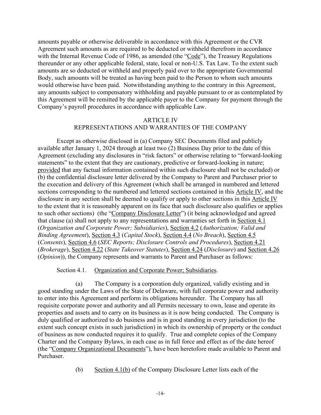 -14- amounts payable or otherwise deliverable in accordance with this Agreement or the CVR Agreement such amounts as are required to be deducted or withheld therefrom in accordance with the Internal Revenue Code of 1986, as amended (the “Code”), the Treasury Regulations thereunder or any other applicable federal, state, local or non-U.S. Tax Law. To the extent such amounts are so deducted or withheld and properly paid over to the appropriate Governmental Body, such amounts will be treated as having been paid to the Person to whom such amounts would otherwise have been paid. Notwithstanding anything to the contrary in this Agreement, any amounts subject to compensatory withholding and payable pursuant to or as contemplated by this Agreement will be remitted by the applicable payer to the Company for payment through the Company’s payroll procedures in accordance with applicable Law. ARTICLE IV REPRESENTATIONS AND WARRANTIES OF THE COMPANY Except as otherwise disclosed in (a) Company SEC Documents filed and publicly available after January 1, 2024 through at least two (2) Business Day prior to the date of this Agreement (excluding any disclosures in “risk factors” or otherwise relating to “forward-looking statements” to the extent that they are cautionary, predictive or forward-looking in nature; provided that any factual information contained within such disclosure shall not be excluded) or (b) the confidential disclosure letter delivered by the Company to Parent and Purchaser prior to the execution and delivery of this Agreement (which shall be arranged in numbered and lettered sections corresponding to the numbered and lettered sections contained in this Article IV, and the disclosure in any section shall be deemed to qualify or apply to other sections in this Article IV to the extent that it is reasonably apparent on its face that such disclosure also qualifies or applies to such other sections) (the “Company Disclosure Letter”) (it being acknowledged and agreed that clause (a) shall not apply to any representations and warranties set forth in Section 4.1 (Organization and Corporate Power; Subsidiaries), Section 4.2 (Authorization; Valid and Binding Agreement), Section 4.3 (Capital Stock), Section 4.4 (No Breach), Section 4.5 (Consents), Section 4.6 (SEC Reports; Disclosure Controls and Procedures), Section 4.21 (Brokerage), Section 4.22 (State Takeover Statutes), Section 4.24 (Disclosure) and Section 4.26 (Opinion)), the Company represents and warrants to Parent and Purchaser as follows: Section 4.1. Organization and Corporate Power; Subsidiaries. (a) The Company is a corporation duly organized, validly existing and in good standing under the Laws of the State of Delaware, with full corporate power and authority to enter into this Agreement and perform its obligations hereunder. The Company has all requisite corporate power and authority and all Permits necessary to own, lease and operate its properties and assets and to carry on its business as it is now being conducted. The Company is duly qualified or authorized to do business and is in good standing in every jurisdiction (to the extent such concept exists in such jurisdiction) in which its ownership of property or the conduct of business as now conducted requires it to qualify. True and complete copies of the Company Charter and the Company Bylaws, in each case as in full force and effect as of the date hereof (the “Company Organizational Documents”), have been heretofore made available to Parent and Purchaser. (b) Section 4.1(b) of the Company Disclosure Letter lists each of the
