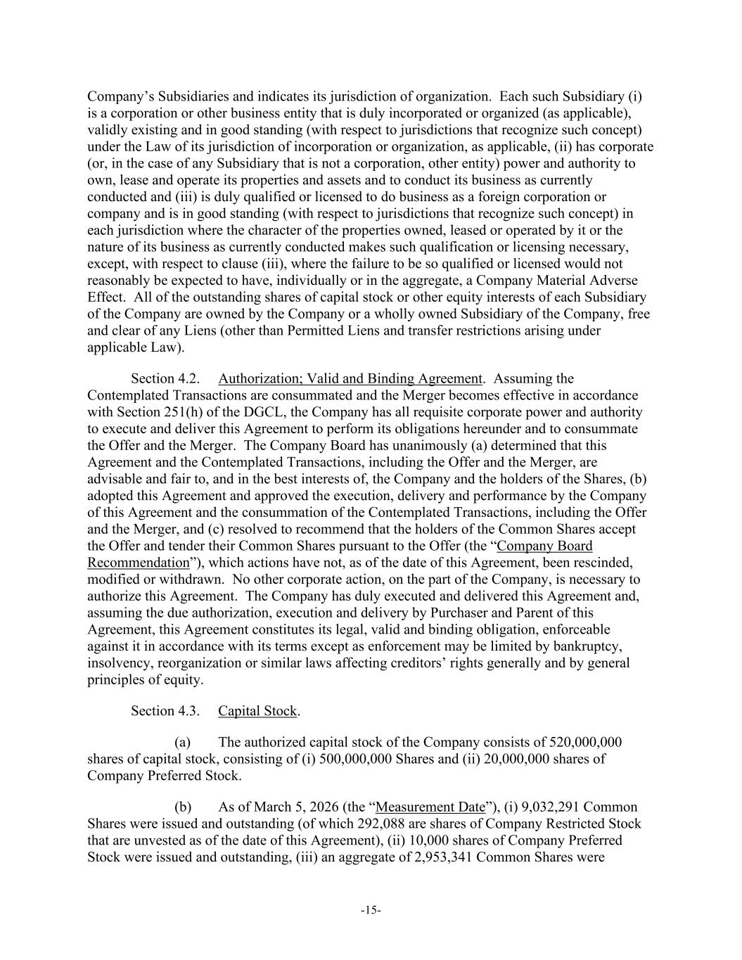 -15- Company’s Subsidiaries and indicates its jurisdiction of organization. Each such Subsidiary (i) is a corporation or other business entity that is duly incorporated or organized (as applicable), validly existing and in good standing (with respect to jurisdictions that recognize such concept) under the Law of its jurisdiction of incorporation or organization, as applicable, (ii) has corporate (or, in the case of any Subsidiary that is not a corporation, other entity) power and authority to own, lease and operate its properties and assets and to conduct its business as currently conducted and (iii) is duly qualified or licensed to do business as a foreign corporation or company and is in good standing (with respect to jurisdictions that recognize such concept) in each jurisdiction where the character of the properties owned, leased or operated by it or the nature of its business as currently conducted makes such qualification or licensing necessary, except, with respect to clause (iii), where the failure to be so qualified or licensed would not reasonably be expected to have, individually or in the aggregate, a Company Material Adverse Effect. All of the outstanding shares of capital stock or other equity interests of each Subsidiary of the Company are owned by the Company or a wholly owned Subsidiary of the Company, free and clear of any Liens (other than Permitted Liens and transfer restrictions arising under applicable Law). Section 4.2. Authorization; Valid and Binding Agreement. Assuming the Contemplated Transactions are consummated and the Merger becomes effective in accordance with Section 251(h) of the DGCL, the Company has all requisite corporate power and authority to execute and deliver this Agreement to perform its obligations hereunder and to consummate the Offer and the Merger. The Company Board has unanimously (a) determined that this Agreement and the Contemplated Transactions, including the Offer and the Merger, are advisable and fair to, and in the best interests of, the Company and the holders of the Shares, (b) adopted this Agreement and approved the execution, delivery and performance by the Company of this Agreement and the consummation of the Contemplated Transactions, including the Offer and the Merger, and (c) resolved to recommend that the holders of the Common Shares accept the Offer and tender their Common Shares pursuant to the Offer (the “Company Board Recommendation”), which actions have not, as of the date of this Agreement, been rescinded, modified or withdrawn. No other corporate action, on the part of the Company, is necessary to authorize this Agreement. The Company has duly executed and delivered this Agreement and, assuming the due authorization, execution and delivery by Purchaser and Parent of this Agreement, this Agreement constitutes its legal, valid and binding obligation, enforceable against it in accordance with its terms except as enforcement may be limited by bankruptcy, insolvency, reorganization or similar laws affecting creditors’ rights generally and by general principles of equity. Section 4.3. Capital Stock. (a) The authorized capital stock of the Company consists of 520,000,000 shares of capital stock, consisting of (i) 500,000,000 Shares and (ii) 20,000,000 shares of Company Preferred Stock. (b) As of March 5, 2026 (the “Measurement Date”), (i) 9,032,291 Common Shares were issued and outstanding (of which 292,088 are shares of Company Restricted Stock that are unvested as of the date of this Agreement), (ii) 10,000 shares of Company Preferred Stock were issued and outstanding, (iii) an aggregate of 2,953,341 Common Shares were