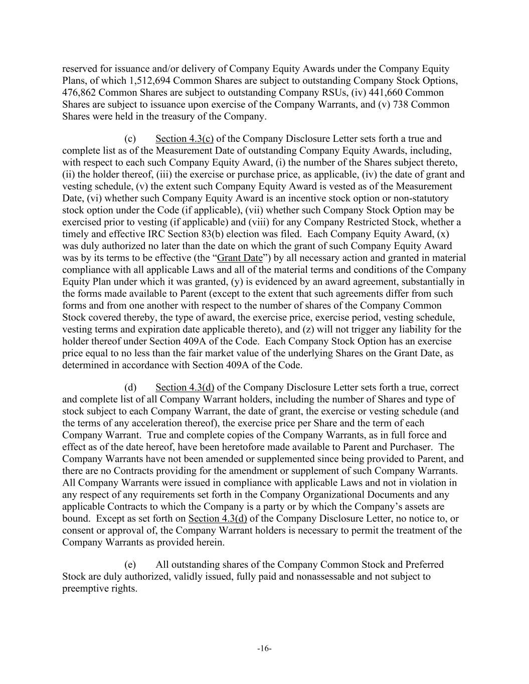 -16- reserved for issuance and/or delivery of Company Equity Awards under the Company Equity Plans, of which 1,512,694 Common Shares are subject to outstanding Company Stock Options, 476,862 Common Shares are subject to outstanding Company RSUs, (iv) 441,660 Common Shares are subject to issuance upon exercise of the Company Warrants, and (v) 738 Common Shares were held in the treasury of the Company. (c) Section 4.3(c) of the Company Disclosure Letter sets forth a true and complete list as of the Measurement Date of outstanding Company Equity Awards, including, with respect to each such Company Equity Award, (i) the number of the Shares subject thereto, (ii) the holder thereof, (iii) the exercise or purchase price, as applicable, (iv) the date of grant and vesting schedule, (v) the extent such Company Equity Award is vested as of the Measurement Date, (vi) whether such Company Equity Award is an incentive stock option or non-statutory stock option under the Code (if applicable), (vii) whether such Company Stock Option may be exercised prior to vesting (if applicable) and (viii) for any Company Restricted Stock, whether a timely and effective IRC Section 83(b) election was filed. Each Company Equity Award, (x) was duly authorized no later than the date on which the grant of such Company Equity Award was by its terms to be effective (the “Grant Date”) by all necessary action and granted in material compliance with all applicable Laws and all of the material terms and conditions of the Company Equity Plan under which it was granted, (y) is evidenced by an award agreement, substantially in the forms made available to Parent (except to the extent that such agreements differ from such forms and from one another with respect to the number of shares of the Company Common Stock covered thereby, the type of award, the exercise price, exercise period, vesting schedule, vesting terms and expiration date applicable thereto), and (z) will not trigger any liability for the holder thereof under Section 409A of the Code. Each Company Stock Option has an exercise price equal to no less than the fair market value of the underlying Shares on the Grant Date, as determined in accordance with Section 409A of the Code. (d) Section 4.3(d) of the Company Disclosure Letter sets forth a true, correct and complete list of all Company Warrant holders, including the number of Shares and type of stock subject to each Company Warrant, the date of grant, the exercise or vesting schedule (and the terms of any acceleration thereof), the exercise price per Share and the term of each Company Warrant. True and complete copies of the Company Warrants, as in full force and effect as of the date hereof, have been heretofore made available to Parent and Purchaser. The Company Warrants have not been amended or supplemented since being provided to Parent, and there are no Contracts providing for the amendment or supplement of such Company Warrants. All Company Warrants were issued in compliance with applicable Laws and not in violation in any respect of any requirements set forth in the Company Organizational Documents and any applicable Contracts to which the Company is a party or by which the Company’s assets are bound. Except as set forth on Section 4.3(d) of the Company Disclosure Letter, no notice to, or consent or approval of, the Company Warrant holders is necessary to permit the treatment of the Company Warrants as provided herein. (e) All outstanding shares of the Company Common Stock and Preferred Stock are duly authorized, validly issued, fully paid and nonassessable and not subject to preemptive rights.