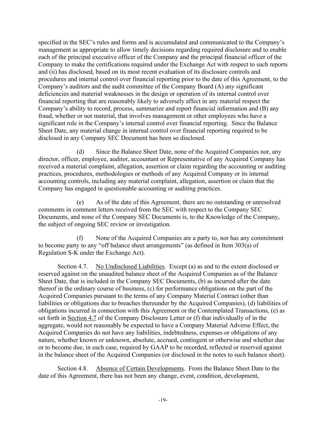 -19- specified in the SEC’s rules and forms and is accumulated and communicated to the Company’s management as appropriate to allow timely decisions regarding required disclosure and to enable each of the principal executive officer of the Company and the principal financial officer of the Company to make the certifications required under the Exchange Act with respect to such reports and (ii) has disclosed, based on its most recent evaluation of its disclosure controls and procedures and internal control over financial reporting prior to the date of this Agreement, to the Company’s auditors and the audit committee of the Company Board (A) any significant deficiencies and material weaknesses in the design or operation of its internal control over financial reporting that are reasonably likely to adversely affect in any material respect the Company’s ability to record, process, summarize and report financial information and (B) any fraud, whether or not material, that involves management or other employees who have a significant role in the Company’s internal control over financial reporting. Since the Balance Sheet Date, any material change in internal control over financial reporting required to be disclosed in any Company SEC Document has been so disclosed. (d) Since the Balance Sheet Date, none of the Acquired Companies nor, any director, officer, employee, auditor, accountant or Representative of any Acquired Company has received a material complaint, allegation, assertion or claim regarding the accounting or auditing practices, procedures, methodologies or methods of any Acquired Company or its internal accounting controls, including any material complaint, allegation, assertion or claim that the Company has engaged in questionable accounting or auditing practices. (e) As of the date of this Agreement, there are no outstanding or unresolved comments in comment letters received from the SEC with respect to the Company SEC Documents, and none of the Company SEC Documents is, to the Knowledge of the Company, the subject of ongoing SEC review or investigation. (f) None of the Acquired Companies are a party to, nor has any commitment to become party to any “off balance sheet arrangements” (as defined in Item 303(a) of Regulation S-K under the Exchange Act). Section 4.7. No Undisclosed Liabilities. Except (a) as and to the extent disclosed or reserved against on the unaudited balance sheet of the Acquired Companies as of the Balance Sheet Date, that is included in the Company SEC Documents, (b) as incurred after the date thereof in the ordinary course of business, (c) for performance obligations on the part of the Acquired Companies pursuant to the terms of any Company Material Contract (other than liabilities or obligations due to breaches thereunder by the Acquired Companies), (d) liabilities of obligations incurred in connection with this Agreement or the Contemplated Transactions, (e) as set forth in Section 4.7 of the Company Disclosure Letter or (f) that individually of in the aggregate, would not reasonably be expected to have a Company Material Adverse Effect, the Acquired Companies do not have any liabilities, indebtedness, expenses or obligations of any nature, whether known or unknown, absolute, accrued, contingent or otherwise and whether due or to become due, in each case, required by GAAP to be recorded, reflected or reserved against in the balance sheet of the Acquired Companies (or disclosed in the notes to such balance sheet). Section 4.8. Absence of Certain Developments. From the Balance Sheet Date to the date of this Agreement, there has not been any change, event, condition, development,