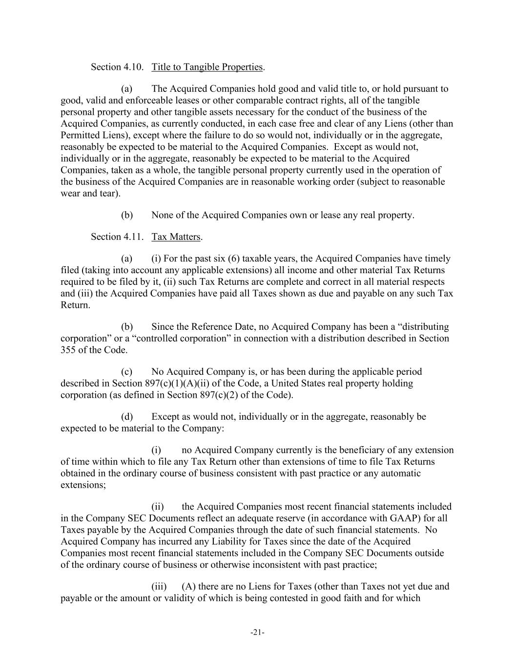 -21- Section 4.10. Title to Tangible Properties. (a) The Acquired Companies hold good and valid title to, or hold pursuant to good, valid and enforceable leases or other comparable contract rights, all of the tangible personal property and other tangible assets necessary for the conduct of the business of the Acquired Companies, as currently conducted, in each case free and clear of any Liens (other than Permitted Liens), except where the failure to do so would not, individually or in the aggregate, reasonably be expected to be material to the Acquired Companies. Except as would not, individually or in the aggregate, reasonably be expected to be material to the Acquired Companies, taken as a whole, the tangible personal property currently used in the operation of the business of the Acquired Companies are in reasonable working order (subject to reasonable wear and tear). (b) None of the Acquired Companies own or lease any real property. Section 4.11. Tax Matters. (a) (i) For the past six (6) taxable years, the Acquired Companies have timely filed (taking into account any applicable extensions) all income and other material Tax Returns required to be filed by it, (ii) such Tax Returns are complete and correct in all material respects and (iii) the Acquired Companies have paid all Taxes shown as due and payable on any such Tax Return. (b) Since the Reference Date, no Acquired Company has been a “distributing corporation” or a “controlled corporation” in connection with a distribution described in Section 355 of the Code. (c) No Acquired Company is, or has been during the applicable period described in Section 897(c)(1)(A)(ii) of the Code, a United States real property holding corporation (as defined in Section 897(c)(2) of the Code). (d) Except as would not, individually or in the aggregate, reasonably be expected to be material to the Company: (i) no Acquired Company currently is the beneficiary of any extension of time within which to file any Tax Return other than extensions of time to file Tax Returns obtained in the ordinary course of business consistent with past practice or any automatic extensions; (ii) the Acquired Companies most recent financial statements included in the Company SEC Documents reflect an adequate reserve (in accordance with GAAP) for all Taxes payable by the Acquired Companies through the date of such financial statements. No Acquired Company has incurred any Liability for Taxes since the date of the Acquired Companies most recent financial statements included in the Company SEC Documents outside of the ordinary course of business or otherwise inconsistent with past practice; (iii) (A) there are no Liens for Taxes (other than Taxes not yet due and payable or the amount or validity of which is being contested in good faith and for which
