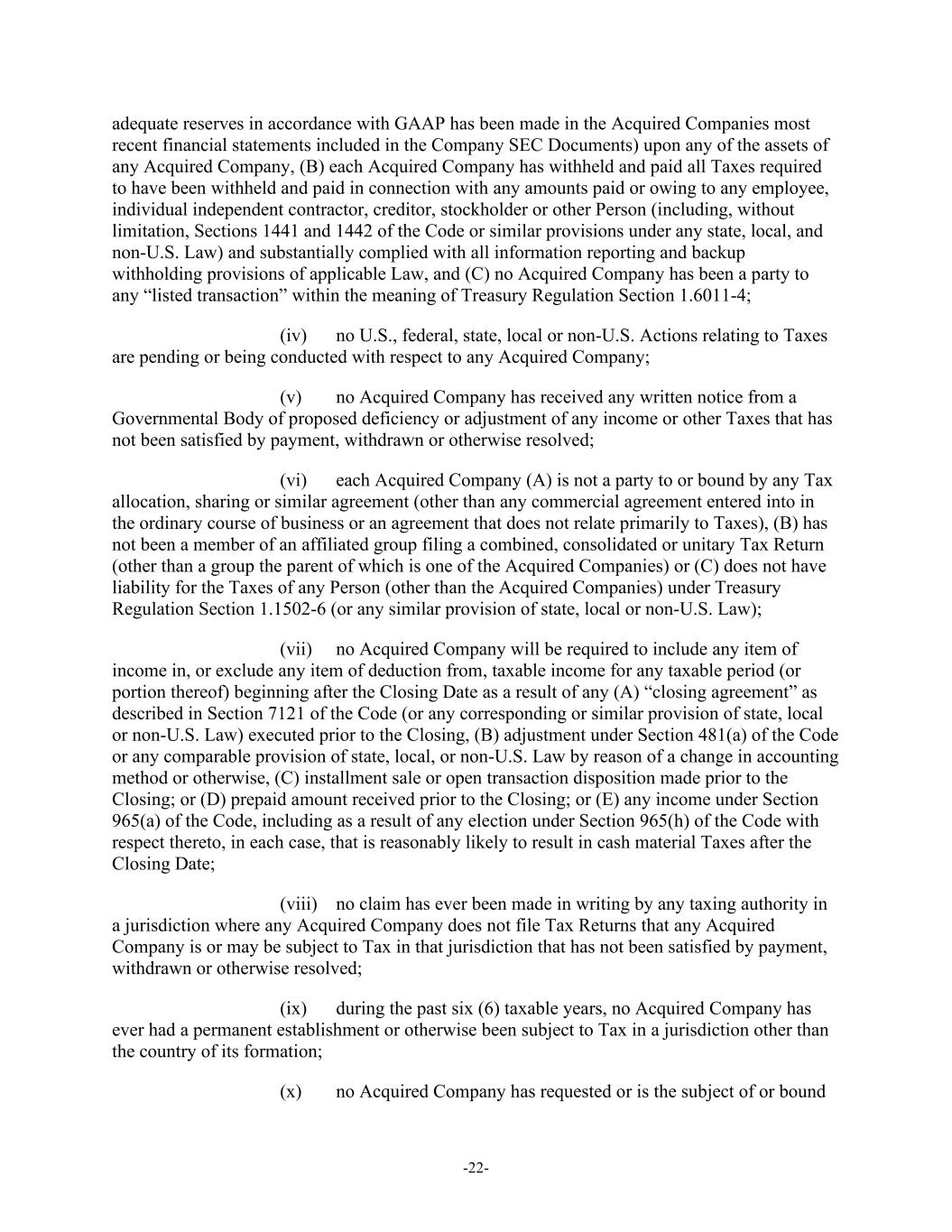 -22- adequate reserves in accordance with GAAP has been made in the Acquired Companies most recent financial statements included in the Company SEC Documents) upon any of the assets of any Acquired Company, (B) each Acquired Company has withheld and paid all Taxes required to have been withheld and paid in connection with any amounts paid or owing to any employee, individual independent contractor, creditor, stockholder or other Person (including, without limitation, Sections 1441 and 1442 of the Code or similar provisions under any state, local, and non-U.S. Law) and substantially complied with all information reporting and backup withholding provisions of applicable Law, and (C) no Acquired Company has been a party to any “listed transaction” within the meaning of Treasury Regulation Section 1.6011-4; (iv) no U.S., federal, state, local or non-U.S. Actions relating to Taxes are pending or being conducted with respect to any Acquired Company; (v) no Acquired Company has received any written notice from a Governmental Body of proposed deficiency or adjustment of any income or other Taxes that has not been satisfied by payment, withdrawn or otherwise resolved; (vi) each Acquired Company (A) is not a party to or bound by any Tax allocation, sharing or similar agreement (other than any commercial agreement entered into in the ordinary course of business or an agreement that does not relate primarily to Taxes), (B) has not been a member of an affiliated group filing a combined, consolidated or unitary Tax Return (other than a group the parent of which is one of the Acquired Companies) or (C) does not have liability for the Taxes of any Person (other than the Acquired Companies) under Treasury Regulation Section 1.1502-6 (or any similar provision of state, local or non-U.S. Law); (vii) no Acquired Company will be required to include any item of income in, or exclude any item of deduction from, taxable income for any taxable period (or portion thereof) beginning after the Closing Date as a result of any (A) “closing agreement” as described in Section 7121 of the Code (or any corresponding or similar provision of state, local or non-U.S. Law) executed prior to the Closing, (B) adjustment under Section 481(a) of the Code or any comparable provision of state, local, or non-U.S. Law by reason of a change in accounting method or otherwise, (C) installment sale or open transaction disposition made prior to the Closing; or (D) prepaid amount received prior to the Closing; or (E) any income under Section 965(a) of the Code, including as a result of any election under Section 965(h) of the Code with respect thereto, in each case, that is reasonably likely to result in cash material Taxes after the Closing Date; (viii) no claim has ever been made in writing by any taxing authority in a jurisdiction where any Acquired Company does not file Tax Returns that any Acquired Company is or may be subject to Tax in that jurisdiction that has not been satisfied by payment, withdrawn or otherwise resolved; (ix) during the past six (6) taxable years, no Acquired Company has ever had a permanent establishment or otherwise been subject to Tax in a jurisdiction other than the country of its formation; (x) no Acquired Company has requested or is the subject of or bound
