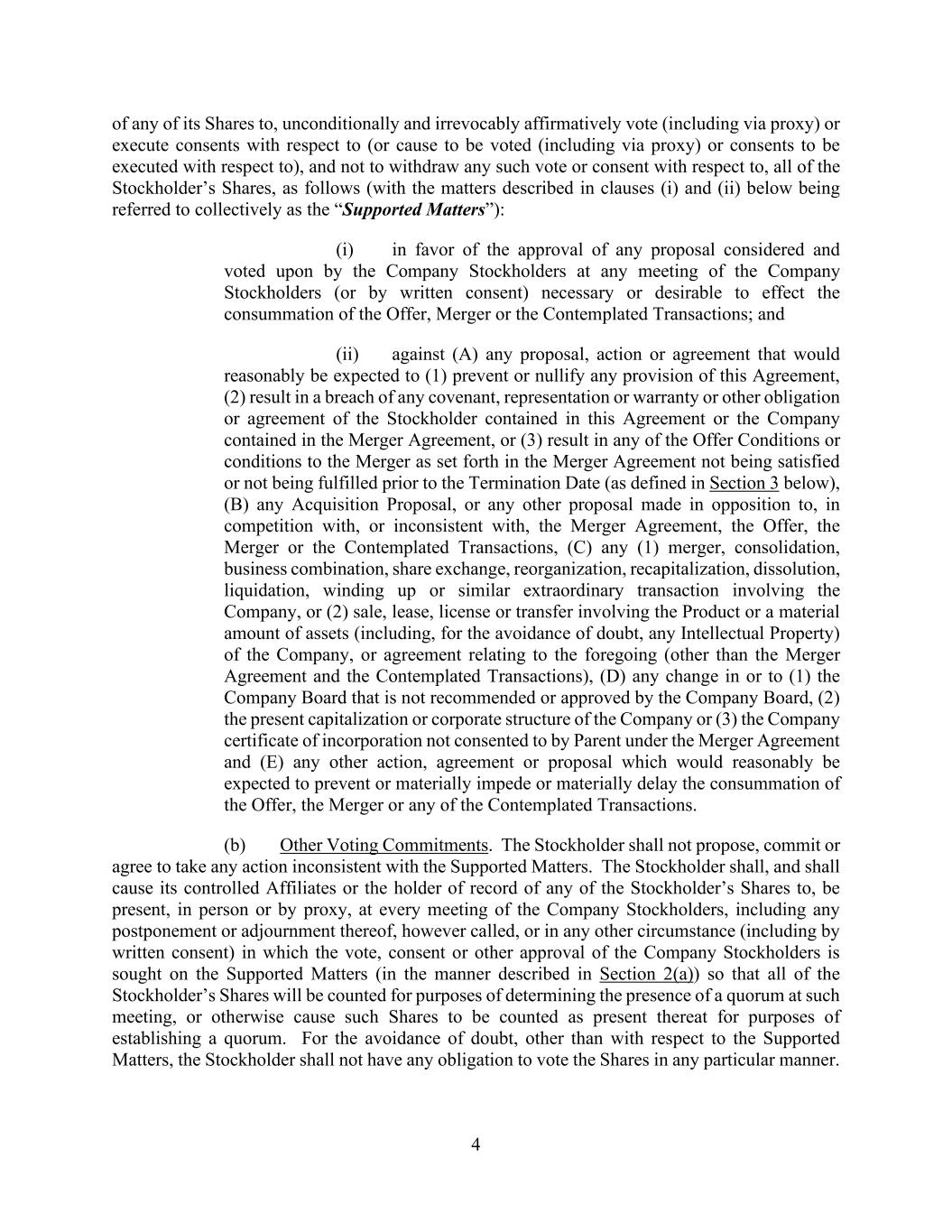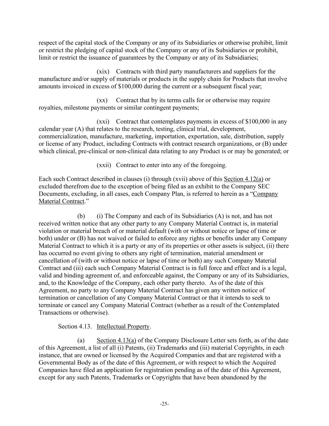 -25- respect of the capital stock of the Company or any of its Subsidiaries or otherwise prohibit, limit or restrict the pledging of capital stock of the Company or any of its Subsidiaries or prohibit, limit or restrict the issuance of guarantees by the Company or any of its Subsidiaries; (xix) Contracts with third party manufacturers and suppliers for the manufacture and/or supply of materials or products in the supply chain for Products that involve amounts invoiced in excess of $100,000 during the current or a subsequent fiscal year; (xx) Contract that by its terms calls for or otherwise may require royalties, milestone payments or similar contingent payments; (xxi) Contract that contemplates payments in excess of $100,000 in any calendar year (A) that relates to the research, testing, clinical trial, development, commercialization, manufacture, marketing, importation, exportation, sale, distribution, supply or license of any Product, including Contracts with contract research organizations, or (B) under which clinical, pre-clinical or non-clinical data relating to any Product is or may be generated; or (xxii) Contract to enter into any of the foregoing. Each such Contract described in clauses (i) through (xvii) above of this Section 4.12(a) or excluded therefrom due to the exception of being filed as an exhibit to the Company SEC Documents, excluding, in all cases, each Company Plan, is referred to herein as a “Company Material Contract.” (b) (i) The Company and each of its Subsidiaries (A) is not, and has not received written notice that any other party to any Company Material Contract is, in material violation or material breach of or material default (with or without notice or lapse of time or both) under or (B) has not waived or failed to enforce any rights or benefits under any Company Material Contract to which it is a party or any of its properties or other assets is subject, (ii) there has occurred no event giving to others any right of termination, material amendment or cancellation of (with or without notice or lapse of time or both) any such Company Material Contract and (iii) each such Company Material Contract is in full force and effect and is a legal, valid and binding agreement of, and enforceable against, the Company or any of its Subsidiaries, and, to the Knowledge of the Company, each other party thereto. As of the date of this Agreement, no party to any Company Material Contract has given any written notice of termination or cancellation of any Company Material Contract or that it intends to seek to terminate or cancel any Company Material Contract (whether as a result of the Contemplated Transactions or otherwise). Section 4.13. Intellectual Property. (a) Section 4.13(a) of the Company Disclosure Letter sets forth, as of the date of this Agreement, a list of all (i) Patents, (ii) Trademarks and (iii) material Copyrights, in each instance, that are owned or licensed by the Acquired Companies and that are registered with a Governmental Body as of the date of this Agreement, or with respect to which the Acquired Companies have filed an application for registration pending as of the date of this Agreement, except for any such Patents, Trademarks or Copyrights that have been abandoned by the