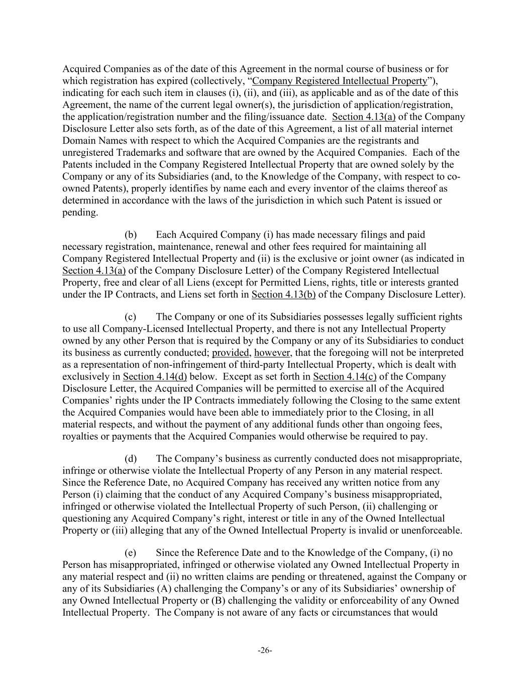 -26- Acquired Companies as of the date of this Agreement in the normal course of business or for which registration has expired (collectively, “Company Registered Intellectual Property”), indicating for each such item in clauses (i), (ii), and (iii), as applicable and as of the date of this Agreement, the name of the current legal owner(s), the jurisdiction of application/registration, the application/registration number and the filing/issuance date. Section 4.13(a) of the Company Disclosure Letter also sets forth, as of the date of this Agreement, a list of all material internet Domain Names with respect to which the Acquired Companies are the registrants and unregistered Trademarks and software that are owned by the Acquired Companies. Each of the Patents included in the Company Registered Intellectual Property that are owned solely by the Company or any of its Subsidiaries (and, to the Knowledge of the Company, with respect to co- owned Patents), properly identifies by name each and every inventor of the claims thereof as determined in accordance with the laws of the jurisdiction in which such Patent is issued or pending. (b) Each Acquired Company (i) has made necessary filings and paid necessary registration, maintenance, renewal and other fees required for maintaining all Company Registered Intellectual Property and (ii) is the exclusive or joint owner (as indicated in Section 4.13(a) of the Company Disclosure Letter) of the Company Registered Intellectual Property, free and clear of all Liens (except for Permitted Liens, rights, title or interests granted under the IP Contracts, and Liens set forth in Section 4.13(b) of the Company Disclosure Letter). (c) The Company or one of its Subsidiaries possesses legally sufficient rights to use all Company-Licensed Intellectual Property, and there is not any Intellectual Property owned by any other Person that is required by the Company or any of its Subsidiaries to conduct its business as currently conducted; provided, however, that the foregoing will not be interpreted as a representation of non-infringement of third-party Intellectual Property, which is dealt with exclusively in Section 4.14(d) below. Except as set forth in Section 4.14(c) of the Company Disclosure Letter, the Acquired Companies will be permitted to exercise all of the Acquired Companies’ rights under the IP Contracts immediately following the Closing to the same extent the Acquired Companies would have been able to immediately prior to the Closing, in all material respects, and without the payment of any additional funds other than ongoing fees, royalties or payments that the Acquired Companies would otherwise be required to pay. (d) The Company’s business as currently conducted does not misappropriate, infringe or otherwise violate the Intellectual Property of any Person in any material respect. Since the Reference Date, no Acquired Company has received any written notice from any Person (i) claiming that the conduct of any Acquired Company’s business misappropriated, infringed or otherwise violated the Intellectual Property of such Person, (ii) challenging or questioning any Acquired Company’s right, interest or title in any of the Owned Intellectual Property or (iii) alleging that any of the Owned Intellectual Property is invalid or unenforceable. (e) Since the Reference Date and to the Knowledge of the Company, (i) no Person has misappropriated, infringed or otherwise violated any Owned Intellectual Property in any material respect and (ii) no written claims are pending or threatened, against the Company or any of its Subsidiaries (A) challenging the Company’s or any of its Subsidiaries’ ownership of any Owned Intellectual Property or (B) challenging the validity or enforceability of any Owned Intellectual Property. The Company is not aware of any facts or circumstances that would