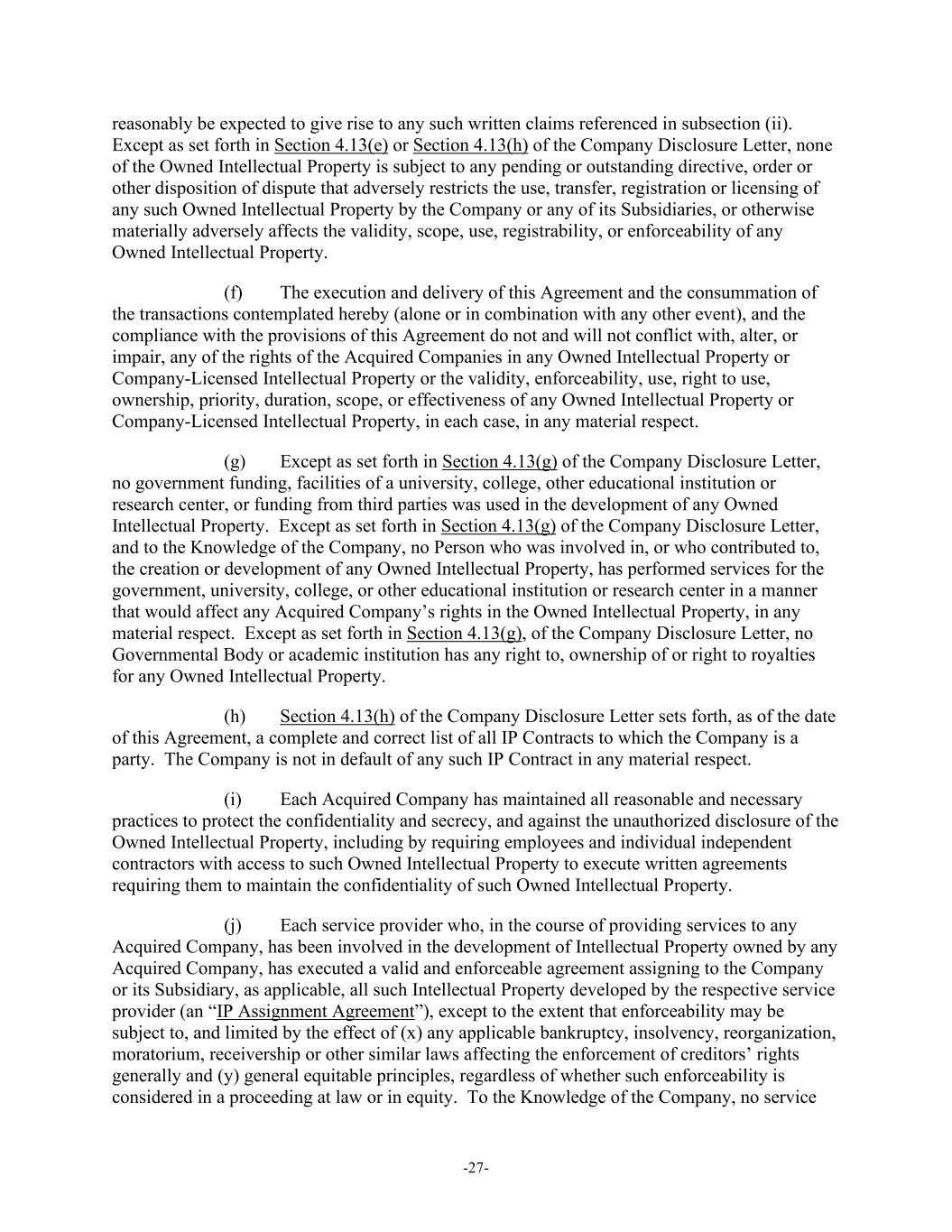 -27- reasonably be expected to give rise to any such written claims referenced in subsection (ii). Except as set forth in Section 4.13(e) or Section 4.13(h) of the Company Disclosure Letter, none of the Owned Intellectual Property is subject to any pending or outstanding directive, order or other disposition of dispute that adversely restricts the use, transfer, registration or licensing of any such Owned Intellectual Property by the Company or any of its Subsidiaries, or otherwise materially adversely affects the validity, scope, use, registrability, or enforceability of any Owned Intellectual Property. (f) The execution and delivery of this Agreement and the consummation of the transactions contemplated hereby (alone or in combination with any other event), and the compliance with the provisions of this Agreement do not and will not conflict with, alter, or impair, any of the rights of the Acquired Companies in any Owned Intellectual Property or Company-Licensed Intellectual Property or the validity, enforceability, use, right to use, ownership, priority, duration, scope, or effectiveness of any Owned Intellectual Property or Company-Licensed Intellectual Property, in each case, in any material respect. (g) Except as set forth in Section 4.13(g) of the Company Disclosure Letter, no government funding, facilities of a university, college, other educational institution or research center, or funding from third parties was used in the development of any Owned Intellectual Property. Except as set forth in Section 4.13(g) of the Company Disclosure Letter, and to the Knowledge of the Company, no Person who was involved in, or who contributed to, the creation or development of any Owned Intellectual Property, has performed services for the government, university, college, or other educational institution or research center in a manner that would affect any Acquired Company’s rights in the Owned Intellectual Property, in any material respect. Except as set forth in Section 4.13(g), of the Company Disclosure Letter, no Governmental Body or academic institution has any right to, ownership of or right to royalties for any Owned Intellectual Property. (h) Section 4.13(h) of the Company Disclosure Letter sets forth, as of the date of this Agreement, a complete and correct list of all IP Contracts to which the Company is a party. The Company is not in default of any such IP Contract in any material respect. (i) Each Acquired Company has maintained all reasonable and necessary practices to protect the confidentiality and secrecy, and against the unauthorized disclosure of the Owned Intellectual Property, including by requiring employees and individual independent contractors with access to such Owned Intellectual Property to execute written agreements requiring them to maintain the confidentiality of such Owned Intellectual Property. (j) Each service provider who, in the course of providing services to any Acquired Company, has been involved in the development of Intellectual Property owned by any Acquired Company, has executed a valid and enforceable agreement assigning to the Company or its Subsidiary, as applicable, all such Intellectual Property developed by the respective service provider (an “IP Assignment Agreement”), except to the extent that enforceability may be subject to, and limited by the effect of (x) any applicable bankruptcy, insolvency, reorganization, moratorium, receivership or other similar laws affecting the enforcement of creditors’ rights generally and (y) general equitable principles, regardless of whether such enforceability is considered in a proceeding at law or in equity. To the Knowledge of the Company, no service