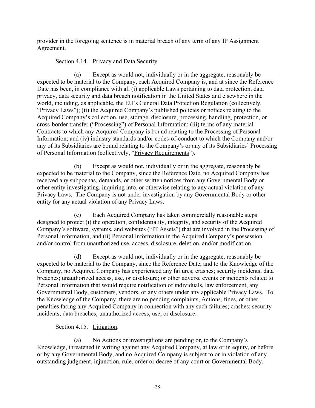 -28- provider in the foregoing sentence is in material breach of any term of any IP Assignment Agreement. Section 4.14. Privacy and Data Security. (a) Except as would not, individually or in the aggregate, reasonably be expected to be material to the Company, each Acquired Company is, and at since the Reference Date has been, in compliance with all (i) applicable Laws pertaining to data protection, data privacy, data security and data breach notification in the United States and elsewhere in the world, including, as applicable, the EU’s General Data Protection Regulation (collectively, “Privacy Laws”); (ii) the Acquired Company’s published policies or notices relating to the Acquired Company’s collection, use, storage, disclosure, processing, handling, protection, or cross-border transfer (“Processing”) of Personal Information; (iii) terms of any material Contracts to which any Acquired Company is bound relating to the Processing of Personal Information; and (iv) industry standards and/or codes-of-conduct to which the Company and/or any of its Subsidiaries are bound relating to the Company’s or any of its Subsidiaries’ Processing of Personal Information (collectively, “Privacy Requirements”). (b) Except as would not, individually or in the aggregate, reasonably be expected to be material to the Company, since the Reference Date, no Acquired Company has received any subpoenas, demands, or other written notices from any Governmental Body or other entity investigating, inquiring into, or otherwise relating to any actual violation of any Privacy Laws. The Company is not under investigation by any Governmental Body or other entity for any actual violation of any Privacy Laws. (c) Each Acquired Company has taken commercially reasonable steps designed to protect (i) the operation, confidentiality, integrity, and security of the Acquired Company’s software, systems, and websites (“IT Assets”) that are involved in the Processing of Personal Information, and (ii) Personal Information in the Acquired Company’s possession and/or control from unauthorized use, access, disclosure, deletion, and/or modification. (d) Except as would not, individually or in the aggregate, reasonably be expected to be material to the Company, since the Reference Date, and to the Knowledge of the Company, no Acquired Company has experienced any failures; crashes; security incidents; data breaches; unauthorized access, use, or disclosure; or other adverse events or incidents related to Personal Information that would require notification of individuals, law enforcement, any Governmental Body, customers, vendors, or any others under any applicable Privacy Laws. To the Knowledge of the Company, there are no pending complaints, Actions, fines, or other penalties facing any Acquired Company in connection with any such failures; crashes; security incidents; data breaches; unauthorized access, use, or disclosure. Section 4.15. Litigation. (a) No Actions or investigations are pending or, to the Company’s Knowledge, threatened in writing against any Acquired Company, at law or in equity, or before or by any Governmental Body, and no Acquired Company is subject to or in violation of any outstanding judgment, injunction, rule, order or decree of any court or Governmental Body,