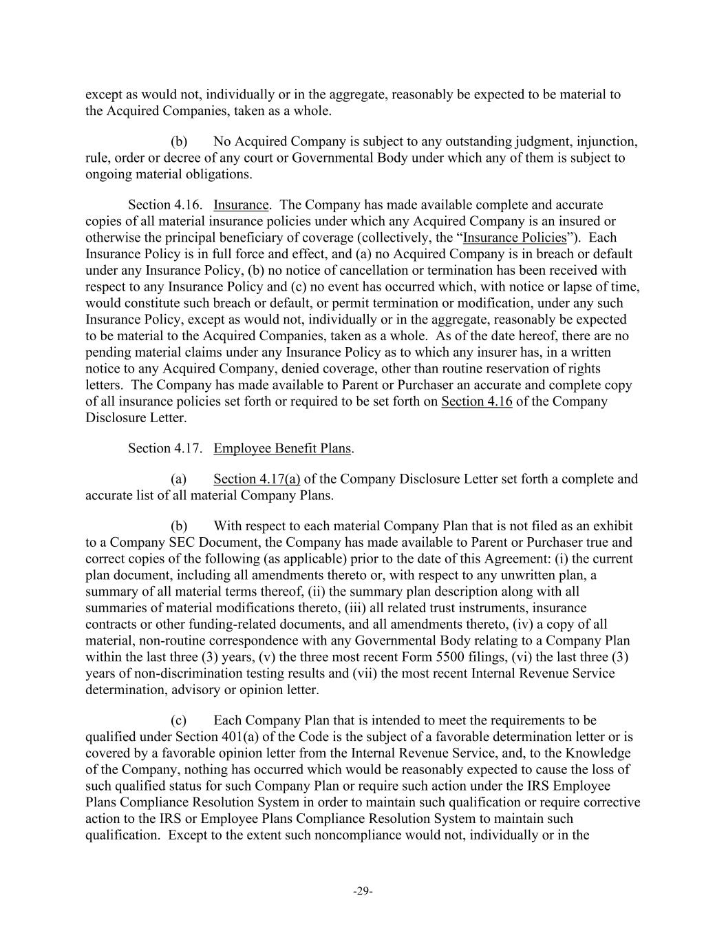 -29- except as would not, individually or in the aggregate, reasonably be expected to be material to the Acquired Companies, taken as a whole. (b) No Acquired Company is subject to any outstanding judgment, injunction, rule, order or decree of any court or Governmental Body under which any of them is subject to ongoing material obligations. Section 4.16. Insurance. The Company has made available complete and accurate copies of all material insurance policies under which any Acquired Company is an insured or otherwise the principal beneficiary of coverage (collectively, the “Insurance Policies”). Each Insurance Policy is in full force and effect, and (a) no Acquired Company is in breach or default under any Insurance Policy, (b) no notice of cancellation or termination has been received with respect to any Insurance Policy and (c) no event has occurred which, with notice or lapse of time, would constitute such breach or default, or permit termination or modification, under any such Insurance Policy, except as would not, individually or in the aggregate, reasonably be expected to be material to the Acquired Companies, taken as a whole. As of the date hereof, there are no pending material claims under any Insurance Policy as to which any insurer has, in a written notice to any Acquired Company, denied coverage, other than routine reservation of rights letters. The Company has made available to Parent or Purchaser an accurate and complete copy of all insurance policies set forth or required to be set forth on Section 4.16 of the Company Disclosure Letter. Section 4.17. Employee Benefit Plans. (a) Section 4.17(a) of the Company Disclosure Letter set forth a complete and accurate list of all material Company Plans. (b) With respect to each material Company Plan that is not filed as an exhibit to a Company SEC Document, the Company has made available to Parent or Purchaser true and correct copies of the following (as applicable) prior to the date of this Agreement: (i) the current plan document, including all amendments thereto or, with respect to any unwritten plan, a summary of all material terms thereof, (ii) the summary plan description along with all summaries of material modifications thereto, (iii) all related trust instruments, insurance contracts or other funding-related documents, and all amendments thereto, (iv) a copy of all material, non-routine correspondence with any Governmental Body relating to a Company Plan within the last three (3) years, (v) the three most recent Form 5500 filings, (vi) the last three (3) years of non-discrimination testing results and (vii) the most recent Internal Revenue Service determination, advisory or opinion letter. (c) Each Company Plan that is intended to meet the requirements to be qualified under Section 401(a) of the Code is the subject of a favorable determination letter or is covered by a favorable opinion letter from the Internal Revenue Service, and, to the Knowledge of the Company, nothing has occurred which would be reasonably expected to cause the loss of such qualified status for such Company Plan or require such action under the IRS Employee Plans Compliance Resolution System in order to maintain such qualification or require corrective action to the IRS or Employee Plans Compliance Resolution System to maintain such qualification. Except to the extent such noncompliance would not, individually or in the