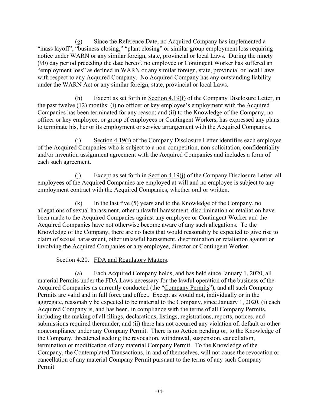 -34- (g) Since the Reference Date, no Acquired Company has implemented a “mass layoff”, “business closing,” “plant closing” or similar group employment loss requiring notice under WARN or any similar foreign, state, provincial or local Laws. During the ninety (90) day period preceding the date hereof, no employee or Contingent Worker has suffered an “employment loss” as defined in WARN or any similar foreign, state, provincial or local Laws with respect to any Acquired Company. No Acquired Company has any outstanding liability under the WARN Act or any similar foreign, state, provincial or local Laws. (h) Except as set forth in Section 4.19(f) of the Company Disclosure Letter, in the past twelve (12) months: (i) no officer or key employee’s employment with the Acquired Companies has been terminated for any reason; and (ii) to the Knowledge of the Company, no officer or key employee, or group of employees or Contingent Workers, has expressed any plans to terminate his, her or its employment or service arrangement with the Acquired Companies. (i) Section 4.19(i) of the Company Disclosure Letter identifies each employee of the Acquired Companies who is subject to a non-competition, non-solicitation, confidentiality and/or invention assignment agreement with the Acquired Companies and includes a form of each such agreement. (j) Except as set forth in Section 4.19(j) of the Company Disclosure Letter, all employees of the Acquired Companies are employed at-will and no employee is subject to any employment contract with the Acquired Companies, whether oral or written. (k) In the last five (5) years and to the Knowledge of the Company, no allegations of sexual harassment, other unlawful harassment, discrimination or retaliation have been made to the Acquired Companies against any employee or Contingent Worker and the Acquired Companies have not otherwise become aware of any such allegations. To the Knowledge of the Company, there are no facts that would reasonably be expected to give rise to claim of sexual harassment, other unlawful harassment, discrimination or retaliation against or involving the Acquired Companies or any employee, director or Contingent Worker. Section 4.20. FDA and Regulatory Matters. (a) Each Acquired Company holds, and has held since January 1, 2020, all material Permits under the FDA Laws necessary for the lawful operation of the business of the Acquired Companies as currently conducted (the “Company Permits”), and all such Company Permits are valid and in full force and effect. Except as would not, individually or in the aggregate, reasonably be expected to be material to the Company, since January 1, 2020, (i) each Acquired Company is, and has been, in compliance with the terms of all Company Permits, including the making of all filings, declarations, listings, registrations, reports, notices, and submissions required thereunder, and (ii) there has not occurred any violation of, default or other noncompliance under any Company Permit. There is no Action pending or, to the Knowledge of the Company, threatened seeking the revocation, withdrawal, suspension, cancellation, termination or modification of any material Company Permit. To the Knowledge of the Company, the Contemplated Transactions, in and of themselves, will not cause the revocation or cancellation of any material Company Permit pursuant to the terms of any such Company Permit.