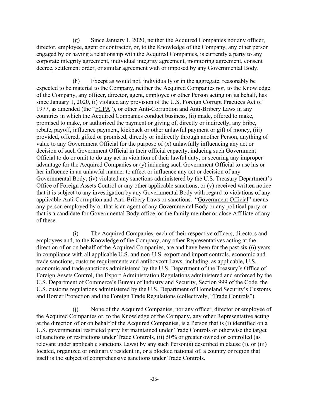 -36- (g) Since January 1, 2020, neither the Acquired Companies nor any officer, director, employee, agent or contractor, or, to the Knowledge of the Company, any other person engaged by or having a relationship with the Acquired Companies, is currently a party to any corporate integrity agreement, individual integrity agreement, monitoring agreement, consent decree, settlement order, or similar agreement with or imposed by any Governmental Body. (h) Except as would not, individually or in the aggregate, reasonably be expected to be material to the Company, neither the Acquired Companies nor, to the Knowledge of the Company, any officer, director, agent, employee or other Person acting on its behalf, has since January 1, 2020, (i) violated any provision of the U.S. Foreign Corrupt Practices Act of 1977, as amended (the “FCPA”), or other Anti-Corruption and Anti-Bribery Laws in any countries in which the Acquired Companies conduct business, (ii) made, offered to make, promised to make, or authorized the payment or giving of, directly or indirectly, any bribe, rebate, payoff, influence payment, kickback or other unlawful payment or gift of money, (iii) provided, offered, gifted or promised, directly or indirectly through another Person, anything of value to any Government Official for the purpose of (x) unlawfully influencing any act or decision of such Government Official in their official capacity, inducing such Government Official to do or omit to do any act in violation of their lawful duty, or securing any improper advantage for the Acquired Companies or (y) inducing such Government Official to use his or her influence in an unlawful manner to affect or influence any act or decision of any Governmental Body, (iv) violated any sanctions administered by the U.S. Treasury Department’s Office of Foreign Assets Control or any other applicable sanctions, or (v) received written notice that it is subject to any investigation by any Governmental Body with regard to violations of any applicable Anti-Corruption and Anti-Bribery Laws or sanctions. “Government Official” means any person employed by or that is an agent of any Governmental Body or any political party or that is a candidate for Governmental Body office, or the family member or close Affiliate of any of these. (i) The Acquired Companies, each of their respective officers, directors and employees and, to the Knowledge of the Company, any other Representatives acting at the direction of or on behalf of the Acquired Companies, are and have been for the past six (6) years in compliance with all applicable U.S. and non-U.S. export and import controls, economic and trade sanctions, customs requirements and antiboycott Laws, including, as applicable, U.S. economic and trade sanctions administered by the U.S. Department of the Treasury’s Office of Foreign Assets Control, the Export Administration Regulations administered and enforced by the U.S. Department of Commerce’s Bureau of Industry and Security, Section 999 of the Code, the U.S. customs regulations administered by the U.S. Department of Homeland Security’s Customs and Border Protection and the Foreign Trade Regulations (collectively, “Trade Controls”). (j) None of the Acquired Companies, nor any officer, director or employee of the Acquired Companies or, to the Knowledge of the Company, any other Representative acting at the direction of or on behalf of the Acquired Companies, is a Person that is (i) identified on a U.S. governmental restricted party list maintained under Trade Controls or otherwise the target of sanctions or restrictions under Trade Controls, (ii) 50% or greater owned or controlled (as relevant under applicable sanctions Laws) by any such Person(s) described in clause (i), or (iii) located, organized or ordinarily resident in, or a blocked national of, a country or region that itself is the subject of comprehensive sanctions under Trade Controls.
