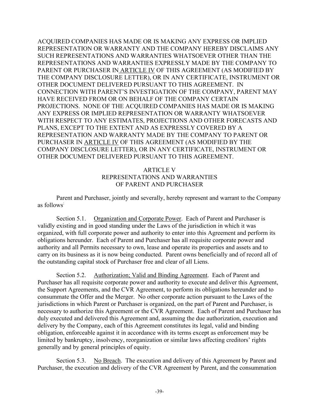 -39- ACQUIRED COMPANIES HAS MADE OR IS MAKING ANY EXPRESS OR IMPLIED REPRESENTATION OR WARRANTY AND THE COMPANY HEREBY DISCLAIMS ANY SUCH REPRESENTATIONS AND WARRANTIES WHATSOEVER OTHER THAN THE REPRESENTATIONS AND WARRANTIES EXPRESSLY MADE BY THE COMPANY TO PARENT OR PURCHASER IN ARTICLE IV OF THIS AGREEMENT (AS MODIFIED BY THE COMPANY DISCLOSURE LETTER), OR IN ANY CERTIFICATE, INSTRUMENT OR OTHER DOCUMENT DELIVERED PURSUANT TO THIS AGREEMENT. IN CONNECTION WITH PARENT’S INVESTIGATION OF THE COMPANY, PARENT MAY HAVE RECEIVED FROM OR ON BEHALF OF THE COMPANY CERTAIN PROJECTIONS. NONE OF THE ACQUIRED COMPANIES HAS MADE OR IS MAKING ANY EXPRESS OR IMPLIED REPRESENTATION OR WARRANTY WHATSOEVER WITH RESPECT TO ANY ESTIMATES, PROJECTIONS AND OTHER FORECASTS AND PLANS, EXCEPT TO THE EXTENT AND AS EXPRESSLY COVERED BY A REPRESENTATION AND WARRANTY MADE BY THE COMPANY TO PARENT OR PURCHASER IN ARTICLE IV OF THIS AGREEMENT (AS MODIFIED BY THE COMPANY DISCLOSURE LETTER), OR IN ANY CERTIFICATE, INSTRUMENT OR OTHER DOCUMENT DELIVERED PURSUANT TO THIS AGREEMENT. ARTICLE V REPRESENTATIONS AND WARRANTIES OF PARENT AND PURCHASER Parent and Purchaser, jointly and severally, hereby represent and warrant to the Company as follows: Section 5.1. Organization and Corporate Power. Each of Parent and Purchaser is validly existing and in good standing under the Laws of the jurisdiction in which it was organized, with full corporate power and authority to enter into this Agreement and perform its obligations hereunder. Each of Parent and Purchaser has all requisite corporate power and authority and all Permits necessary to own, lease and operate its properties and assets and to carry on its business as it is now being conducted. Parent owns beneficially and of record all of the outstanding capital stock of Purchaser free and clear of all Liens. Section 5.2. Authorization; Valid and Binding Agreement. Each of Parent and Purchaser has all requisite corporate power and authority to execute and deliver this Agreement, the Support Agreements, and the CVR Agreement, to perform its obligations hereunder and to consummate the Offer and the Merger. No other corporate action pursuant to the Laws of the jurisdictions in which Parent or Purchaser is organized, on the part of Parent and Purchaser, is necessary to authorize this Agreement or the CVR Agreement. Each of Parent and Purchaser has duly executed and delivered this Agreement and, assuming the due authorization, execution and delivery by the Company, each of this Agreement constitutes its legal, valid and binding obligation, enforceable against it in accordance with its terms except as enforcement may be limited by bankruptcy, insolvency, reorganization or similar laws affecting creditors’ rights generally and by general principles of equity. Section 5.3. No Breach. The execution and delivery of this Agreement by Parent and Purchaser, the execution and delivery of the CVR Agreement by Parent, and the consummation