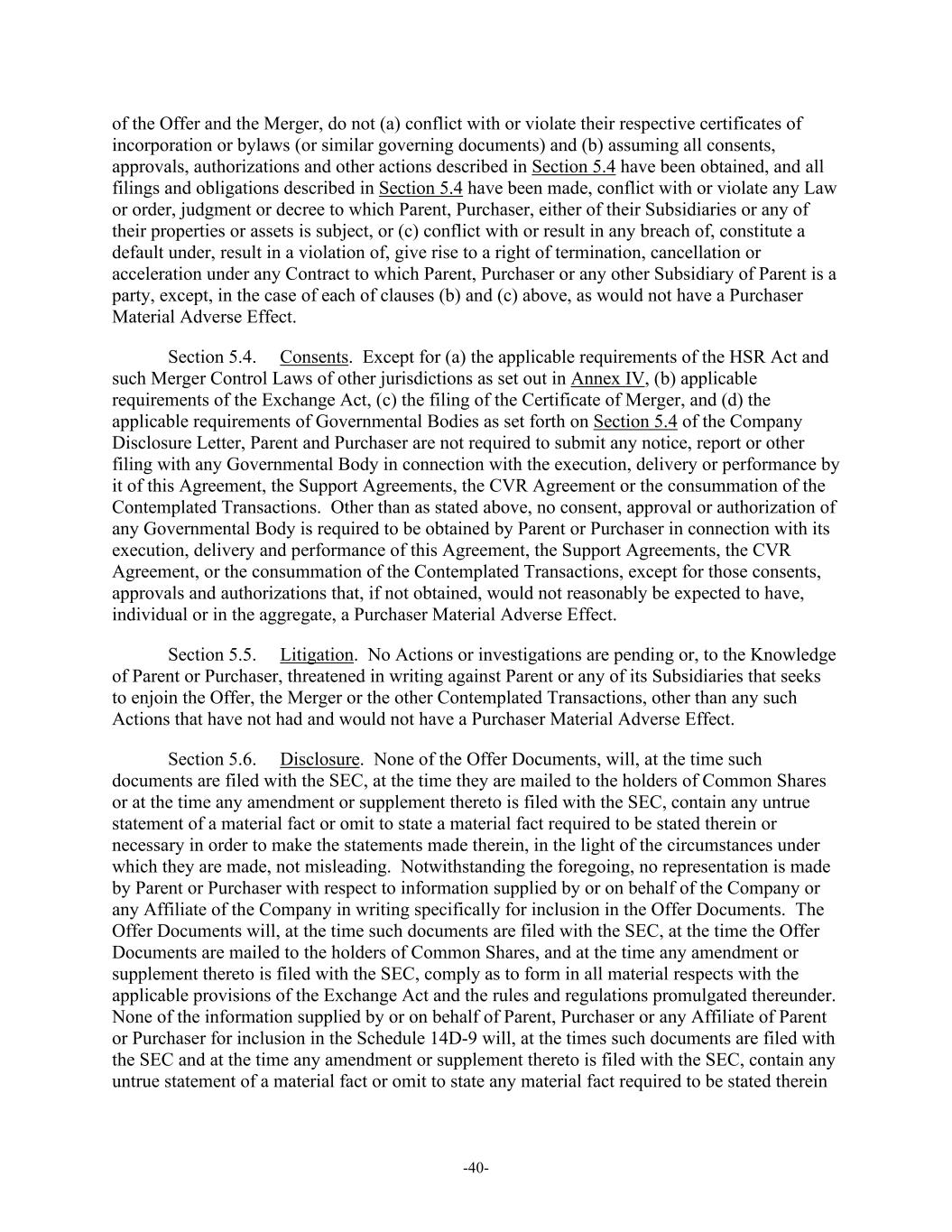 -40- of the Offer and the Merger, do not (a) conflict with or violate their respective certificates of incorporation or bylaws (or similar governing documents) and (b) assuming all consents, approvals, authorizations and other actions described in Section 5.4 have been obtained, and all filings and obligations described in Section 5.4 have been made, conflict with or violate any Law or order, judgment or decree to which Parent, Purchaser, either of their Subsidiaries or any of their properties or assets is subject, or (c) conflict with or result in any breach of, constitute a default under, result in a violation of, give rise to a right of termination, cancellation or acceleration under any Contract to which Parent, Purchaser or any other Subsidiary of Parent is a party, except, in the case of each of clauses (b) and (c) above, as would not have a Purchaser Material Adverse Effect. Section 5.4. Consents. Except for (a) the applicable requirements of the HSR Act and such Merger Control Laws of other jurisdictions as set out in Annex IV, (b) applicable requirements of the Exchange Act, (c) the filing of the Certificate of Merger, and (d) the applicable requirements of Governmental Bodies as set forth on Section 5.4 of the Company Disclosure Letter, Parent and Purchaser are not required to submit any notice, report or other filing with any Governmental Body in connection with the execution, delivery or performance by it of this Agreement, the Support Agreements, the CVR Agreement or the consummation of the Contemplated Transactions. Other than as stated above, no consent, approval or authorization of any Governmental Body is required to be obtained by Parent or Purchaser in connection with its execution, delivery and performance of this Agreement, the Support Agreements, the CVR Agreement, or the consummation of the Contemplated Transactions, except for those consents, approvals and authorizations that, if not obtained, would not reasonably be expected to have, individual or in the aggregate, a Purchaser Material Adverse Effect. Section 5.5. Litigation. No Actions or investigations are pending or, to the Knowledge of Parent or Purchaser, threatened in writing against Parent or any of its Subsidiaries that seeks to enjoin the Offer, the Merger or the other Contemplated Transactions, other than any such Actions that have not had and would not have a Purchaser Material Adverse Effect. Section 5.6. Disclosure. None of the Offer Documents, will, at the time such documents are filed with the SEC, at the time they are mailed to the holders of Common Shares or at the time any amendment or supplement thereto is filed with the SEC, contain any untrue statement of a material fact or omit to state a material fact required to be stated therein or necessary in order to make the statements made therein, in the light of the circumstances under which they are made, not misleading. Notwithstanding the foregoing, no representation is made by Parent or Purchaser with respect to information supplied by or on behalf of the Company or any Affiliate of the Company in writing specifically for inclusion in the Offer Documents. The Offer Documents will, at the time such documents are filed with the SEC, at the time the Offer Documents are mailed to the holders of Common Shares, and at the time any amendment or supplement thereto is filed with the SEC, comply as to form in all material respects with the applicable provisions of the Exchange Act and the rules and regulations promulgated thereunder. None of the information supplied by or on behalf of Parent, Purchaser or any Affiliate of Parent or Purchaser for inclusion in the Schedule 14D-9 will, at the times such documents are filed with the SEC and at the time any amendment or supplement thereto is filed with the SEC, contain any untrue statement of a material fact or omit to state any material fact required to be stated therein