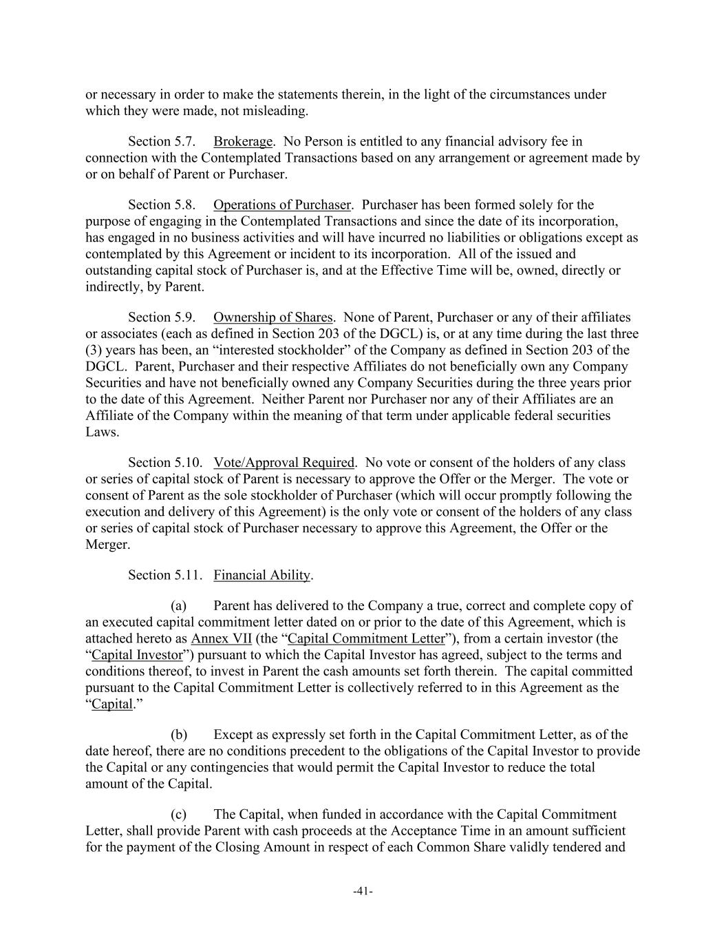 -41- or necessary in order to make the statements therein, in the light of the circumstances under which they were made, not misleading. Section 5.7. Brokerage. No Person is entitled to any financial advisory fee in connection with the Contemplated Transactions based on any arrangement or agreement made by or on behalf of Parent or Purchaser. Section 5.8. Operations of Purchaser. Purchaser has been formed solely for the purpose of engaging in the Contemplated Transactions and since the date of its incorporation, has engaged in no business activities and will have incurred no liabilities or obligations except as contemplated by this Agreement or incident to its incorporation. All of the issued and outstanding capital stock of Purchaser is, and at the Effective Time will be, owned, directly or indirectly, by Parent. Section 5.9. Ownership of Shares. None of Parent, Purchaser or any of their affiliates or associates (each as defined in Section 203 of the DGCL) is, or at any time during the last three (3) years has been, an “interested stockholder” of the Company as defined in Section 203 of the DGCL. Parent, Purchaser and their respective Affiliates do not beneficially own any Company Securities and have not beneficially owned any Company Securities during the three years prior to the date of this Agreement. Neither Parent nor Purchaser nor any of their Affiliates are an Affiliate of the Company within the meaning of that term under applicable federal securities Laws. Section 5.10. Vote/Approval Required. No vote or consent of the holders of any class or series of capital stock of Parent is necessary to approve the Offer or the Merger. The vote or consent of Parent as the sole stockholder of Purchaser (which will occur promptly following the execution and delivery of this Agreement) is the only vote or consent of the holders of any class or series of capital stock of Purchaser necessary to approve this Agreement, the Offer or the Merger. Section 5.11. Financial Ability. (a) Parent has delivered to the Company a true, correct and complete copy of an executed capital commitment letter dated on or prior to the date of this Agreement, which is attached hereto as Annex VII (the “Capital Commitment Letter”), from a certain investor (the “Capital Investor”) pursuant to which the Capital Investor has agreed, subject to the terms and conditions thereof, to invest in Parent the cash amounts set forth therein. The capital committed pursuant to the Capital Commitment Letter is collectively referred to in this Agreement as the “Capital.” (b) Except as expressly set forth in the Capital Commitment Letter, as of the date hereof, there are no conditions precedent to the obligations of the Capital Investor to provide the Capital or any contingencies that would permit the Capital Investor to reduce the total amount of the Capital. (c) The Capital, when funded in accordance with the Capital Commitment Letter, shall provide Parent with cash proceeds at the Acceptance Time in an amount sufficient for the payment of the Closing Amount in respect of each Common Share validly tendered and