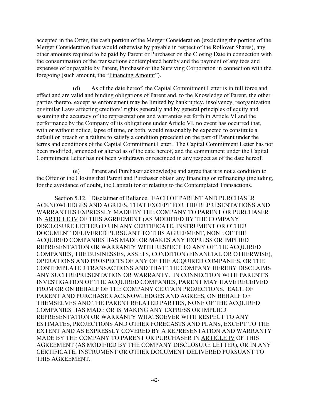 -42- accepted in the Offer, the cash portion of the Merger Consideration (excluding the portion of the Merger Consideration that would otherwise by payable in respect of the Rollover Shares), any other amounts required to be paid by Parent or Purchaser on the Closing Date in connection with the consummation of the transactions contemplated hereby and the payment of any fees and expenses of or payable by Parent, Purchaser or the Surviving Corporation in connection with the foregoing (such amount, the “Financing Amount”). (d) As of the date hereof, the Capital Commitment Letter is in full force and effect and are valid and binding obligations of Parent and, to the Knowledge of Parent, the other parties thereto, except as enforcement may be limited by bankruptcy, insolvency, reorganization or similar Laws affecting creditors’ rights generally and by general principles of equity and assuming the accuracy of the representations and warranties set forth in Article VI and the performance by the Company of its obligations under Article VI, no event has occurred that, with or without notice, lapse of time, or both, would reasonably be expected to constitute a default or breach or a failure to satisfy a condition precedent on the part of Parent under the terms and conditions of the Capital Commitment Letter. The Capital Commitment Letter has not been modified, amended or altered as of the date hereof, and the commitment under the Capital Commitment Letter has not been withdrawn or rescinded in any respect as of the date hereof. (e) Parent and Purchaser acknowledge and agree that it is not a condition to the Offer or the Closing that Parent and Purchaser obtain any financing or refinancing (including, for the avoidance of doubt, the Capital) for or relating to the Contemplated Transactions. Section 5.12. Disclaimer of Reliance. EACH OF PARENT AND PURCHASER ACKNOWLEDGES AND AGREES, THAT EXCEPT FOR THE REPRESENTATIONS AND WARRANTIES EXPRESSLY MADE BY THE COMPANY TO PARENT OR PURCHASER IN ARTICLE IV OF THIS AGREEMENT (AS MODIFIED BY THE COMPANY DISCLOSURE LETTER) OR IN ANY CERTIFICATE, INSTRUMENT OR OTHER DOCUMENT DELIVERED PURSUANT TO THIS AGREEMENT, NONE OF THE ACQUIRED COMPANIES HAS MADE OR MAKES ANY EXPRESS OR IMPLIED REPRESENTATION OR WARRANTY WITH RESPECT TO ANY OF THE ACQUIRED COMPANIES, THE BUSINESSES, ASSETS, CONDITION (FINANCIAL OR OTHERWISE), OPERATIONS AND PROSPECTS OF ANY OF THE ACQUIRED COMPANIES, OR THE CONTEMPLATED TRANSACTIONS AND THAT THE COMPANY HEREBY DISCLAIMS ANY SUCH REPRESENTATION OR WARRANTY. IN CONNECTION WITH PARENT’S INVESTIGATION OF THE ACQUIRED COMPANIES, PARENT MAY HAVE RECEIVED FROM OR ON BEHALF OF THE COMPANY CERTAIN PROJECTIONS. EACH OF PARENT AND PURCHASER ACKNOWLEDGES AND AGREES, ON BEHALF OF THEMSELVES AND THE PARENT RELATED PARTIES, NONE OF THE ACQUIRED COMPANIES HAS MADE OR IS MAKING ANY EXPRESS OR IMPLIED REPRESENTATION OR WARRANTY WHATSOEVER WITH RESPECT TO ANY ESTIMATES, PROJECTIONS AND OTHER FORECASTS AND PLANS, EXCEPT TO THE EXTENT AND AS EXPRESSLY COVERED BY A REPRESENTATION AND WARRANTY MADE BY THE COMPANY TO PARENT OR PURCHASER IN ARTICLE IV OF THIS AGREEMENT (AS MODIFIED BY THE COMPANY DISCLOSURE LETTER), OR IN ANY CERTIFICATE, INSTRUMENT OR OTHER DOCUMENT DELIVERED PURSUANT TO THIS AGREEMENT.