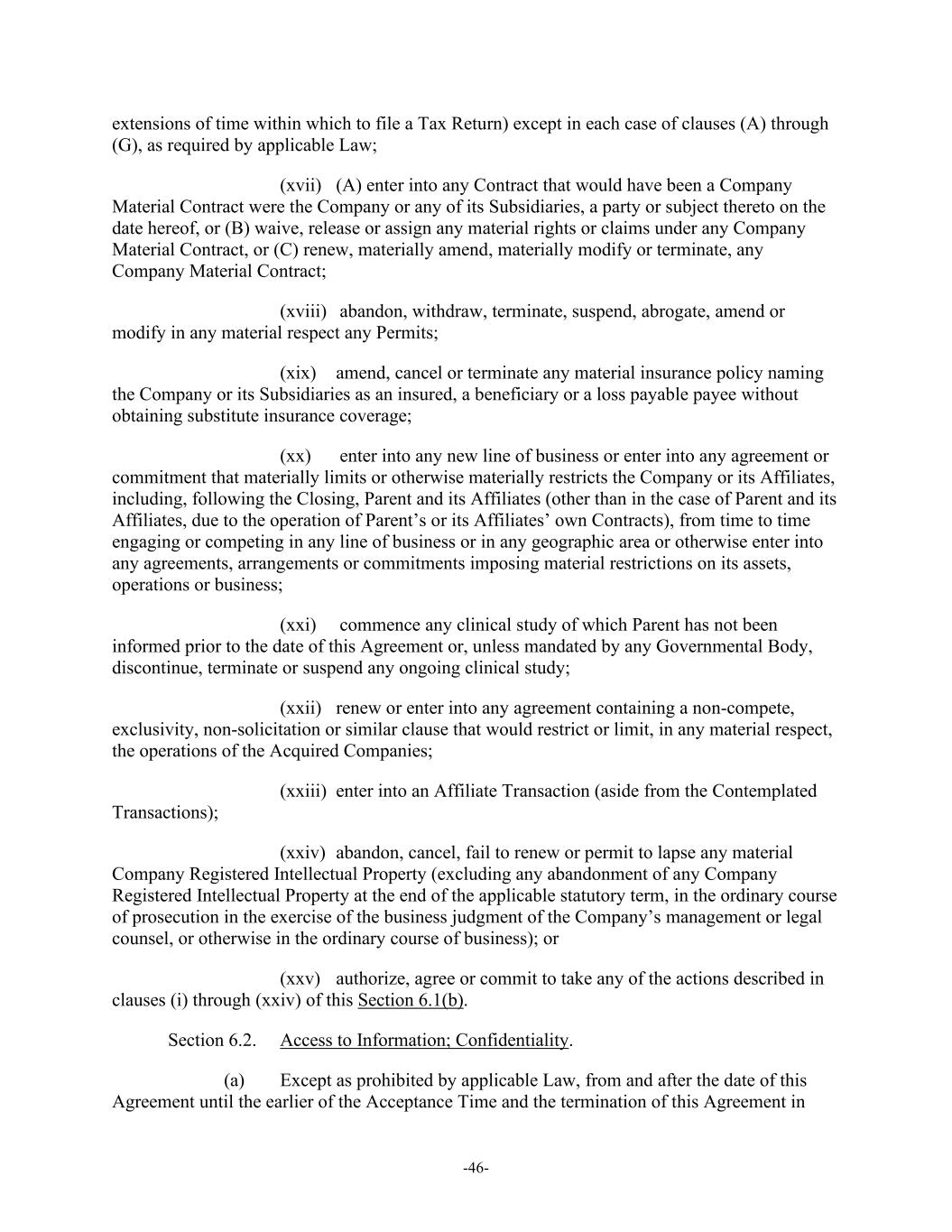 -46- extensions of time within which to file a Tax Return) except in each case of clauses (A) through (G), as required by applicable Law; (xvii) (A) enter into any Contract that would have been a Company Material Contract were the Company or any of its Subsidiaries, a party or subject thereto on the date hereof, or (B) waive, release or assign any material rights or claims under any Company Material Contract, or (C) renew, materially amend, materially modify or terminate, any Company Material Contract; (xviii) abandon, withdraw, terminate, suspend, abrogate, amend or modify in any material respect any Permits; (xix) amend, cancel or terminate any material insurance policy naming the Company or its Subsidiaries as an insured, a beneficiary or a loss payable payee without obtaining substitute insurance coverage; (xx) enter into any new line of business or enter into any agreement or commitment that materially limits or otherwise materially restricts the Company or its Affiliates, including, following the Closing, Parent and its Affiliates (other than in the case of Parent and its Affiliates, due to the operation of Parent’s or its Affiliates’ own Contracts), from time to time engaging or competing in any line of business or in any geographic area or otherwise enter into any agreements, arrangements or commitments imposing material restrictions on its assets, operations or business; (xxi) commence any clinical study of which Parent has not been informed prior to the date of this Agreement or, unless mandated by any Governmental Body, discontinue, terminate or suspend any ongoing clinical study; (xxii) renew or enter into any agreement containing a non-compete, exclusivity, non-solicitation or similar clause that would restrict or limit, in any material respect, the operations of the Acquired Companies; (xxiii) enter into an Affiliate Transaction (aside from the Contemplated Transactions); (xxiv) abandon, cancel, fail to renew or permit to lapse any material Company Registered Intellectual Property (excluding any abandonment of any Company Registered Intellectual Property at the end of the applicable statutory term, in the ordinary course of prosecution in the exercise of the business judgment of the Company’s management or legal counsel, or otherwise in the ordinary course of business); or (xxv) authorize, agree or commit to take any of the actions described in clauses (i) through (xxiv) of this Section 6.1(b). Section 6.2. Access to Information; Confidentiality. (a) Except as prohibited by applicable Law, from and after the date of this Agreement until the earlier of the Acceptance Time and the termination of this Agreement in