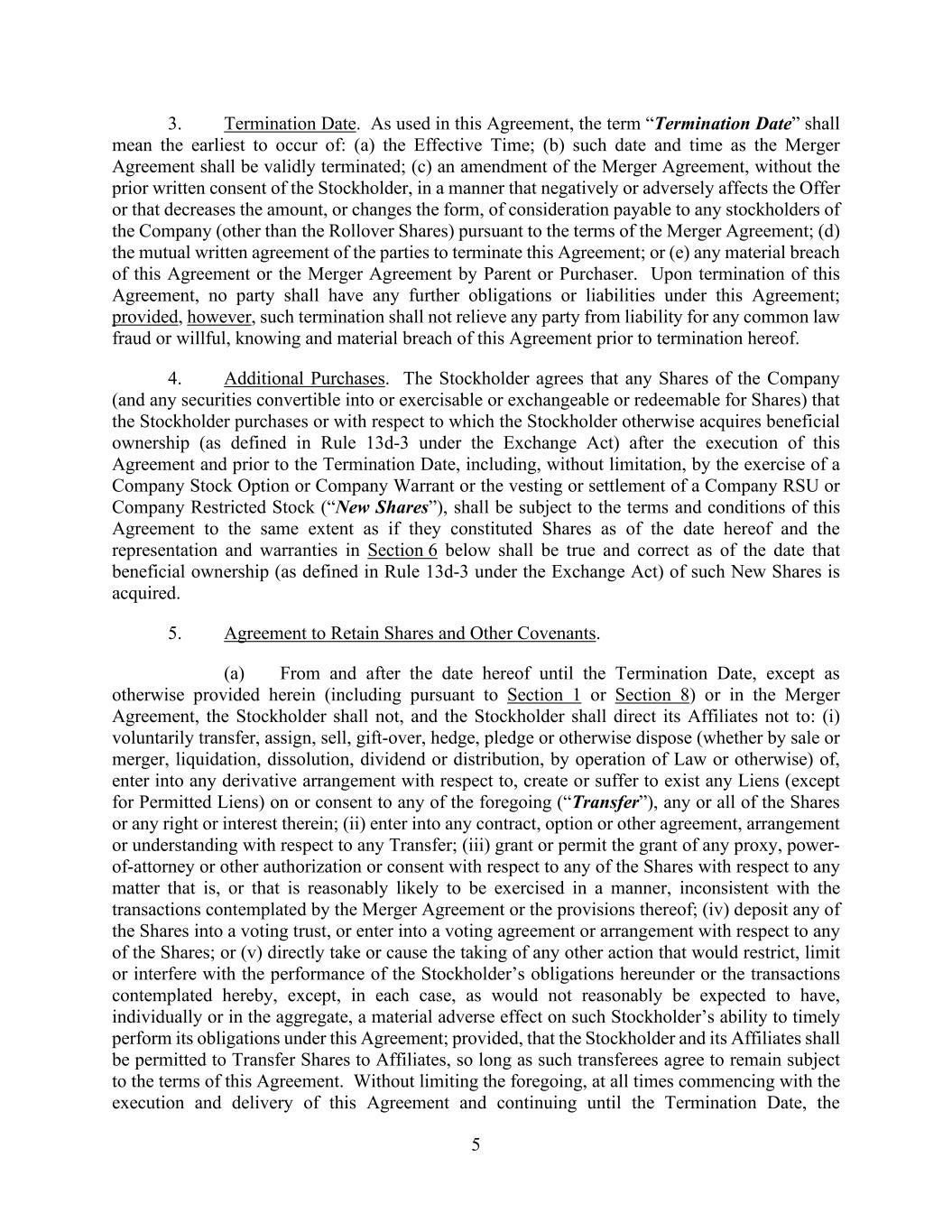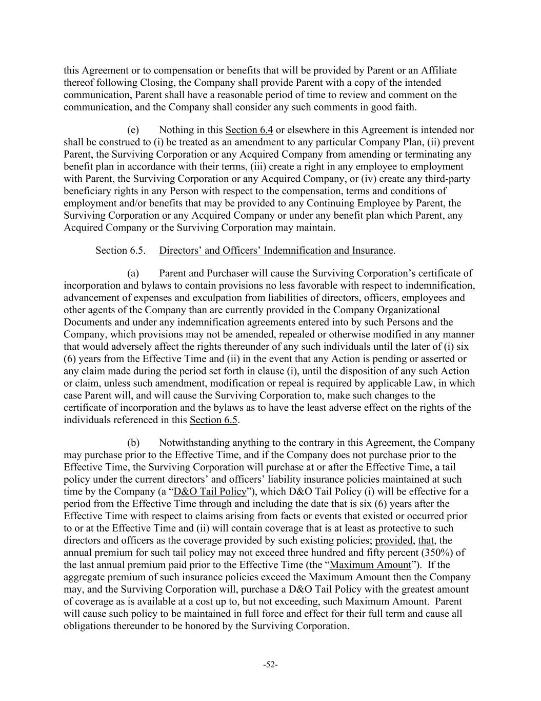 -52- this Agreement or to compensation or benefits that will be provided by Parent or an Affiliate thereof following Closing, the Company shall provide Parent with a copy of the intended communication, Parent shall have a reasonable period of time to review and comment on the communication, and the Company shall consider any such comments in good faith. (e) Nothing in this Section 6.4 or elsewhere in this Agreement is intended nor shall be construed to (i) be treated as an amendment to any particular Company Plan, (ii) prevent Parent, the Surviving Corporation or any Acquired Company from amending or terminating any benefit plan in accordance with their terms, (iii) create a right in any employee to employment with Parent, the Surviving Corporation or any Acquired Company, or (iv) create any third-party beneficiary rights in any Person with respect to the compensation, terms and conditions of employment and/or benefits that may be provided to any Continuing Employee by Parent, the Surviving Corporation or any Acquired Company or under any benefit plan which Parent, any Acquired Company or the Surviving Corporation may maintain. Section 6.5. Directors’ and Officers’ Indemnification and Insurance. (a) Parent and Purchaser will cause the Surviving Corporation’s certificate of incorporation and bylaws to contain provisions no less favorable with respect to indemnification, advancement of expenses and exculpation from liabilities of directors, officers, employees and other agents of the Company than are currently provided in the Company Organizational Documents and under any indemnification agreements entered into by such Persons and the Company, which provisions may not be amended, repealed or otherwise modified in any manner that would adversely affect the rights thereunder of any such individuals until the later of (i) six (6) years from the Effective Time and (ii) in the event that any Action is pending or asserted or any claim made during the period set forth in clause (i), until the disposition of any such Action or claim, unless such amendment, modification or repeal is required by applicable Law, in which case Parent will, and will cause the Surviving Corporation to, make such changes to the certificate of incorporation and the bylaws as to have the least adverse effect on the rights of the individuals referenced in this Section 6.5. (b) Notwithstanding anything to the contrary in this Agreement, the Company may purchase prior to the Effective Time, and if the Company does not purchase prior to the Effective Time, the Surviving Corporation will purchase at or after the Effective Time, a tail policy under the current directors’ and officers’ liability insurance policies maintained at such time by the Company (a “D&O Tail Policy”), which D&O Tail Policy (i) will be effective for a period from the Effective Time through and including the date that is six (6) years after the Effective Time with respect to claims arising from facts or events that existed or occurred prior to or at the Effective Time and (ii) will contain coverage that is at least as protective to such directors and officers as the coverage provided by such existing policies; provided, that, the annual premium for such tail policy may not exceed three hundred and fifty percent (350%) of the last annual premium paid prior to the Effective Time (the “Maximum Amount”). If the aggregate premium of such insurance policies exceed the Maximum Amount then the Company may, and the Surviving Corporation will, purchase a D&O Tail Policy with the greatest amount of coverage as is available at a cost up to, but not exceeding, such Maximum Amount. Parent will cause such policy to be maintained in full force and effect for their full term and cause all obligations thereunder to be honored by the Surviving Corporation.