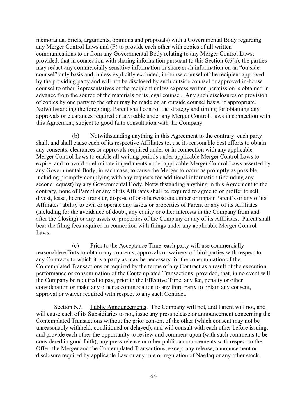 -54- memoranda, briefs, arguments, opinions and proposals) with a Governmental Body regarding any Merger Control Laws and (F) to provide each other with copies of all written communications to or from any Governmental Body relating to any Merger Control Laws; provided, that in connection with sharing information pursuant to this Section 6.6(a), the parties may redact any commercially sensitive information or share such information on an “outside counsel” only basis and, unless explicitly excluded, in-house counsel of the recipient approved by the providing party and will not be disclosed by such outside counsel or approved in-house counsel to other Representatives of the recipient unless express written permission is obtained in advance from the source of the materials or its legal counsel. Any such disclosures or provision of copies by one party to the other may be made on an outside counsel basis, if appropriate. Notwithstanding the foregoing, Parent shall control the strategy and timing for obtaining any approvals or clearances required or advisable under any Merger Control Laws in connection with this Agreement, subject to good faith consultation with the Company. (b) Notwithstanding anything in this Agreement to the contrary, each party shall, and shall cause each of its respective Affiliates to, use its reasonable best efforts to obtain any consents, clearances or approvals required under or in connection with any applicable Merger Control Laws to enable all waiting periods under applicable Merger Control Laws to expire, and to avoid or eliminate impediments under applicable Merger Control Laws asserted by any Governmental Body, in each case, to cause the Merger to occur as promptly as possible, including promptly complying with any requests for additional information (including any second request) by any Governmental Body. Notwithstanding anything in this Agreement to the contrary, none of Parent or any of its Affiliates shall be required to agree to or proffer to sell, divest, lease, license, transfer, dispose of or otherwise encumber or impair Parent’s or any of its Affiliates’ ability to own or operate any assets or properties of Parent or any of its Affiliates (including for the avoidance of doubt, any equity or other interests in the Company from and after the Closing) or any assets or properties of the Company or any of its Affiliates. Parent shall bear the filing fees required in connection with filings under any applicable Merger Control Laws. (c) Prior to the Acceptance Time, each party will use commercially reasonable efforts to obtain any consents, approvals or waivers of third parties with respect to any Contracts to which it is a party as may be necessary for the consummation of the Contemplated Transactions or required by the terms of any Contract as a result of the execution, performance or consummation of the Contemplated Transactions; provided, that, in no event will the Company be required to pay, prior to the Effective Time, any fee, penalty or other consideration or make any other accommodation to any third party to obtain any consent, approval or waiver required with respect to any such Contract. Section 6.7. Public Announcements. The Company will not, and Parent will not, and will cause each of its Subsidiaries to not, issue any press release or announcement concerning the Contemplated Transactions without the prior consent of the other (which consent may not be unreasonably withheld, conditioned or delayed), and will consult with each other before issuing, and provide each other the opportunity to review and comment upon (with such comments to be considered in good faith), any press release or other public announcements with respect to the Offer, the Merger and the Contemplated Transactions, except any release, announcement or disclosure required by applicable Law or any rule or regulation of Nasdaq or any other stock