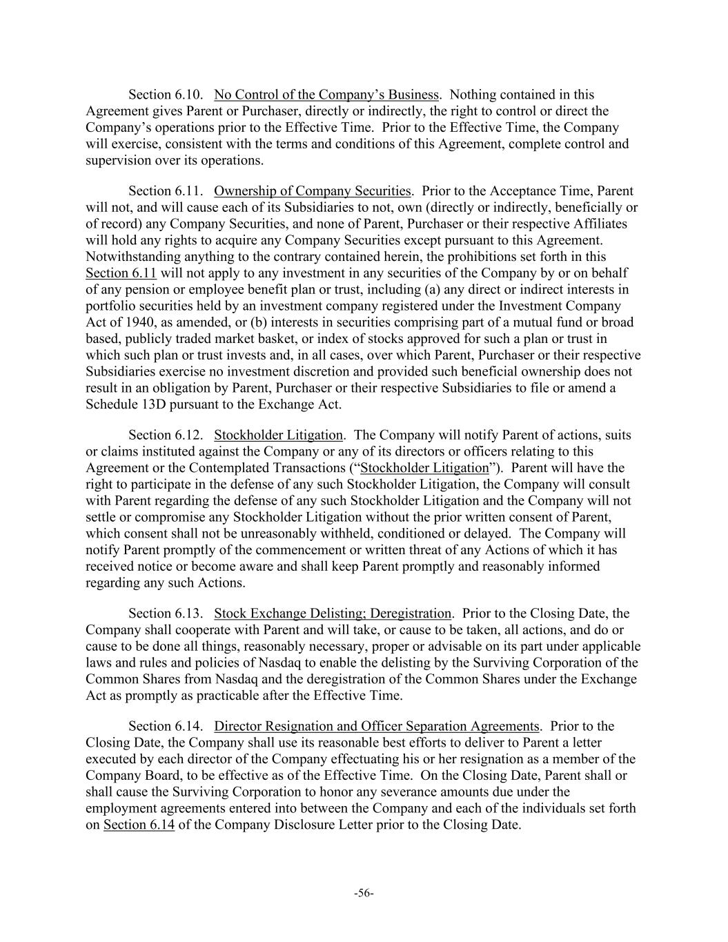 -56- Section 6.10. No Control of the Company’s Business. Nothing contained in this Agreement gives Parent or Purchaser, directly or indirectly, the right to control or direct the Company’s operations prior to the Effective Time. Prior to the Effective Time, the Company will exercise, consistent with the terms and conditions of this Agreement, complete control and supervision over its operations. Section 6.11. Ownership of Company Securities. Prior to the Acceptance Time, Parent will not, and will cause each of its Subsidiaries to not, own (directly or indirectly, beneficially or of record) any Company Securities, and none of Parent, Purchaser or their respective Affiliates will hold any rights to acquire any Company Securities except pursuant to this Agreement. Notwithstanding anything to the contrary contained herein, the prohibitions set forth in this Section 6.11 will not apply to any investment in any securities of the Company by or on behalf of any pension or employee benefit plan or trust, including (a) any direct or indirect interests in portfolio securities held by an investment company registered under the Investment Company Act of 1940, as amended, or (b) interests in securities comprising part of a mutual fund or broad based, publicly traded market basket, or index of stocks approved for such a plan or trust in which such plan or trust invests and, in all cases, over which Parent, Purchaser or their respective Subsidiaries exercise no investment discretion and provided such beneficial ownership does not result in an obligation by Parent, Purchaser or their respective Subsidiaries to file or amend a Schedule 13D pursuant to the Exchange Act. Section 6.12. Stockholder Litigation. The Company will notify Parent of actions, suits or claims instituted against the Company or any of its directors or officers relating to this Agreement or the Contemplated Transactions (“Stockholder Litigation”). Parent will have the right to participate in the defense of any such Stockholder Litigation, the Company will consult with Parent regarding the defense of any such Stockholder Litigation and the Company will not settle or compromise any Stockholder Litigation without the prior written consent of Parent, which consent shall not be unreasonably withheld, conditioned or delayed. The Company will notify Parent promptly of the commencement or written threat of any Actions of which it has received notice or become aware and shall keep Parent promptly and reasonably informed regarding any such Actions. Section 6.13. Stock Exchange Delisting; Deregistration. Prior to the Closing Date, the Company shall cooperate with Parent and will take, or cause to be taken, all actions, and do or cause to be done all things, reasonably necessary, proper or advisable on its part under applicable laws and rules and policies of Nasdaq to enable the delisting by the Surviving Corporation of the Common Shares from Nasdaq and the deregistration of the Common Shares under the Exchange Act as promptly as practicable after the Effective Time. Section 6.14. Director Resignation and Officer Separation Agreements. Prior to the Closing Date, the Company shall use its reasonable best efforts to deliver to Parent a letter executed by each director of the Company effectuating his or her resignation as a member of the Company Board, to be effective as of the Effective Time. On the Closing Date, Parent shall or shall cause the Surviving Corporation to honor any severance amounts due under the employment agreements entered into between the Company and each of the individuals set forth on Section 6.14 of the Company Disclosure Letter prior to the Closing Date.
