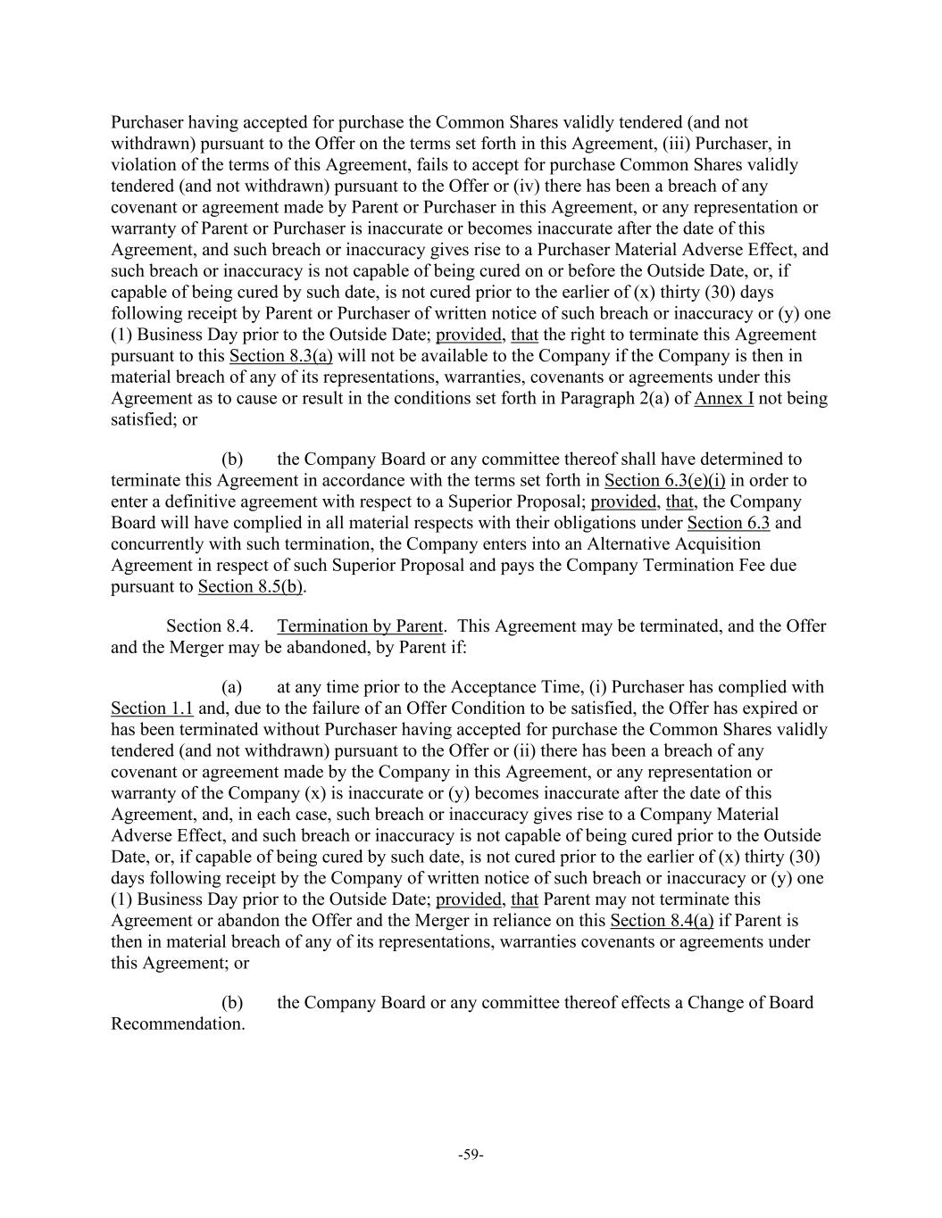 -59- Purchaser having accepted for purchase the Common Shares validly tendered (and not withdrawn) pursuant to the Offer on the terms set forth in this Agreement, (iii) Purchaser, in violation of the terms of this Agreement, fails to accept for purchase Common Shares validly tendered (and not withdrawn) pursuant to the Offer or (iv) there has been a breach of any covenant or agreement made by Parent or Purchaser in this Agreement, or any representation or warranty of Parent or Purchaser is inaccurate or becomes inaccurate after the date of this Agreement, and such breach or inaccuracy gives rise to a Purchaser Material Adverse Effect, and such breach or inaccuracy is not capable of being cured on or before the Outside Date, or, if capable of being cured by such date, is not cured prior to the earlier of (x) thirty (30) days following receipt by Parent or Purchaser of written notice of such breach or inaccuracy or (y) one (1) Business Day prior to the Outside Date; provided, that the right to terminate this Agreement pursuant to this Section 8.3(a) will not be available to the Company if the Company is then in material breach of any of its representations, warranties, covenants or agreements under this Agreement as to cause or result in the conditions set forth in Paragraph 2(a) of Annex I not being satisfied; or (b) the Company Board or any committee thereof shall have determined to terminate this Agreement in accordance with the terms set forth in Section 6.3(e)(i) in order to enter a definitive agreement with respect to a Superior Proposal; provided, that, the Company Board will have complied in all material respects with their obligations under Section 6.3 and concurrently with such termination, the Company enters into an Alternative Acquisition Agreement in respect of such Superior Proposal and pays the Company Termination Fee due pursuant to Section 8.5(b). Section 8.4. Termination by Parent. This Agreement may be terminated, and the Offer and the Merger may be abandoned, by Parent if: (a) at any time prior to the Acceptance Time, (i) Purchaser has complied with Section 1.1 and, due to the failure of an Offer Condition to be satisfied, the Offer has expired or has been terminated without Purchaser having accepted for purchase the Common Shares validly tendered (and not withdrawn) pursuant to the Offer or (ii) there has been a breach of any covenant or agreement made by the Company in this Agreement, or any representation or warranty of the Company (x) is inaccurate or (y) becomes inaccurate after the date of this Agreement, and, in each case, such breach or inaccuracy gives rise to a Company Material Adverse Effect, and such breach or inaccuracy is not capable of being cured prior to the Outside Date, or, if capable of being cured by such date, is not cured prior to the earlier of (x) thirty (30) days following receipt by the Company of written notice of such breach or inaccuracy or (y) one (1) Business Day prior to the Outside Date; provided, that Parent may not terminate this Agreement or abandon the Offer and the Merger in reliance on this Section 8.4(a) if Parent is then in material breach of any of its representations, warranties covenants or agreements under this Agreement; or (b) the Company Board or any committee thereof effects a Change of Board Recommendation.