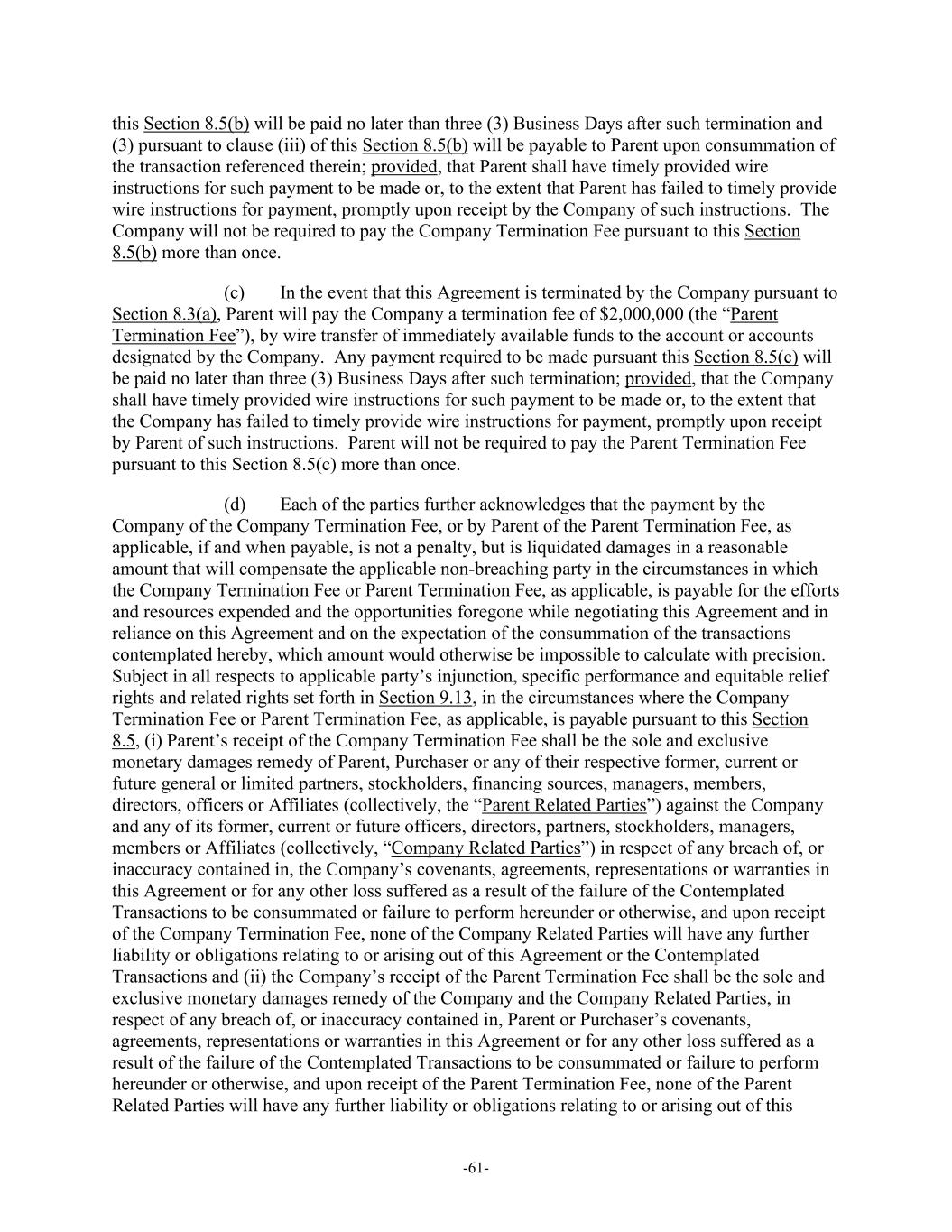 -61- this Section 8.5(b) will be paid no later than three (3) Business Days after such termination and (3) pursuant to clause (iii) of this Section 8.5(b) will be payable to Parent upon consummation of the transaction referenced therein; provided, that Parent shall have timely provided wire instructions for such payment to be made or, to the extent that Parent has failed to timely provide wire instructions for payment, promptly upon receipt by the Company of such instructions. The Company will not be required to pay the Company Termination Fee pursuant to this Section 8.5(b) more than once. (c) In the event that this Agreement is terminated by the Company pursuant to Section 8.3(a), Parent will pay the Company a termination fee of $2,000,000 (the “Parent Termination Fee”), by wire transfer of immediately available funds to the account or accounts designated by the Company. Any payment required to be made pursuant this Section 8.5(c) will be paid no later than three (3) Business Days after such termination; provided, that the Company shall have timely provided wire instructions for such payment to be made or, to the extent that the Company has failed to timely provide wire instructions for payment, promptly upon receipt by Parent of such instructions. Parent will not be required to pay the Parent Termination Fee pursuant to this Section 8.5(c) more than once. (d) Each of the parties further acknowledges that the payment by the Company of the Company Termination Fee, or by Parent of the Parent Termination Fee, as applicable, if and when payable, is not a penalty, but is liquidated damages in a reasonable amount that will compensate the applicable non-breaching party in the circumstances in which the Company Termination Fee or Parent Termination Fee, as applicable, is payable for the efforts and resources expended and the opportunities foregone while negotiating this Agreement and in reliance on this Agreement and on the expectation of the consummation of the transactions contemplated hereby, which amount would otherwise be impossible to calculate with precision. Subject in all respects to applicable party’s injunction, specific performance and equitable relief rights and related rights set forth in Section 9.13, in the circumstances where the Company Termination Fee or Parent Termination Fee, as applicable, is payable pursuant to this Section 8.5, (i) Parent’s receipt of the Company Termination Fee shall be the sole and exclusive monetary damages remedy of Parent, Purchaser or any of their respective former, current or future general or limited partners, stockholders, financing sources, managers, members, directors, officers or Affiliates (collectively, the “Parent Related Parties”) against the Company and any of its former, current or future officers, directors, partners, stockholders, managers, members or Affiliates (collectively, “Company Related Parties”) in respect of any breach of, or inaccuracy contained in, the Company’s covenants, agreements, representations or warranties in this Agreement or for any other loss suffered as a result of the failure of the Contemplated Transactions to be consummated or failure to perform hereunder or otherwise, and upon receipt of the Company Termination Fee, none of the Company Related Parties will have any further liability or obligations relating to or arising out of this Agreement or the Contemplated Transactions and (ii) the Company’s receipt of the Parent Termination Fee shall be the sole and exclusive monetary damages remedy of the Company and the Company Related Parties, in respect of any breach of, or inaccuracy contained in, Parent or Purchaser’s covenants, agreements, representations or warranties in this Agreement or for any other loss suffered as a result of the failure of the Contemplated Transactions to be consummated or failure to perform hereunder or otherwise, and upon receipt of the Parent Termination Fee, none of the Parent Related Parties will have any further liability or obligations relating to or arising out of this