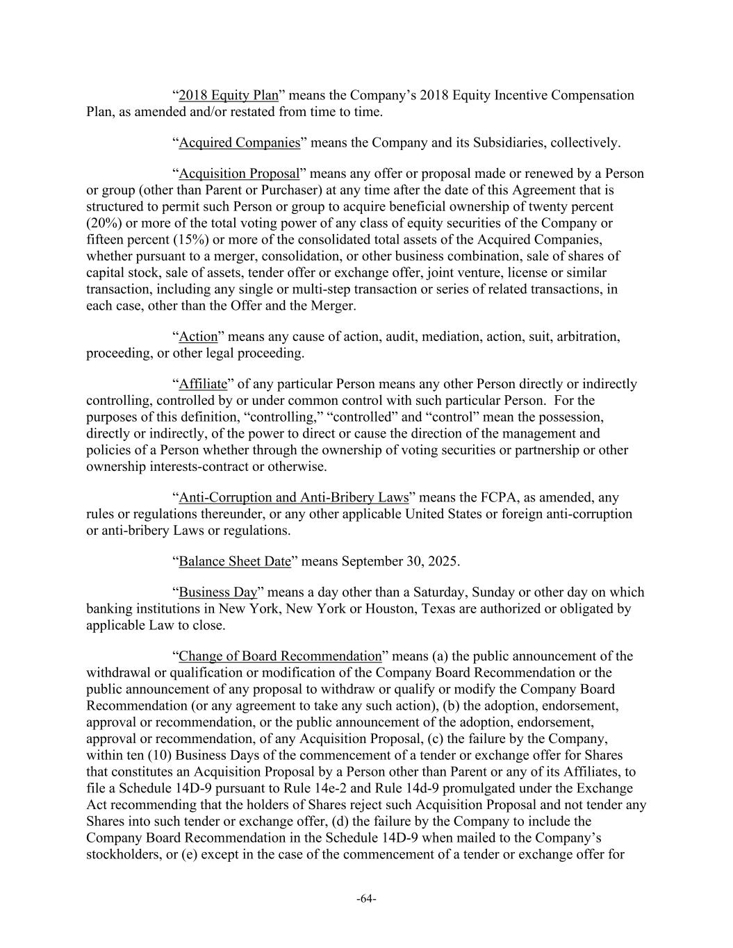 -64- “2018 Equity Plan” means the Company’s 2018 Equity Incentive Compensation Plan, as amended and/or restated from time to time. “Acquired Companies” means the Company and its Subsidiaries, collectively. “Acquisition Proposal” means any offer or proposal made or renewed by a Person or group (other than Parent or Purchaser) at any time after the date of this Agreement that is structured to permit such Person or group to acquire beneficial ownership of twenty percent (20%) or more of the total voting power of any class of equity securities of the Company or fifteen percent (15%) or more of the consolidated total assets of the Acquired Companies, whether pursuant to a merger, consolidation, or other business combination, sale of shares of capital stock, sale of assets, tender offer or exchange offer, joint venture, license or similar transaction, including any single or multi-step transaction or series of related transactions, in each case, other than the Offer and the Merger. “Action” means any cause of action, audit, mediation, action, suit, arbitration, proceeding, or other legal proceeding. “Affiliate” of any particular Person means any other Person directly or indirectly controlling, controlled by or under common control with such particular Person. For the purposes of this definition, “controlling,” “controlled” and “control” mean the possession, directly or indirectly, of the power to direct or cause the direction of the management and policies of a Person whether through the ownership of voting securities or partnership or other ownership interests-contract or otherwise. “Anti-Corruption and Anti-Bribery Laws” means the FCPA, as amended, any rules or regulations thereunder, or any other applicable United States or foreign anti-corruption or anti-bribery Laws or regulations. “Balance Sheet Date” means September 30, 2025. “Business Day” means a day other than a Saturday, Sunday or other day on which banking institutions in New York, New York or Houston, Texas are authorized or obligated by applicable Law to close. “Change of Board Recommendation” means (a) the public announcement of the withdrawal or qualification or modification of the Company Board Recommendation or the public announcement of any proposal to withdraw or qualify or modify the Company Board Recommendation (or any agreement to take any such action), (b) the adoption, endorsement, approval or recommendation, or the public announcement of the adoption, endorsement, approval or recommendation, of any Acquisition Proposal, (c) the failure by the Company, within ten (10) Business Days of the commencement of a tender or exchange offer for Shares that constitutes an Acquisition Proposal by a Person other than Parent or any of its Affiliates, to file a Schedule 14D-9 pursuant to Rule 14e-2 and Rule 14d-9 promulgated under the Exchange Act recommending that the holders of Shares reject such Acquisition Proposal and not tender any Shares into such tender or exchange offer, (d) the failure by the Company to include the Company Board Recommendation in the Schedule 14D-9 when mailed to the Company’s stockholders, or (e) except in the case of the commencement of a tender or exchange offer for