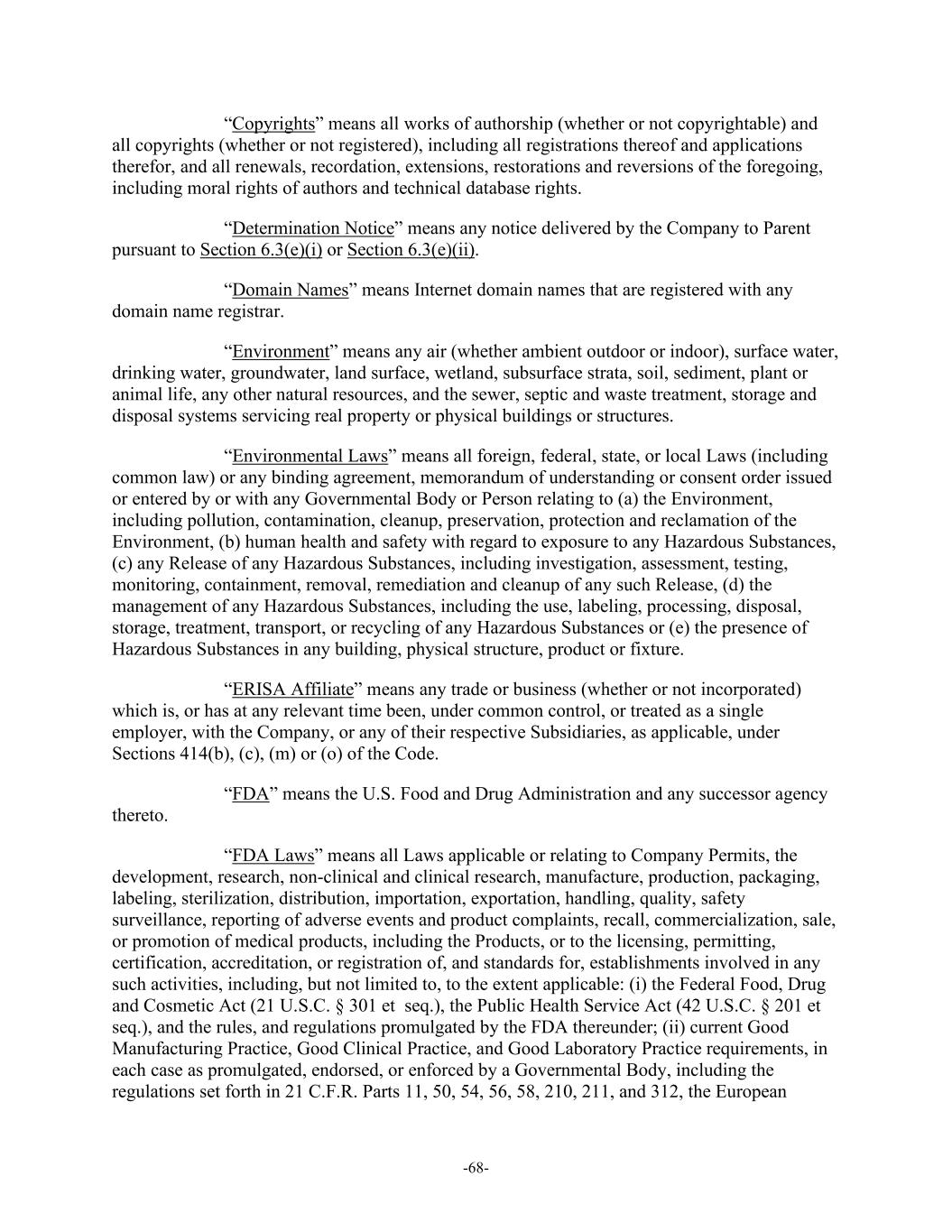 -68- “Copyrights” means all works of authorship (whether or not copyrightable) and all copyrights (whether or not registered), including all registrations thereof and applications therefor, and all renewals, recordation, extensions, restorations and reversions of the foregoing, including moral rights of authors and technical database rights. “Determination Notice” means any notice delivered by the Company to Parent pursuant to Section 6.3(e)(i) or Section 6.3(e)(ii). “Domain Names” means Internet domain names that are registered with any domain name registrar. “Environment” means any air (whether ambient outdoor or indoor), surface water, drinking water, groundwater, land surface, wetland, subsurface strata, soil, sediment, plant or animal life, any other natural resources, and the sewer, septic and waste treatment, storage and disposal systems servicing real property or physical buildings or structures. “Environmental Laws” means all foreign, federal, state, or local Laws (including common law) or any binding agreement, memorandum of understanding or consent order issued or entered by or with any Governmental Body or Person relating to (a) the Environment, including pollution, contamination, cleanup, preservation, protection and reclamation of the Environment, (b) human health and safety with regard to exposure to any Hazardous Substances, (c) any Release of any Hazardous Substances, including investigation, assessment, testing, monitoring, containment, removal, remediation and cleanup of any such Release, (d) the management of any Hazardous Substances, including the use, labeling, processing, disposal, storage, treatment, transport, or recycling of any Hazardous Substances or (e) the presence of Hazardous Substances in any building, physical structure, product or fixture. “ERISA Affiliate” means any trade or business (whether or not incorporated) which is, or has at any relevant time been, under common control, or treated as a single employer, with the Company, or any of their respective Subsidiaries, as applicable, under Sections 414(b), (c), (m) or (o) of the Code. “FDA” means the U.S. Food and Drug Administration and any successor agency thereto. “FDA Laws” means all Laws applicable or relating to Company Permits, the development, research, non-clinical and clinical research, manufacture, production, packaging, labeling, sterilization, distribution, importation, exportation, handling, quality, safety surveillance, reporting of adverse events and product complaints, recall, commercialization, sale, or promotion of medical products, including the Products, or to the licensing, permitting, certification, accreditation, or registration of, and standards for, establishments involved in any such activities, including, but not limited to, to the extent applicable: (i) the Federal Food, Drug and Cosmetic Act (21 U.S.C. § 301 et seq.), the Public Health Service Act (42 U.S.C. § 201 et seq.), and the rules, and regulations promulgated by the FDA thereunder; (ii) current Good Manufacturing Practice, Good Clinical Practice, and Good Laboratory Practice requirements, in each case as promulgated, endorsed, or enforced by a Governmental Body, including the regulations set forth in 21 C.F.R. Parts 11, 50, 54, 56, 58, 210, 211, and 312, the European