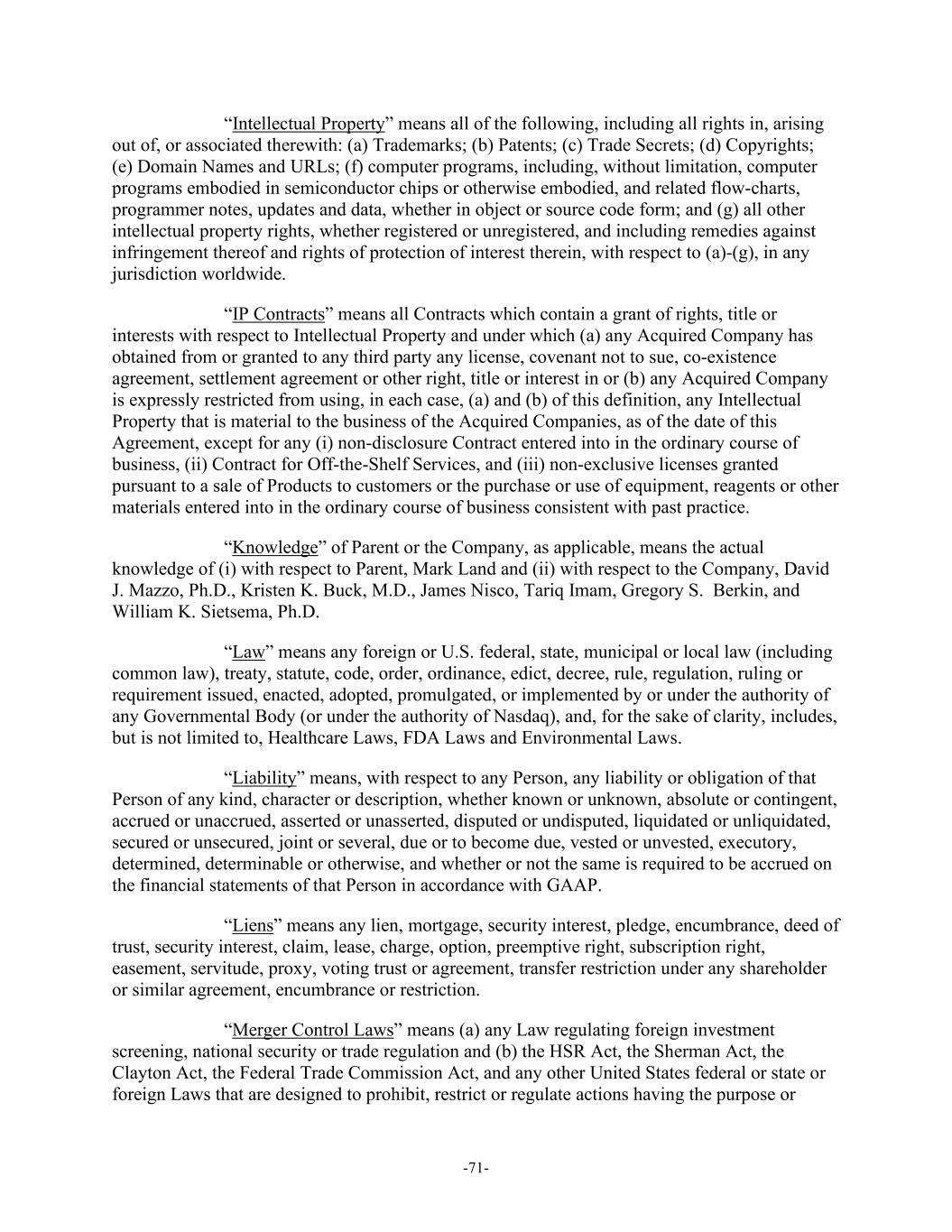 -71- “Intellectual Property” means all of the following, including all rights in, arising out of, or associated therewith: (a) Trademarks; (b) Patents; (c) Trade Secrets; (d) Copyrights; (e) Domain Names and URLs; (f) computer programs, including, without limitation, computer programs embodied in semiconductor chips or otherwise embodied, and related flow-charts, programmer notes, updates and data, whether in object or source code form; and (g) all other intellectual property rights, whether registered or unregistered, and including remedies against infringement thereof and rights of protection of interest therein, with respect to (a)-(g), in any jurisdiction worldwide. “IP Contracts” means all Contracts which contain a grant of rights, title or interests with respect to Intellectual Property and under which (a) any Acquired Company has obtained from or granted to any third party any license, covenant not to sue, co-existence agreement, settlement agreement or other right, title or interest in or (b) any Acquired Company is expressly restricted from using, in each case, (a) and (b) of this definition, any Intellectual Property that is material to the business of the Acquired Companies, as of the date of this Agreement, except for any (i) non-disclosure Contract entered into in the ordinary course of business, (ii) Contract for Off-the-Shelf Services, and (iii) non-exclusive licenses granted pursuant to a sale of Products to customers or the purchase or use of equipment, reagents or other materials entered into in the ordinary course of business consistent with past practice. “Knowledge” of Parent or the Company, as applicable, means the actual knowledge of (i) with respect to Parent, Mark Land and (ii) with respect to the Company, David J. Mazzo, Ph.D., Kristen K. Buck, M.D., James Nisco, Tariq Imam, Gregory S. Berkin, and William K. Sietsema, Ph.D. “Law” means any foreign or U.S. federal, state, municipal or local law (including common law), treaty, statute, code, order, ordinance, edict, decree, rule, regulation, ruling or requirement issued, enacted, adopted, promulgated, or implemented by or under the authority of any Governmental Body (or under the authority of Nasdaq), and, for the sake of clarity, includes, but is not limited to, Healthcare Laws, FDA Laws and Environmental Laws. “Liability” means, with respect to any Person, any liability or obligation of that Person of any kind, character or description, whether known or unknown, absolute or contingent, accrued or unaccrued, asserted or unasserted, disputed or undisputed, liquidated or unliquidated, secured or unsecured, joint or several, due or to become due, vested or unvested, executory, determined, determinable or otherwise, and whether or not the same is required to be accrued on the financial statements of that Person in accordance with GAAP. “Liens” means any lien, mortgage, security interest, pledge, encumbrance, deed of trust, security interest, claim, lease, charge, option, preemptive right, subscription right, easement, servitude, proxy, voting trust or agreement, transfer restriction under any shareholder or similar agreement, encumbrance or restriction. “Merger Control Laws” means (a) any Law regulating foreign investment screening, national security or trade regulation and (b) the HSR Act, the Sherman Act, the Clayton Act, the Federal Trade Commission Act, and any other United States federal or state or foreign Laws that are designed to prohibit, restrict or regulate actions having the purpose or