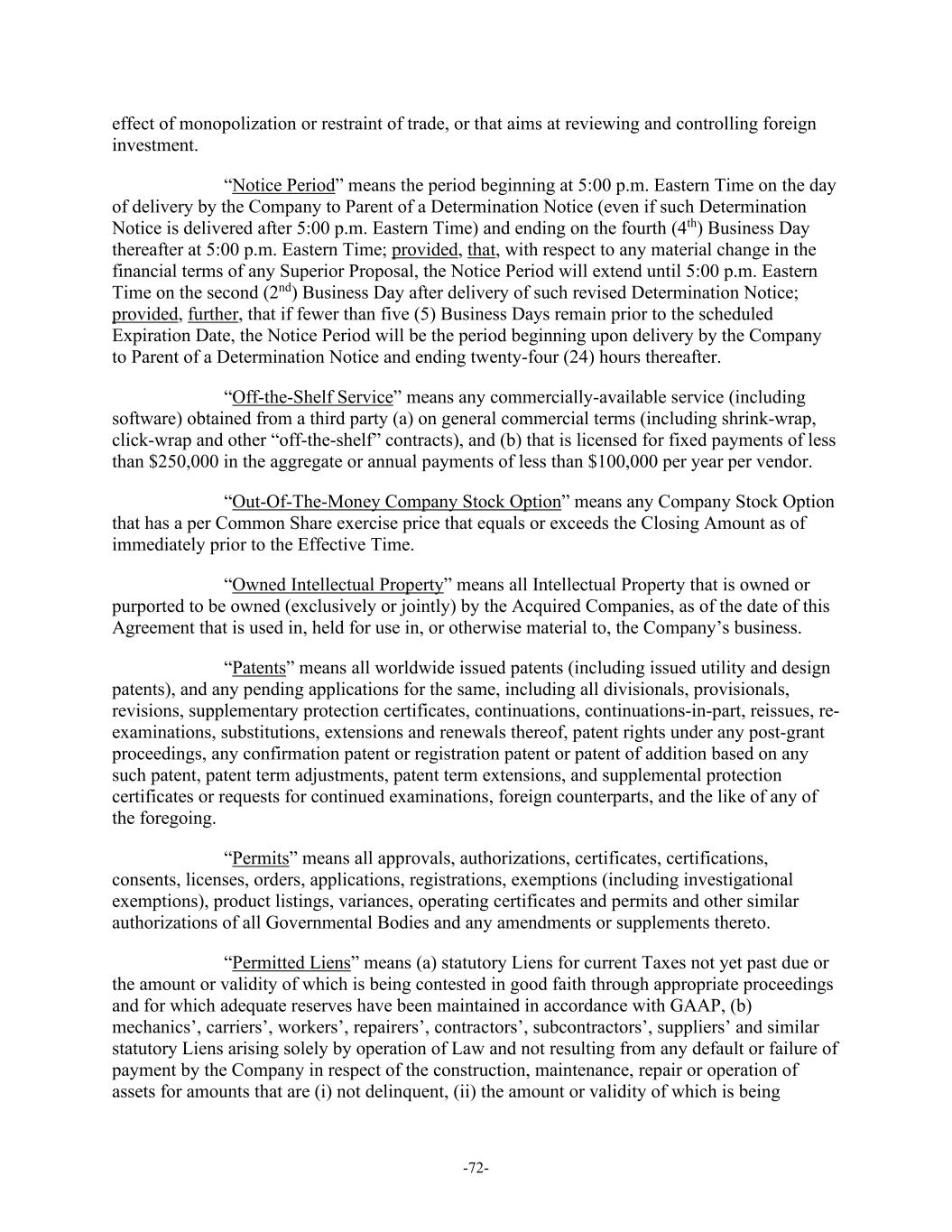 -72- effect of monopolization or restraint of trade, or that aims at reviewing and controlling foreign investment. “Notice Period” means the period beginning at 5:00 p.m. Eastern Time on the day of delivery by the Company to Parent of a Determination Notice (even if such Determination Notice is delivered after 5:00 p.m. Eastern Time) and ending on the fourth (4th) Business Day thereafter at 5:00 p.m. Eastern Time; provided, that, with respect to any material change in the financial terms of any Superior Proposal, the Notice Period will extend until 5:00 p.m. Eastern Time on the second (2nd) Business Day after delivery of such revised Determination Notice; provided, further, that if fewer than five (5) Business Days remain prior to the scheduled Expiration Date, the Notice Period will be the period beginning upon delivery by the Company to Parent of a Determination Notice and ending twenty-four (24) hours thereafter. “Off-the-Shelf Service” means any commercially-available service (including software) obtained from a third party (a) on general commercial terms (including shrink-wrap, click-wrap and other “off-the-shelf” contracts), and (b) that is licensed for fixed payments of less than $250,000 in the aggregate or annual payments of less than $100,000 per year per vendor. “Out-Of-The-Money Company Stock Option” means any Company Stock Option that has a per Common Share exercise price that equals or exceeds the Closing Amount as of immediately prior to the Effective Time. “Owned Intellectual Property” means all Intellectual Property that is owned or purported to be owned (exclusively or jointly) by the Acquired Companies, as of the date of this Agreement that is used in, held for use in, or otherwise material to, the Company’s business. “Patents” means all worldwide issued patents (including issued utility and design patents), and any pending applications for the same, including all divisionals, provisionals, revisions, supplementary protection certificates, continuations, continuations-in-part, reissues, re- examinations, substitutions, extensions and renewals thereof, patent rights under any post-grant proceedings, any confirmation patent or registration patent or patent of addition based on any such patent, patent term adjustments, patent term extensions, and supplemental protection certificates or requests for continued examinations, foreign counterparts, and the like of any of the foregoing. “Permits” means all approvals, authorizations, certificates, certifications, consents, licenses, orders, applications, registrations, exemptions (including investigational exemptions), product listings, variances, operating certificates and permits and other similar authorizations of all Governmental Bodies and any amendments or supplements thereto. “Permitted Liens” means (a) statutory Liens for current Taxes not yet past due or the amount or validity of which is being contested in good faith through appropriate proceedings and for which adequate reserves have been maintained in accordance with GAAP, (b) mechanics’, carriers’, workers’, repairers’, contractors’, subcontractors’, suppliers’ and similar statutory Liens arising solely by operation of Law and not resulting from any default or failure of payment by the Company in respect of the construction, maintenance, repair or operation of assets for amounts that are (i) not delinquent, (ii) the amount or validity of which is being