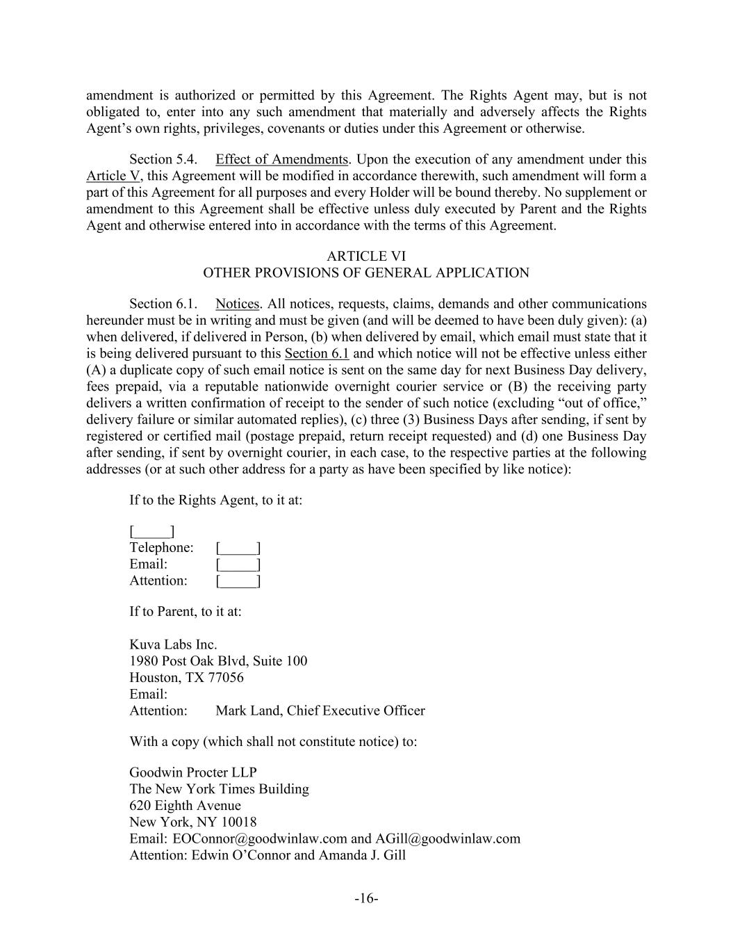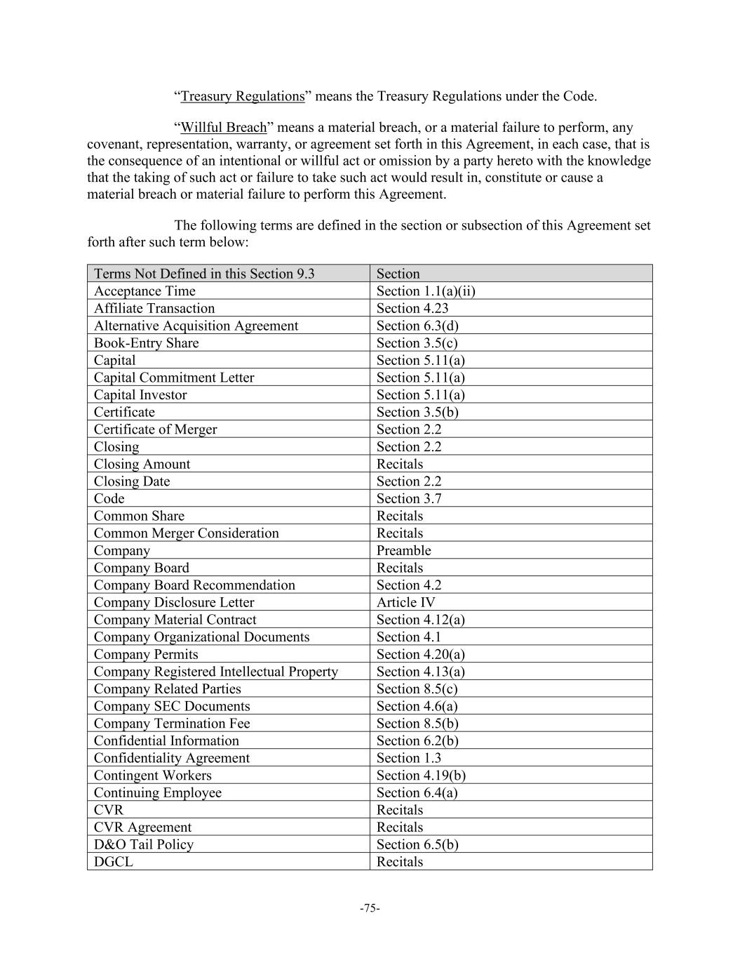 -75- “Treasury Regulations” means the Treasury Regulations under the Code. “Willful Breach” means a material breach, or a material failure to perform, any covenant, representation, warranty, or agreement set forth in this Agreement, in each case, that is the consequence of an intentional or willful act or omission by a party hereto with the knowledge that the taking of such act or failure to take such act would result in, constitute or cause a material breach or material failure to perform this Agreement. The following terms are defined in the section or subsection of this Agreement set forth after such term below: Terms Not Defined in this Section 9.3 Section Acceptance Time Section 1.1(a)(ii) Affiliate Transaction Section 4.23 Alternative Acquisition Agreement Section 6.3(d) Book-Entry Share Section 3.5(c) Capital Section 5.11(a) Capital Commitment Letter Section 5.11(a) Capital Investor Section 5.11(a) Certificate Section 3.5(b) Certificate of Merger Section 2.2 Closing Section 2.2 Closing Amount Recitals Closing Date Section 2.2 Code Section 3.7 Common Share Recitals Common Merger Consideration Recitals Company Preamble Company Board Recitals Company Board Recommendation Section 4.2 Company Disclosure Letter Article IV Company Material Contract Section 4.12(a) Company Organizational Documents Section 4.1 Company Permits Section 4.20(a) Company Registered Intellectual Property Section 4.13(a) Company Related Parties Section 8.5(c) Company SEC Documents Section 4.6(a) Company Termination Fee Section 8.5(b) Confidential Information Section 6.2(b) Confidentiality Agreement Section 1.3 Contingent Workers Section 4.19(b) Continuing Employee Section 6.4(a) CVR Recitals CVR Agreement Recitals D&O Tail Policy Section 6.5(b) DGCL Recitals