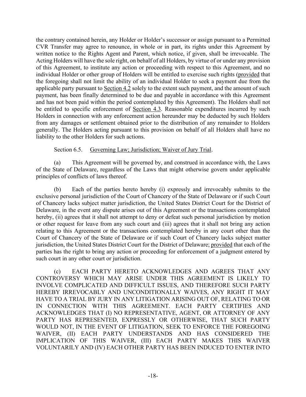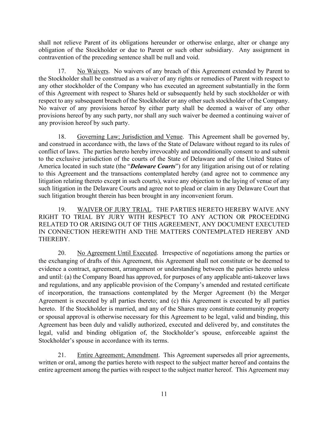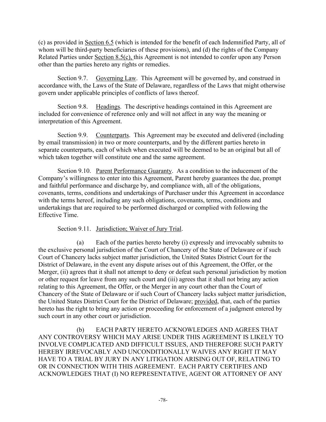 -78- (c) as provided in Section 6.5 (which is intended for the benefit of each Indemnified Party, all of whom will be third-party beneficiaries of these provisions), and (d) the rights of the Company Related Parties under Section 8.5(c), this Agreement is not intended to confer upon any Person other than the parties hereto any rights or remedies. Section 9.7. Governing Law. This Agreement will be governed by, and construed in accordance with, the Laws of the State of Delaware, regardless of the Laws that might otherwise govern under applicable principles of conflicts of laws thereof. Section 9.8. Headings. The descriptive headings contained in this Agreement are included for convenience of reference only and will not affect in any way the meaning or interpretation of this Agreement. Section 9.9. Counterparts. This Agreement may be executed and delivered (including by email transmission) in two or more counterparts, and by the different parties hereto in separate counterparts, each of which when executed will be deemed to be an original but all of which taken together will constitute one and the same agreement. Section 9.10. Parent Performance Guaranty. As a condition to the inducement of the Company’s willingness to enter into this Agreement, Parent hereby guarantees the due, prompt and faithful performance and discharge by, and compliance with, all of the obligations, covenants, terms, conditions and undertakings of Purchaser under this Agreement in accordance with the terms hereof, including any such obligations, covenants, terms, conditions and undertakings that are required to be performed discharged or complied with following the Effective Time. Section 9.11. Jurisdiction; Waiver of Jury Trial. (a) Each of the parties hereto hereby (i) expressly and irrevocably submits to the exclusive personal jurisdiction of the Court of Chancery of the State of Delaware or if such Court of Chancery lacks subject matter jurisdiction, the United States District Court for the District of Delaware, in the event any dispute arises out of this Agreement, the Offer, or the Merger, (ii) agrees that it shall not attempt to deny or defeat such personal jurisdiction by motion or other request for leave from any such court and (iii) agrees that it shall not bring any action relating to this Agreement, the Offer, or the Merger in any court other than the Court of Chancery of the State of Delaware or if such Court of Chancery lacks subject matter jurisdiction, the United States District Court for the District of Delaware; provided, that, each of the parties hereto has the right to bring any action or proceeding for enforcement of a judgment entered by such court in any other court or jurisdiction. (b) EACH PARTY HERETO ACKNOWLEDGES AND AGREES THAT ANY CONTROVERSY WHICH MAY ARISE UNDER THIS AGREEMENT IS LIKELY TO INVOLVE COMPLICATED AND DIFFICULT ISSUES, AND THEREFORE SUCH PARTY HEREBY IRREVOCABLY AND UNCONDITIONALLY WAIVES ANY RIGHT IT MAY HAVE TO A TRIAL BY JURY IN ANY LITIGATION ARISING OUT OF, RELATING TO OR IN CONNECTION WITH THIS AGREEMENT. EACH PARTY CERTIFIES AND ACKNOWLEDGES THAT (I) NO REPRESENTATIVE, AGENT OR ATTORNEY OF ANY