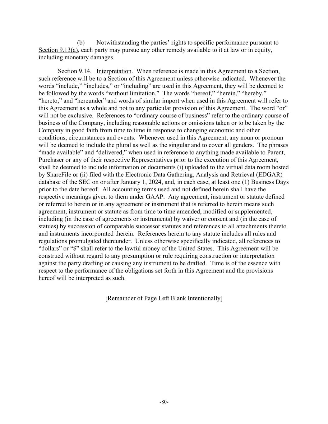 -80- (b) Notwithstanding the parties’ rights to specific performance pursuant to Section 9.13(a), each party may pursue any other remedy available to it at law or in equity, including monetary damages. Section 9.14. Interpretation. When reference is made in this Agreement to a Section, such reference will be to a Section of this Agreement unless otherwise indicated. Whenever the words “include,” “includes,” or “including” are used in this Agreement, they will be deemed to be followed by the words “without limitation.” The words “hereof,” “herein,” “hereby,” “hereto,” and “hereunder” and words of similar import when used in this Agreement will refer to this Agreement as a whole and not to any particular provision of this Agreement. The word “or” will not be exclusive. References to “ordinary course of business” refer to the ordinary course of business of the Company, including reasonable actions or omissions taken or to be taken by the Company in good faith from time to time in response to changing economic and other conditions, circumstances and events. Whenever used in this Agreement, any noun or pronoun will be deemed to include the plural as well as the singular and to cover all genders. The phrases “made available” and “delivered,” when used in reference to anything made available to Parent, Purchaser or any of their respective Representatives prior to the execution of this Agreement, shall be deemed to include information or documents (i) uploaded to the virtual data room hosted by ShareFile or (ii) filed with the Electronic Data Gathering, Analysis and Retrieval (EDGAR) database of the SEC on or after January 1, 2024, and, in each case, at least one (1) Business Days prior to the date hereof. All accounting terms used and not defined herein shall have the respective meanings given to them under GAAP. Any agreement, instrument or statute defined or referred to herein or in any agreement or instrument that is referred to herein means such agreement, instrument or statute as from time to time amended, modified or supplemented, including (in the case of agreements or instruments) by waiver or consent and (in the case of statues) by succession of comparable successor statutes and references to all attachments thereto and instruments incorporated therein. References herein to any statute includes all rules and regulations promulgated thereunder. Unless otherwise specifically indicated, all references to “dollars” or “$” shall refer to the lawful money of the United States. This Agreement will be construed without regard to any presumption or rule requiring construction or interpretation against the party drafting or causing any instrument to be drafted. Time is of the essence with respect to the performance of the obligations set forth in this Agreement and the provisions hereof will be interpreted as such. [Remainder of Page Left Blank Intentionally]