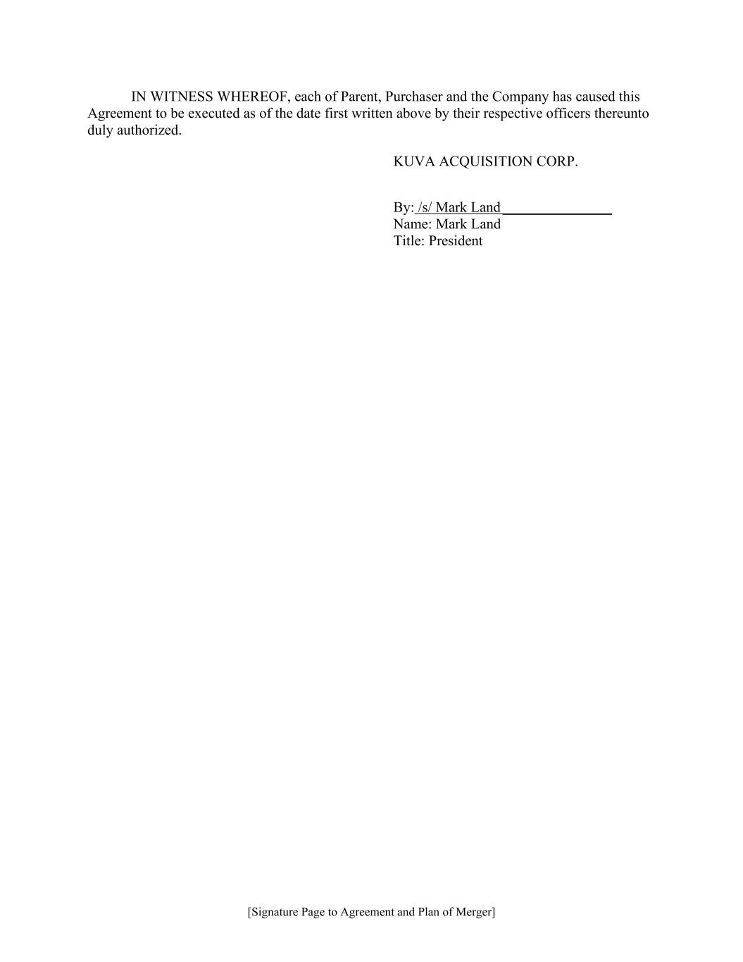 [Signature Page to Agreement and Plan of Merger] IN WITNESS WHEREOF, each of Parent, Purchaser and the Company has caused this Agreement to be executed as of the date first written above by their respective officers thereunto duly authorized. KUVA ACQUISITION CORP. By: /s/ Mark Land _______________ Name: Mark Land Title: President