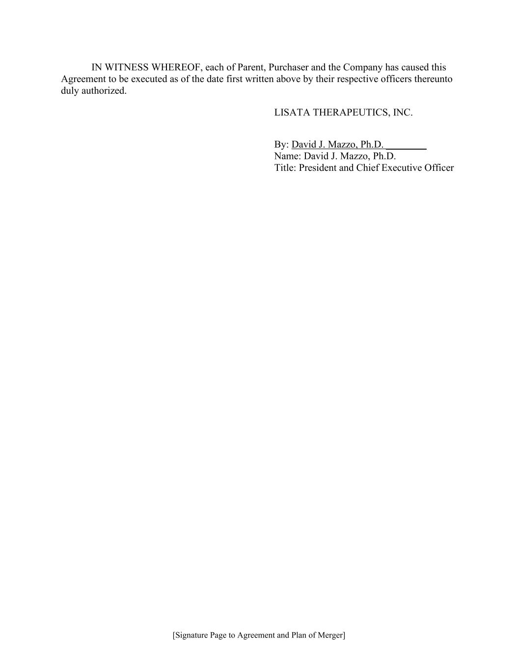 [Signature Page to Agreement and Plan of Merger] IN WITNESS WHEREOF, each of Parent, Purchaser and the Company has caused this Agreement to be executed as of the date first written above by their respective officers thereunto duly authorized. LISATA THERAPEUTICS, INC. By: David J. Mazzo, Ph.D. ________ Name: David J. Mazzo, Ph.D. Title: President and Chief Executive Officer
