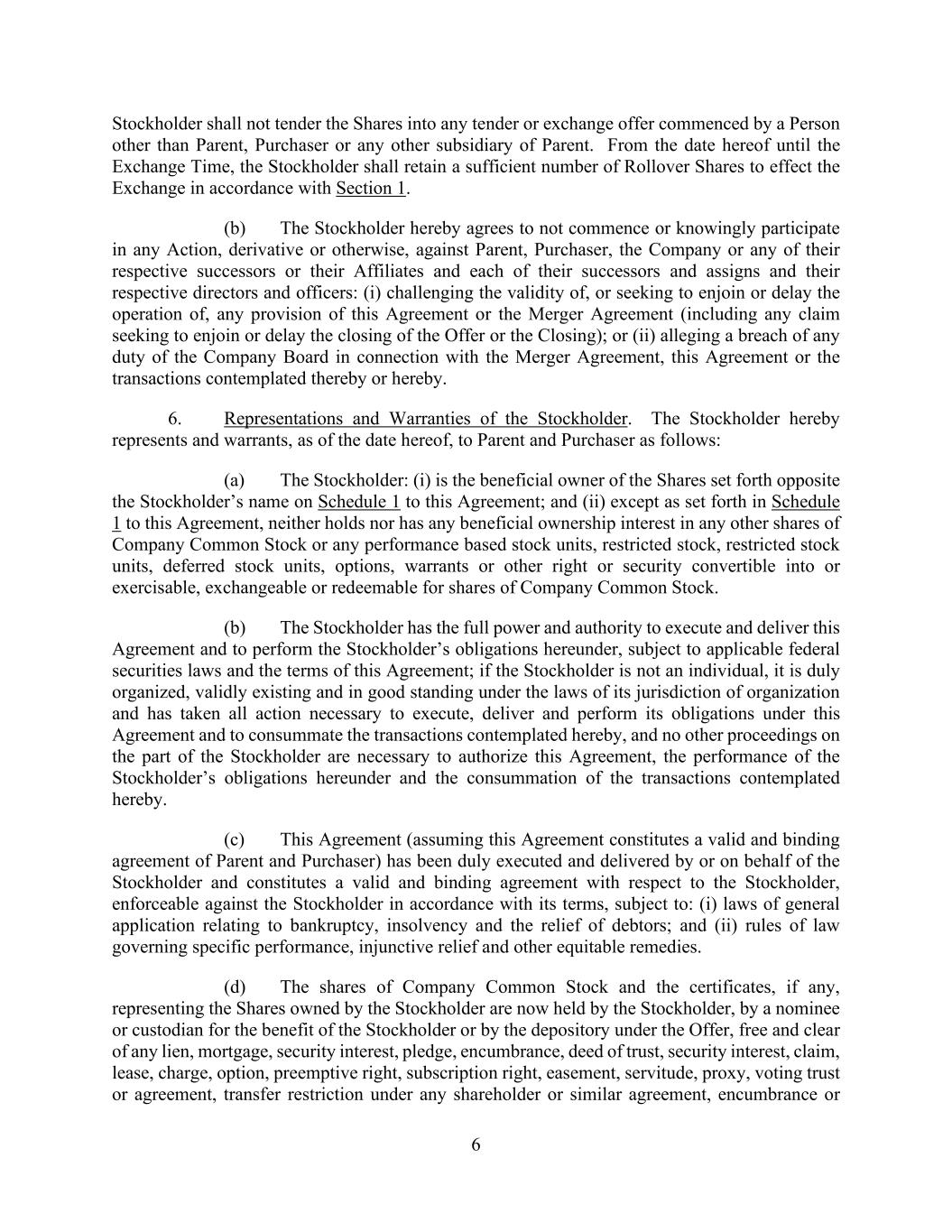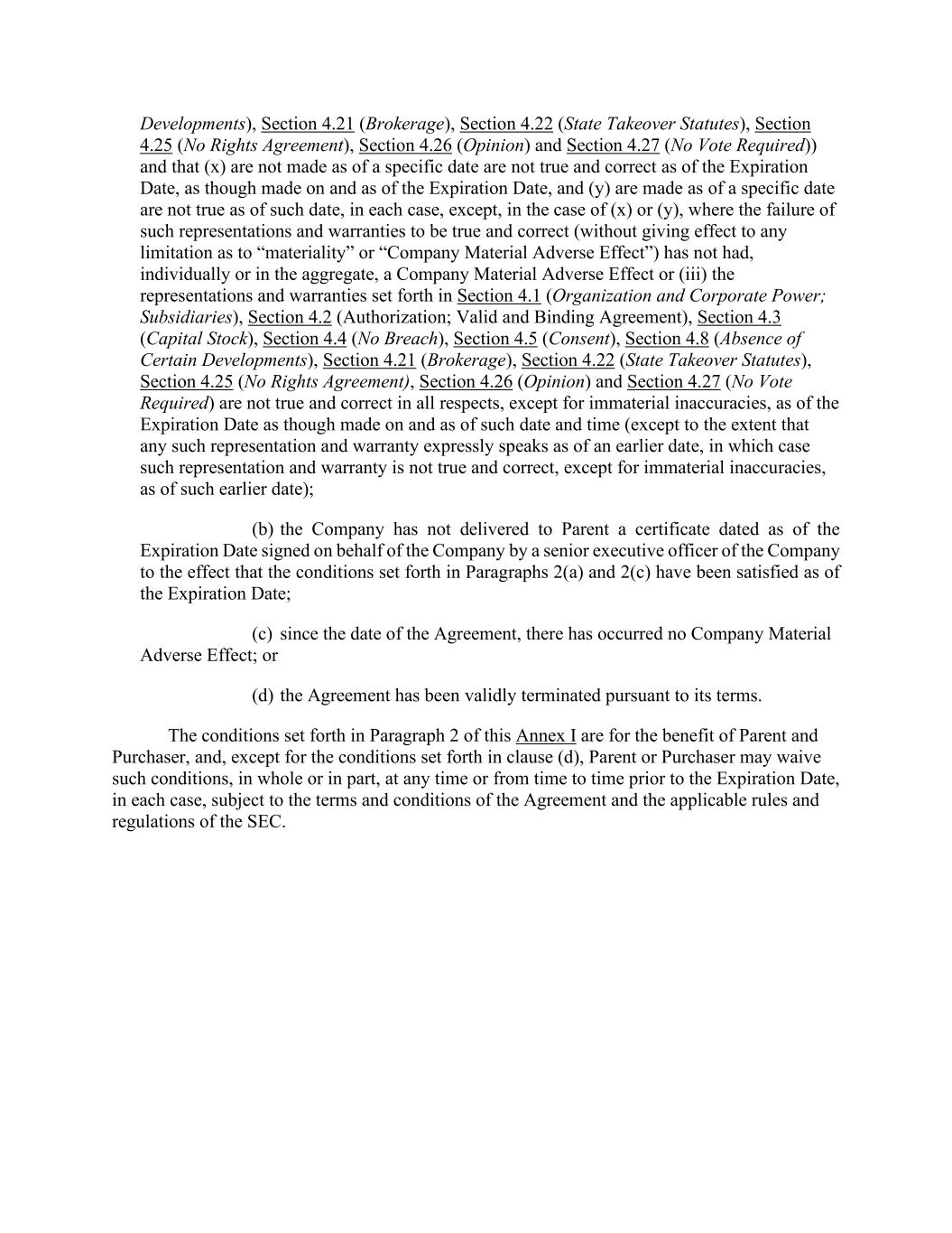 Developments), Section 4.21 (Brokerage), Section 4.22 (State Takeover Statutes), Section 4.25 (No Rights Agreement), Section 4.26 (Opinion) and Section 4.27 (No Vote Required)) and that (x) are not made as of a specific date are not true and correct as of the Expiration Date, as though made on and as of the Expiration Date, and (y) are made as of a specific date are not true as of such date, in each case, except, in the case of (x) or (y), where the failure of such representations and warranties to be true and correct (without giving effect to any limitation as to “materiality” or “Company Material Adverse Effect”) has not had, individually or in the aggregate, a Company Material Adverse Effect or (iii) the representations and warranties set forth in Section 4.1 (Organization and Corporate Power; Subsidiaries), Section 4.2 (Authorization; Valid and Binding Agreement), Section 4.3 (Capital Stock), Section 4.4 (No Breach), Section 4.5 (Consent), Section 4.8 (Absence of Certain Developments), Section 4.21 (Brokerage), Section 4.22 (State Takeover Statutes), Section 4.25 (No Rights Agreement), Section 4.26 (Opinion) and Section 4.27 (No Vote Required) are not true and correct in all respects, except for immaterial inaccuracies, as of the Expiration Date as though made on and as of such date and time (except to the extent that any such representation and warranty expressly speaks as of an earlier date, in which case such representation and warranty is not true and correct, except for immaterial inaccuracies, as of such earlier date); (b) the Company has not delivered to Parent a certificate dated as of the Expiration Date signed on behalf of the Company by a senior executive officer of the Company to the effect that the conditions set forth in Paragraphs 2(a) and 2(c) have been satisfied as of the Expiration Date; (c) since the date of the Agreement, there has occurred no Company Material Adverse Effect; or (d) the Agreement has been validly terminated pursuant to its terms. The conditions set forth in Paragraph 2 of this Annex I are for the benefit of Parent and Purchaser, and, except for the conditions set forth in clause (d), Parent or Purchaser may waive such conditions, in whole or in part, at any time or from time to time prior to the Expiration Date, in each case, subject to the terms and conditions of the Agreement and the applicable rules and regulations of the SEC.