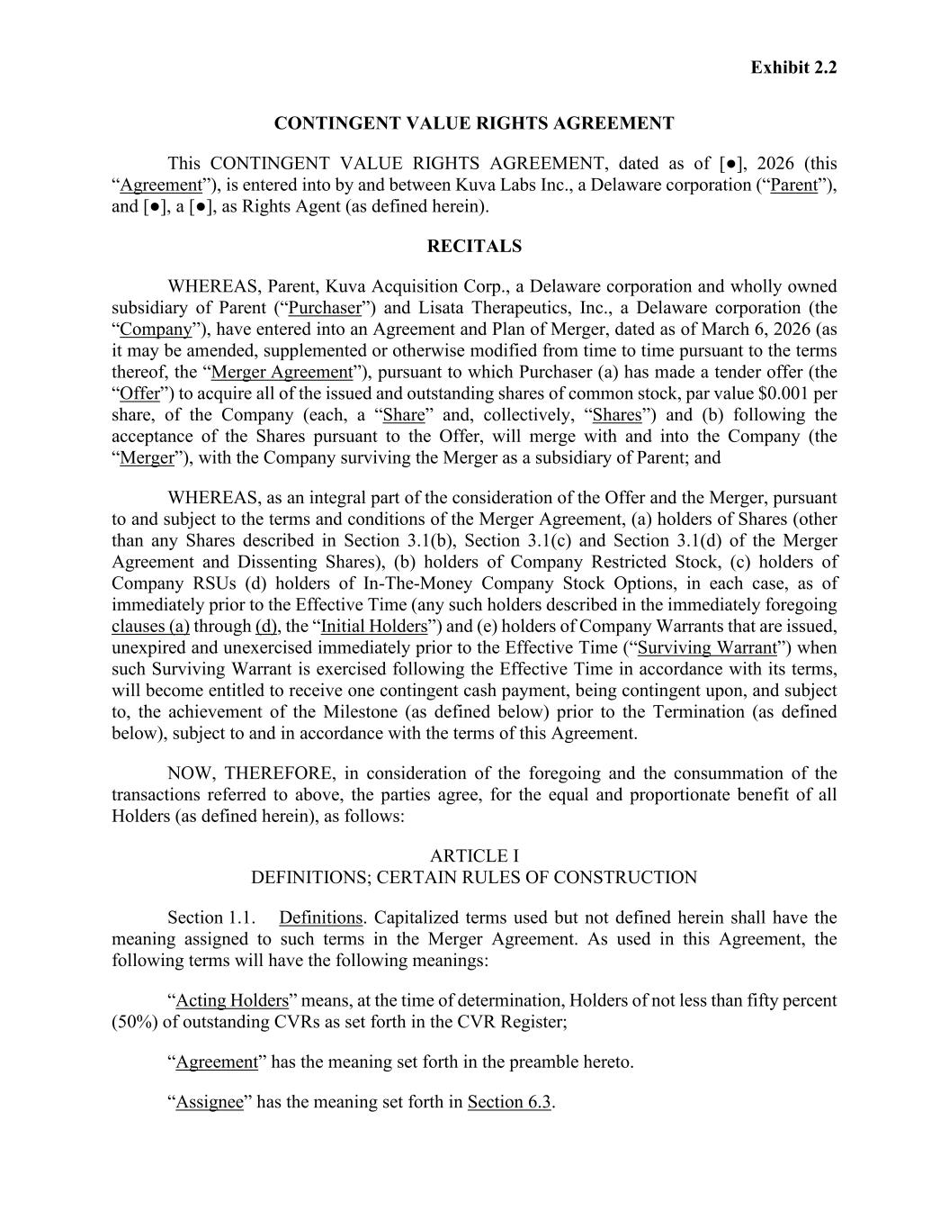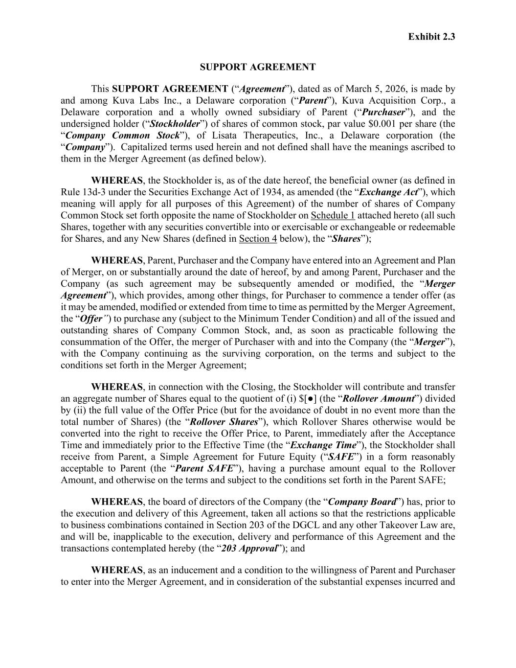 AGREEMENT AND PLAN OF MERGER AGREEMENT AND PLAN OF MERGER, dated as of March 6, 2026 (this “Agreement”), among Kuva Labs Inc., a Delaware corporation (“Parent”), Kuva Acquisition Corp., a Delaware corporation and directly wholly owned Subsidiary of Parent (“Purchaser”), and Lisata Therapeutics, Inc., a Delaware corporation (the “Company”). WHEREAS, the Company’s outstanding capital stock consists of shares of Company Common Stock (each, a “Common Share” and collectively, “Common Shares”) and shares of Company Preferred Stock (each, a “Preferred Share” and collectively, “Preferred Shares”) (Common Shares, together with Preferred Shares, “Shares”); WHEREAS, the boards of directors of Parent, Purchaser and the Company each have approved the acquisition of the Company on the terms and subject to the conditions set forth in this Agreement, and, accordingly, Purchaser has agreed to commence a tender offer (as it may be amended, modified or extended from time to time as permitted by this Agreement, the “Offer”) to purchase any (subject to the Minimum Tender Condition) and all of the issued and outstanding Common Shares, for $5.00 per Common Share, net to the seller in cash, without interest (the “Closing Amount”) plus one contingent value right per Share (a “CVR”) that shall represent the right to receive the Milestone Payment, as such term is defined in the Contingent Value Rights Agreement, in the form attached hereto as Annex V (the “CVR Agreement”) to be entered into between Parent and an agent selected by Parent and reasonably acceptable to the Company (the “Rights Agent”) at the times provided for in the CVR Agreement, net to the seller in cash, without interest (the Closing Amount plus one CVR, collectively, or any higher amount per Common Share paid pursuant to the Offer, the “Offer Price”) and less any applicable tax withholdings; WHEREAS, as soon as practicable following the consummation of the Offer, Purchaser will merge with and into the Company (the “Merger”) with the Company continuing as the surviving corporation, in accordance with Section 251(h) of the General Corporation Law of the State of Delaware (the “DGCL”), and (i) each Common Share that is issued and outstanding immediately prior to the Effective Time (other than Shares described in Section 3.1(b) and any Dissenting Shares) will be converted into the right to receive the Offer Price, without interest (the “Common Merger Consideration”) and (ii) each Preferred Share that is issued and outstanding immediately prior to the Effective Time (other than Shares described in Section 3.1(b) and any Dissenting Shares) will be converted into the right to receive $0.0005 (which represents the Cash Amount and Milestone Payment per Preferred Share, on an as converted to Company Common Stock basis) (the “Preferred Merger Consideration” and together, with the Common Merger Consideration, as applicable, the “Merger Consideration”), upon the terms and conditions set forth herein; WHEREAS, concurrently with the execution of this Agreement, and as a condition and inducement to the willingness of Parent and Purchaser to enter into this Agreement, the stockholders of the Company listed on Section 1.1 of the Company Disclosure Letter (the “Rollover Stockholders”) are entering into support agreements with Parent and Purchaser, substantially in the form attached hereto as Annex VI (each, a “Support Agreement”), pursuant to which, among other things, the Rollover Stockholders agree to contribute certain of