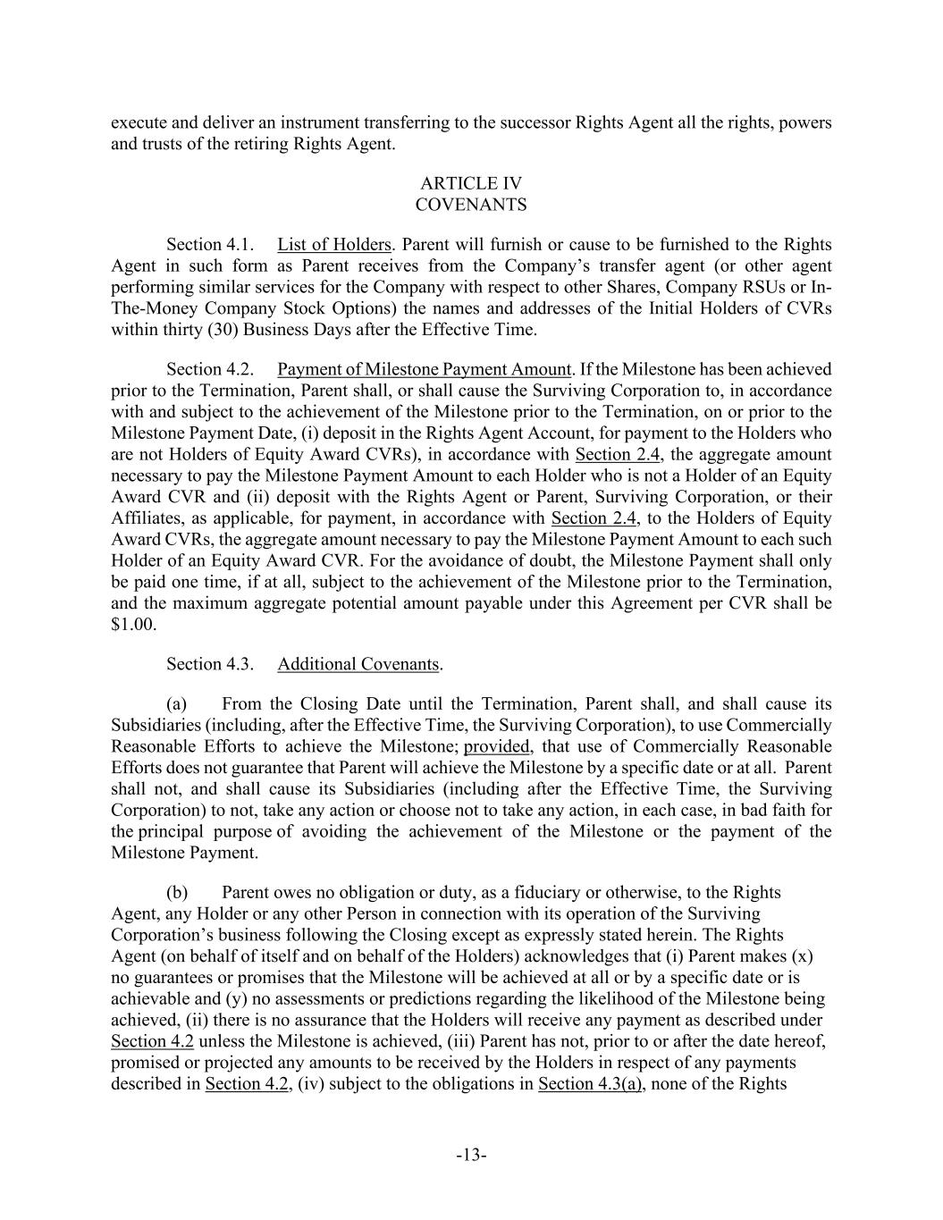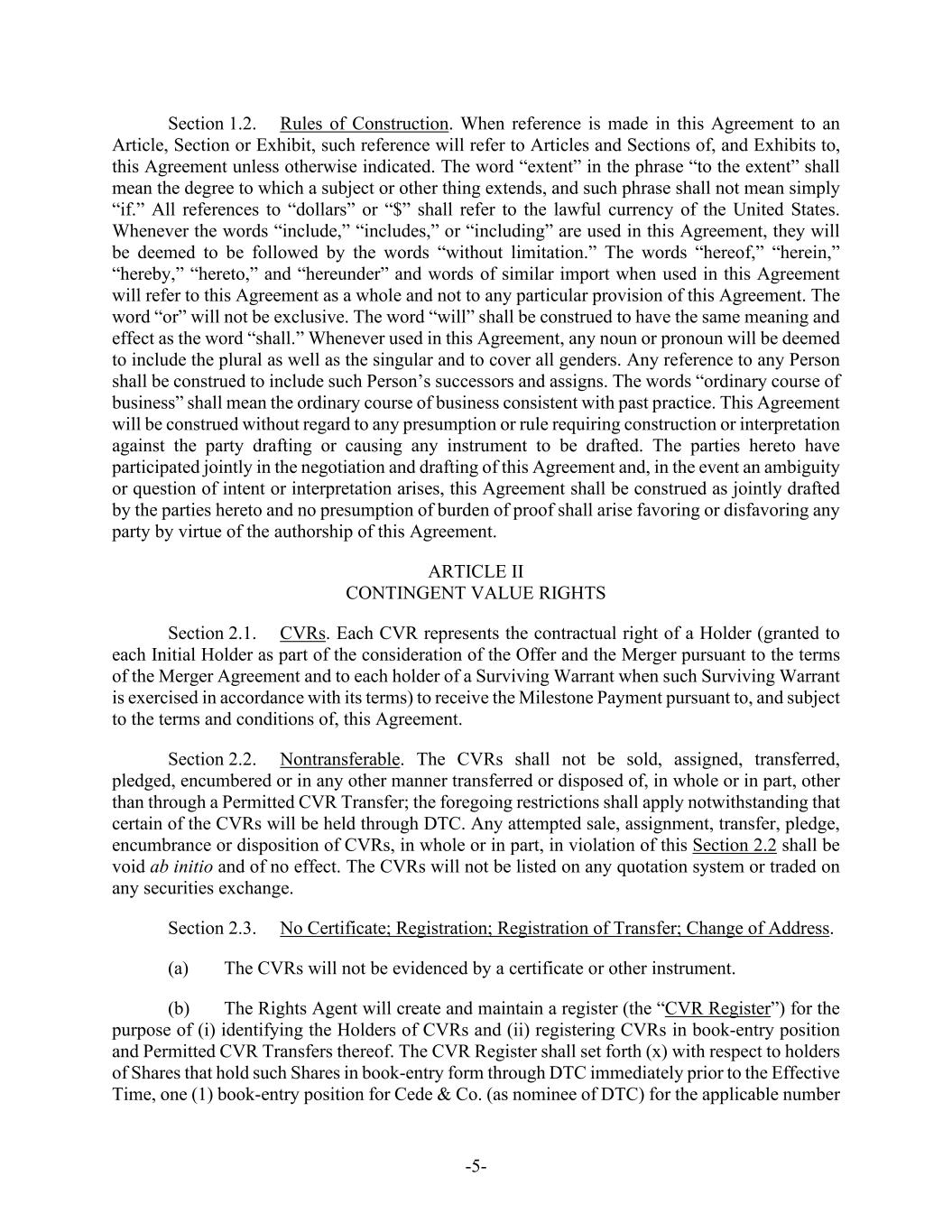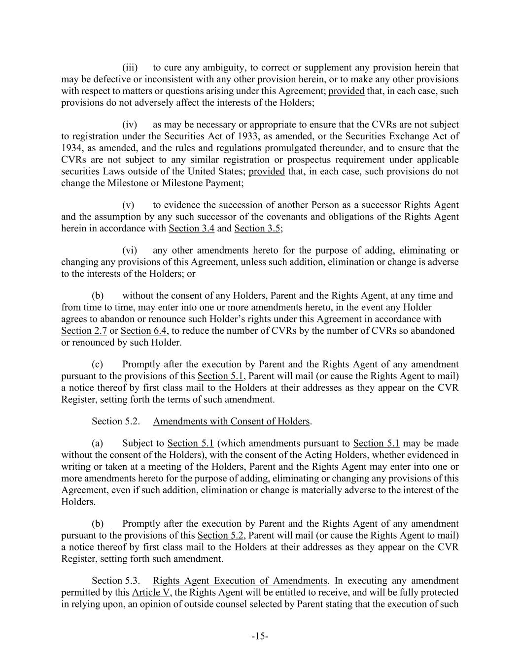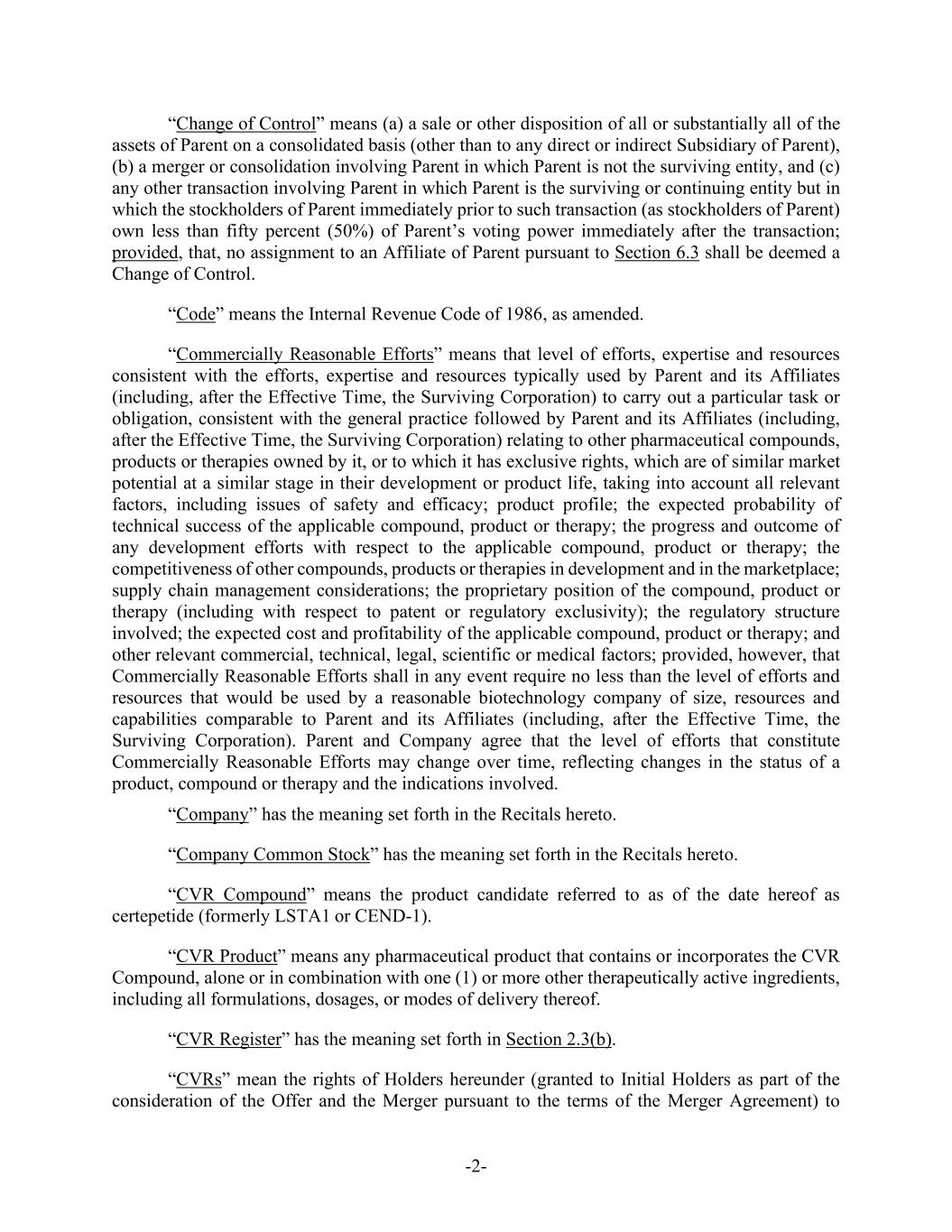 -5- Agreement and prior to (A) the payment by Purchaser for Common Shares validly tendered and not validly withdrawn in connection with the Offer (with respect to the Offer Price) or (B) the Effective Time (with respect to the Merger Consideration). (f) Parent shall, and shall direct the Rights Agent to, at or prior to the Acceptance Time, duly authorize, execute and deliver the CVR Agreement, subject to any reasonable revisions to the CVR Agreement that are requested by such Rights Agent (provided that such revisions are not, individually or in the aggregate, materially detrimental to the holders of CVRs). Parent and the Company shall cooperate, including by making changes to the form of CVR Agreement, as necessary to ensure that the CVRs are not subject to registration under the Securities Act, the Exchange Act or any applicable state securities or “blue sky” Laws. Section 1.2. Company Consent; Schedule 14D-9. As promptly as practicable on the date the Offer is commenced after the filing of the Offer Documents (but in no event later than the first (1st) Business Day following the date on which the Offer Documents are filed), the Company will file with the SEC a Solicitation/Recommendation Statement on Schedule 14D-9 (together with all amendments and supplements thereto, the “Schedule 14D-9”) containing, subject to the conditions set forth herein, the Company Board Recommendation. The Company will include in the Schedule 14D-9 the information required by Section 262(d)(2) of the DGCL such that the Schedule 14D-9 constitutes a notice of appraisal rights under Section 262(d)(2) of the DGCL. The Company will establish the Stockholder List Date as the record date for the purpose of receiving the notice required by Section 262(d)(2) of the DGCL; provided, that, such record date will not be more than ten (10) calendar days prior to the date that the Schedule 14D-9 is first mailed. The Company hereby consents to the inclusion of the Company Board Recommendation in the Offer Documents and, absent a Change of Board Recommendation, to the inclusion of a copy of the Schedule 14D-9 with the Offer Documents mailed or furnished to the holders of Shares. Parent and Purchaser, absent a Change of Board Recommendation, will disseminate a copy of the Schedule 14D-9 with the Offer Documents mailed or furnished to the holders of Shares. Parent and Purchaser will furnish promptly to the Company all information concerning Parent and Purchaser reasonably requested by the Company or required by applicable federal securities Laws to be set forth in the Schedule 14D-9. Except with respect to any amendments filed in connection with an Acquisition Proposal or a Change of Board Recommendation, Parent and Purchaser and their counsel will be given a reasonable opportunity to review and comment on the Schedule 14D-9 prior to its filing with the SEC (including any amendment or supplement thereto), and the Company will consider any comments from Parent, Purchaser or their counsel in good faith (it being understood that Parent and Purchaser and their counsel shall provide any comments thereon as soon as reasonably practicable). The Company will (i) promptly provide Parent, Purchaser and their counsel with a copy of any written comments (and/or a description of any oral comments) received by the Company or its counsel from the SEC or its staff with respect to the Schedule 14D-9, (ii) consult with Parent and Purchaser regarding any such comments prior to responding thereto, and consider any comments from Parent and Purchaser or their counsel in good faith, and (iii) promptly provide Parent and Purchaser with copies of any responses to any such comments, except, in the case of each of clause (i) through (iii), in connection with a Change of Board Recommendation. Each of the Company, Parent and Purchaser will promptly correct any information provided by it for use in the Schedule 14D-9 if and to the extent that it has become aware that such information has become false or misleading in any material respect. The Company will take all steps reasonably