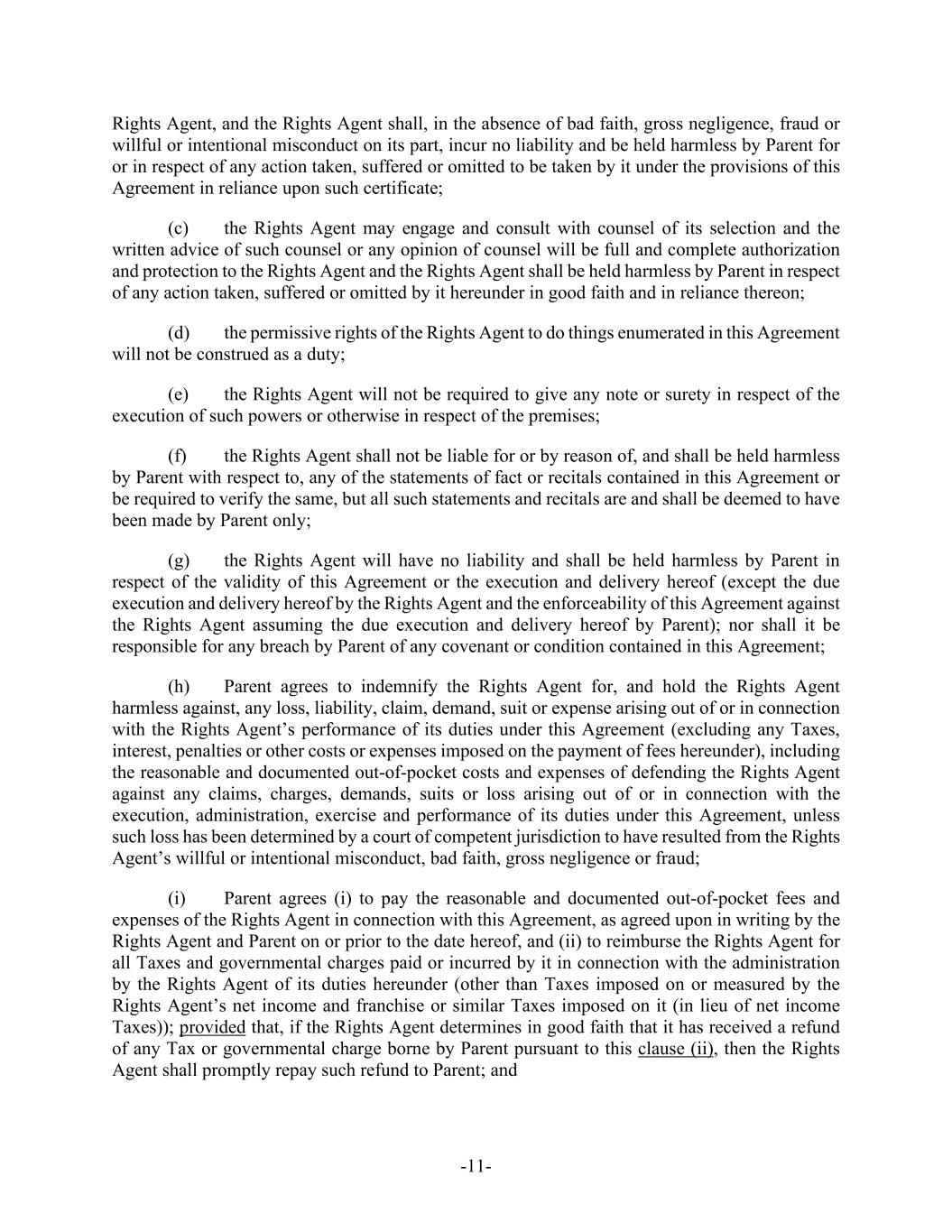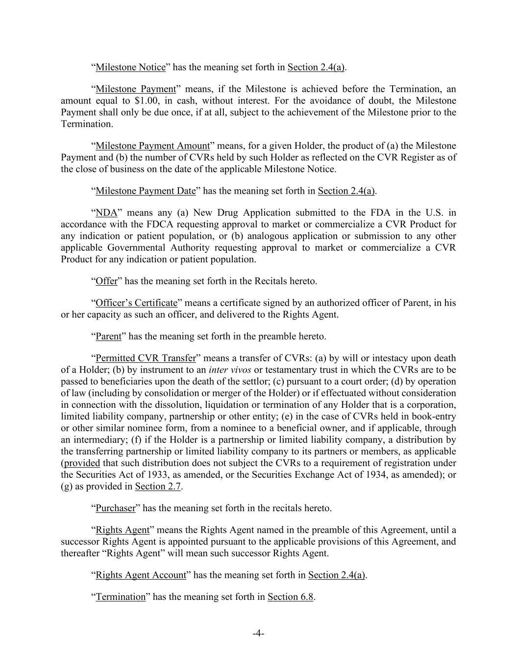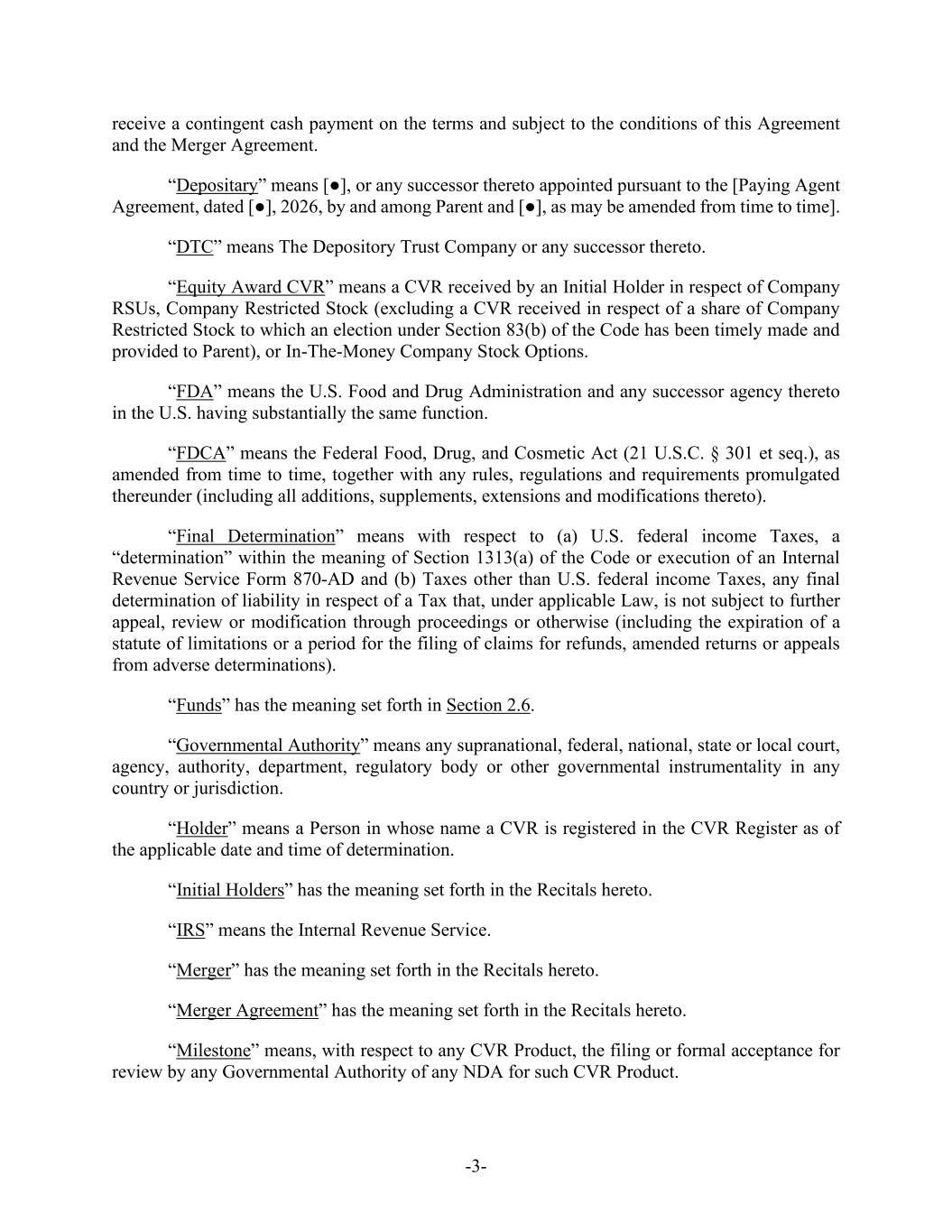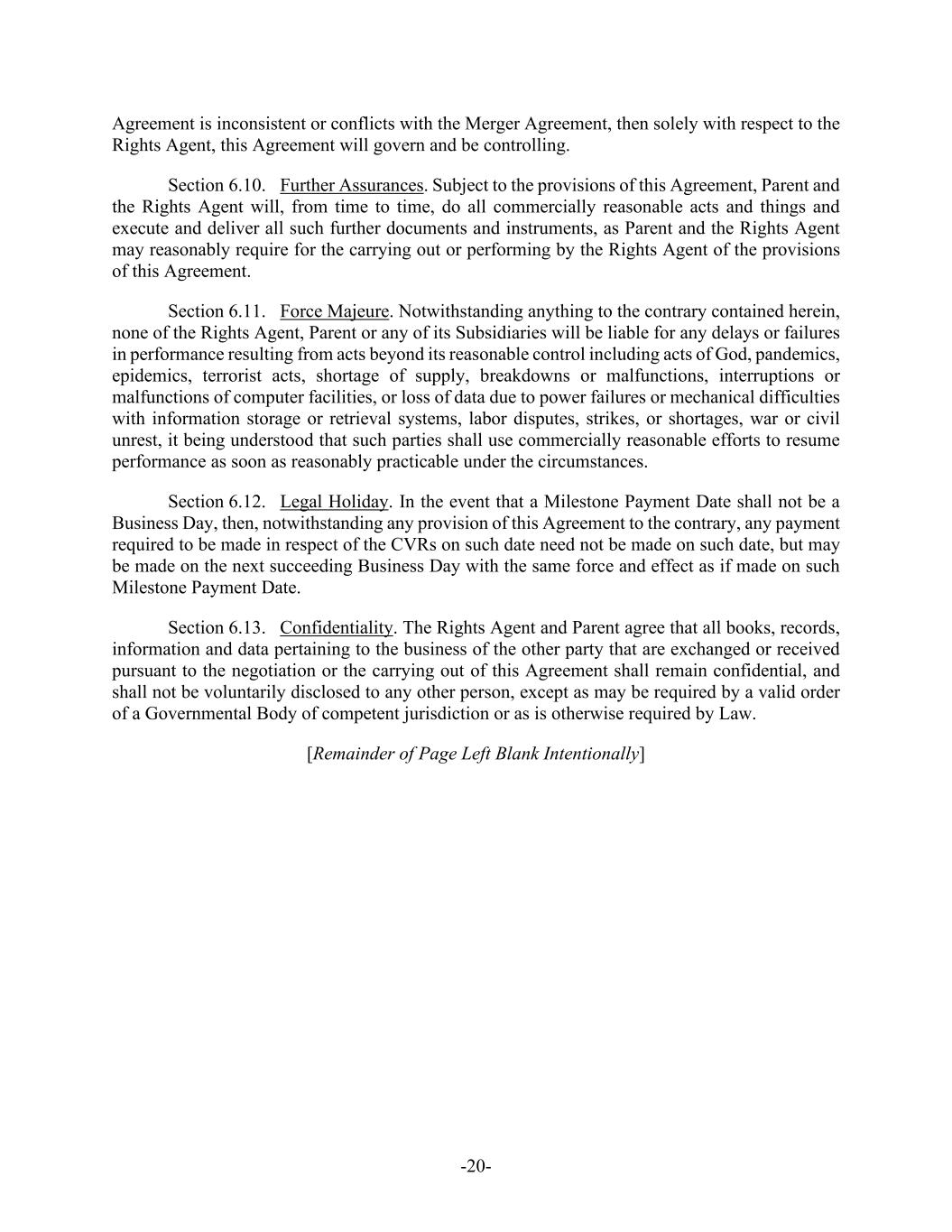 -5- Agreement and prior to (A) the payment by Purchaser for Common Shares validly tendered and not validly withdrawn in connection with the Offer (with respect to the Offer Price) or (B) the Effective Time (with respect to the Merger Consideration). (f) Parent shall, and shall direct the Rights Agent to, at or prior to the Acceptance Time, duly authorize, execute and deliver the CVR Agreement, subject to any reasonable revisions to the CVR Agreement that are requested by such Rights Agent (provided that such revisions are not, individually or in the aggregate, materially detrimental to the holders of CVRs). Parent and the Company shall cooperate, including by making changes to the form of CVR Agreement, as necessary to ensure that the CVRs are not subject to registration under the Securities Act, the Exchange Act or any applicable state securities or “blue sky” Laws. Section 1.2. Company Consent; Schedule 14D-9. As promptly as practicable on the date the Offer is commenced after the filing of the Offer Documents (but in no event later than the first (1st) Business Day following the date on which the Offer Documents are filed), the Company will file with the SEC a Solicitation/Recommendation Statement on Schedule 14D-9 (together with all amendments and supplements thereto, the “Schedule 14D-9”) containing, subject to the conditions set forth herein, the Company Board Recommendation. The Company will include in the Schedule 14D-9 the information required by Section 262(d)(2) of the DGCL such that the Schedule 14D-9 constitutes a notice of appraisal rights under Section 262(d)(2) of the DGCL. The Company will establish the Stockholder List Date as the record date for the purpose of receiving the notice required by Section 262(d)(2) of the DGCL; provided, that, such record date will not be more than ten (10) calendar days prior to the date that the Schedule 14D-9 is first mailed. The Company hereby consents to the inclusion of the Company Board Recommendation in the Offer Documents and, absent a Change of Board Recommendation, to the inclusion of a copy of the Schedule 14D-9 with the Offer Documents mailed or furnished to the holders of Shares. Parent and Purchaser, absent a Change of Board Recommendation, will disseminate a copy of the Schedule 14D-9 with the Offer Documents mailed or furnished to the holders of Shares. Parent and Purchaser will furnish promptly to the Company all information concerning Parent and Purchaser reasonably requested by the Company or required by applicable federal securities Laws to be set forth in the Schedule 14D-9. Except with respect to any amendments filed in connection with an Acquisition Proposal or a Change of Board Recommendation, Parent and Purchaser and their counsel will be given a reasonable opportunity to review and comment on the Schedule 14D-9 prior to its filing with the SEC (including any amendment or supplement thereto), and the Company will consider any comments from Parent, Purchaser or their counsel in good faith (it being understood that Parent and Purchaser and their counsel shall provide any comments thereon as soon as reasonably practicable). The Company will (i) promptly provide Parent, Purchaser and their counsel with a copy of any written comments (and/or a description of any oral comments) received by the Company or its counsel from the SEC or its staff with respect to the Schedule 14D-9, (ii) consult with Parent and Purchaser regarding any such comments prior to responding thereto, and consider any comments from Parent and Purchaser or their counsel in good faith, and (iii) promptly provide Parent and Purchaser with copies of any responses to any such comments, except, in the case of each of clause (i) through (iii), in connection with a Change of Board Recommendation. Each of the Company, Parent and Purchaser will promptly correct any information provided by it for use in the Schedule 14D-9 if and to the extent that it has become aware that such information has become false or misleading in any material respect. The Company will take all steps reasonably