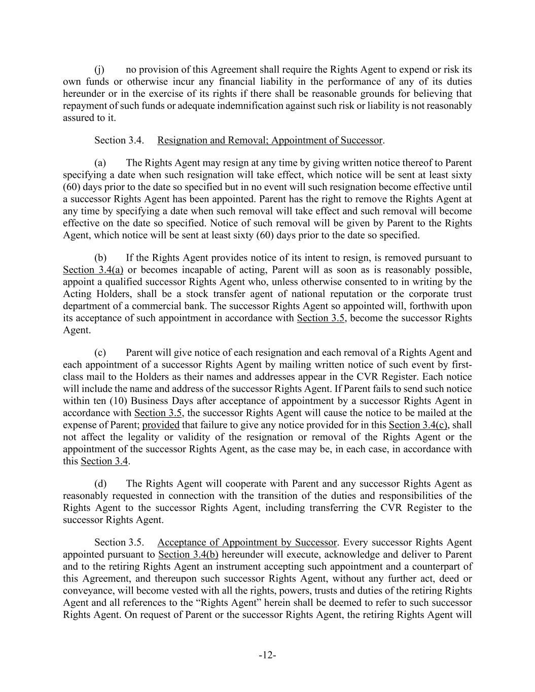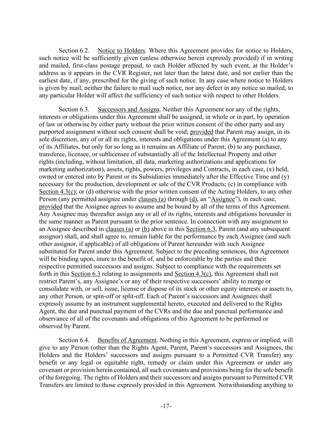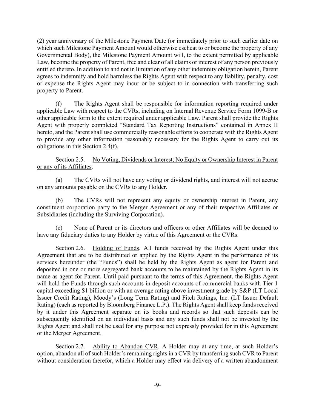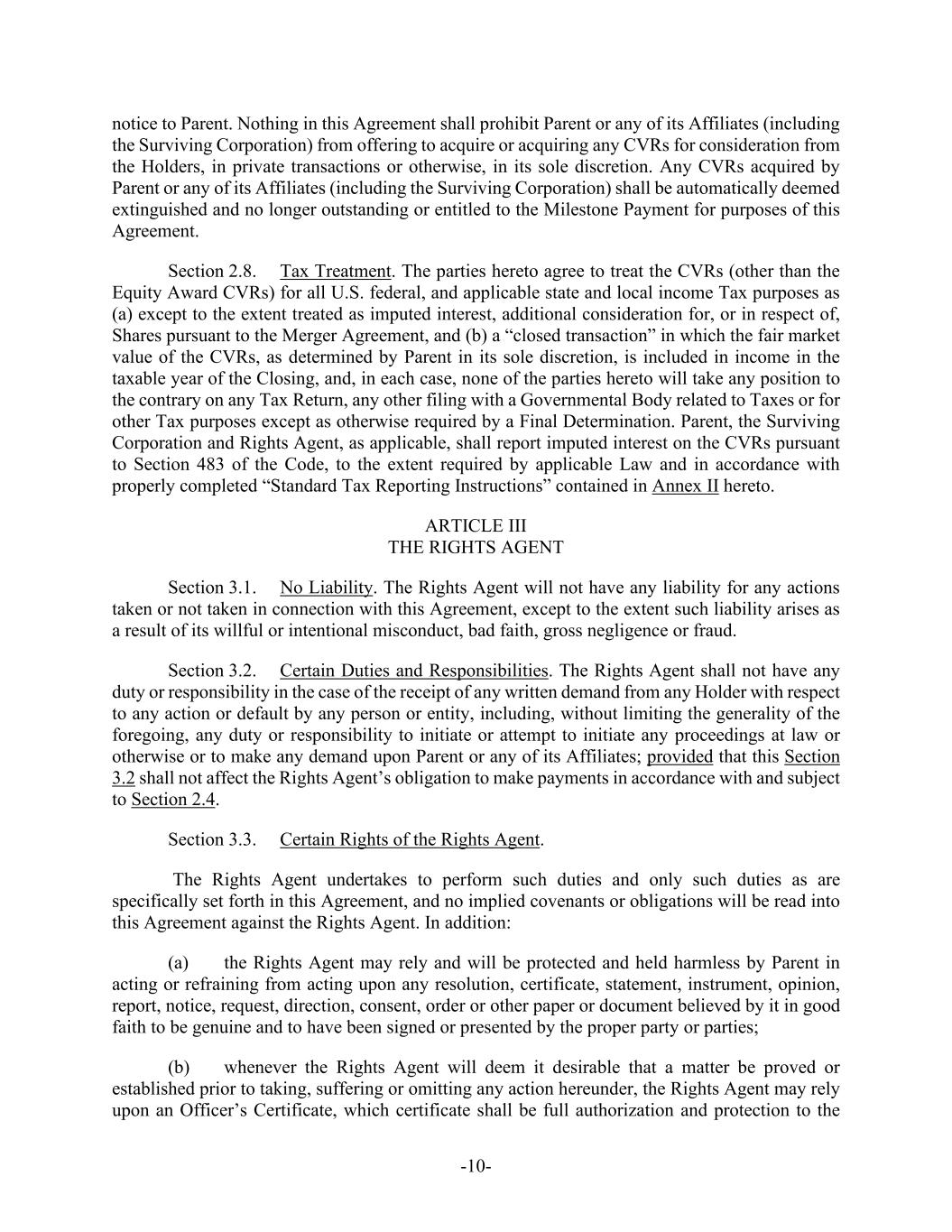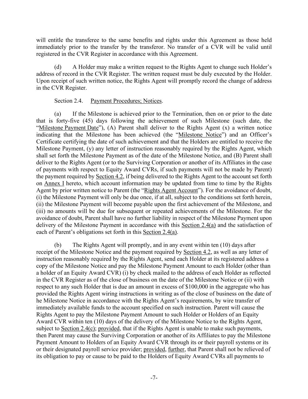 -12- other than to fund payments pursuant to Section 3.5(b), except as expressly provided for in this Agreement. Any portion of the cash made available to the Paying Agent in respect of any Dissenting Shares will be returned to Parent, upon demand. Parent shall not be required to deposit any funds related to any CVR with the Rights Agent unless and until such deposit is required pursuant to the CVR Agreement. (b) As promptly as practicable after the Effective Time (and in any event within two (2) Business Days thereafter), Parent will cause the Paying Agent to mail to each holder of record of a certificate (a “Certificate”) that immediately prior to the Effective Time represented outstanding Shares which were converted pursuant to Section 3.1 into the right to receive the Merger Consideration, (i) a letter of transmittal in customary form reasonably acceptable to Parent and the Company (which will (x) specify that delivery will be effected, and risk of loss and title to the Certificate will pass, only upon delivery of such Certificate to the Paying Agent and (y) contain such other provisions as are customary and reasonably acceptable to Parent and the Company) and (ii) instructions for effecting the surrender of the Certificate, as well as a duly completed letter of transmittal, and such other customary documents, each in a form reasonably acceptable to the Company and Parent, as may be reasonably required to be delivered pursuant to the instructions contained in the letter of transmittal, in exchange for payment of the Merger Consideration payable pursuant to this Agreement. Upon surrender of a Certificate for cancellation to the Paying Agent or to such other agent or agents as may be appointed by Parent, together with such letter of transmittal, duly executed and properly completed, and such other customary documents, each in a form reasonably acceptable to the Company and Parent, as may be reasonably required to be delivered pursuant to the instructions of such letter of transmittal, the holder of such Certificate will be entitled to receive in exchange therefor Merger Consideration for each Share formerly represented by such Certificate, and the Certificate so surrendered will be cancelled. Until surrendered as contemplated by this Section 3.5(b), each Certificate will be deemed, at any time after the Effective Time, to represent only the right to receive the Merger Consideration and will not evidence any interest in, or any right to exercise the rights of a stockholder or other equity holder of, the Company or the Surviving Corporation; provided, that, notwithstanding the foregoing, in the event of a transfer of ownership of Shares that is not registered in the transfer records of the Company, payment of the Merger Consideration in respect of the applicable Shares may be made to a Person other than the Person in whose name the Certificates so surrendered are registered if such Certificates are properly endorsed or otherwise are in proper form for transfer and the Person requesting such payment pays any transfer or other Taxes required by reason of the payment of the Merger Consideration in respect thereof or establishes, to the reasonable satisfaction of the Surviving Corporation, that such Tax has been paid or is not applicable. No interest shall be paid or accrue on the cash payable upon surrender of any Certificate. (c) A holder of record of book-entry Shares (“Book-Entry Shares”) that immediately prior to the Effective Time represented outstanding Shares which were converted pursuant to Section 3.1 into the right to receive Merger Consideration will, upon receipt by the Paying Agent of an “agent’s message” in customary form (or such other evidence, if any, as the Paying Agent may reasonably request), be entitled to receive in exchange for such Book-Entry Shares, Merger Consideration for each Share formerly represented by such Book-Entry Share, and such Book-Entry Share will be cancelled. Payment of the Merger Consideration with respect to Book-Entry Shares will only be made to the Person in whose name such Book-Entry