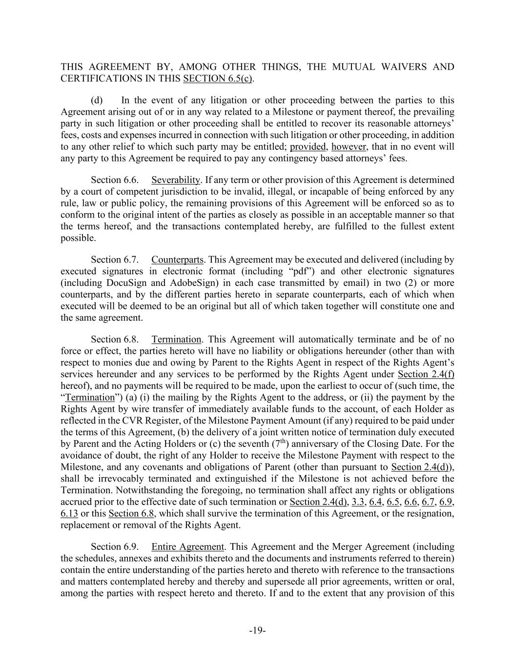 -77- Terms Not Defined in this Section 9.3 Section Rollover Shares Recitals Rollover Stockholders Recitals Sarbanes-Oxley Section 4.9(d) Share Recitals Schedule 14D-9 Section 1.2 Schedule TO Section 1.1(b) Stockholder List Date Section 1.3 Stockholder Litigation Section 6.12 Support Agreement Recitals Surviving Corporation Section 2.1 Takeover Laws Section 4.22 Trade Controls Section 4.20(i) WARN Section 4.19(e) Section 9.4. Severability. If any term or other provision of this Agreement is determined by a court of competent jurisdiction to be invalid, illegal, or incapable of being enforced by any rule of law or public policy, the remaining provisions of this Agreement will be enforced so as to conform to the original intent of the parties as closely as possible in a mutually acceptable manner so that the Contemplated Transactions are fulfilled to the fullest extent possible. Section 9.5. Assignment. This Agreement may not be assigned by operation of law or otherwise without the prior written consent of each of the other parties and any attempted assignment of this Agreement or any of such rights without such consent shall be void and of no effect; provided, however, Parent or Purchaser may assign this Agreement to any of their Affiliates; provided, further, that, (i) such assignment shall not impede or delay the consummation of the Contemplated Transactions or otherwise impede the rights of the express beneficiaries of this Agreement under Section 9.6 and (ii) no such assignment shall relieve Parent or Purchaser of its obligations hereunder. Section 9.6. Entire Agreement; Third-Party Beneficiaries. This Agreement (together with the collateral documents, exhibits and instruments referred to therein), the CVR Agreement, the Support Agreements, the Capital Commitment Letter and the Confidentiality Agreement constitute the entire agreement and supersede all prior agreements and understandings, both written and oral, among the parties with respect to the subject matter hereof; provided, however, that the Confidentiality Agreement will survive the execution or termination of this Agreement and remain in full force and effect, and provided, further, that if the Effective Time occurs, the Confidentiality Agreement shall automatically terminate and be of no further force and effect. Except for (a) the rights of the stockholders of the Company to receive the Offer Price and the Merger Consideration, and the holders of Company Equity Awards to receive the consideration described in Section 3.2, (b) the right of the Company, on behalf of the stockholders of the Company and the holders of Company Equity Awards (each of which are third party beneficiaries hereunder to the extent required for this clause (b) to be enforceable), to pursue specific performance as set forth in Section 9.13 or, if specific performance is not sought or granted as a remedy, damages in the event of Parent’s or Purchaser’s breach of this Agreement,