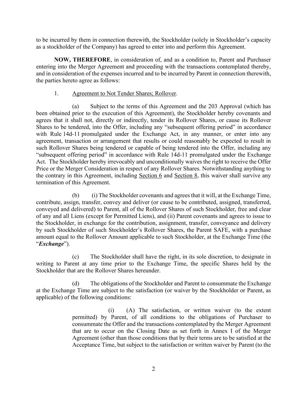 -2- their shares of Company Common Stock (the “Rollover Shares”) held by the Rollover Stockholders to Parent, in the amount and as specified in the Support Agreement; WHEREAS, prior to or concurrently with the execution of this Agreement, and as a condition and inducement to the Company’s willingness to enter into this Agreement, the Capital Investor (as defined below) has entered into a Capital Commitment Letter (as defined below); WHEREAS, the board of directors of the Company (the “Company Board”) has unanimously (i) determined that this Agreement and the Contemplated Transactions, including the Offer and the Merger, are advisable and fair to, and in the best interests of, the Company and the holders of Shares, (ii) adopted this Agreement and approved the execution, delivery and performance by the Company of this Agreement and the consummation of the Contemplated Transactions, including the Offer and the Merger, and (iii) resolved to recommend that the holders of Common Shares accept the Offer and tender their Common Shares pursuant to the Offer; WHEREAS, the boards of directors of Parent and Purchaser each have (i) declared it advisable for Parent and Purchaser, respectively, to enter into this Agreement and consummate the Contemplated Transactions, including the Offer and the Merger, and (ii) adopted this Agreement and approved the execution, delivery and performance by Parent and the Purchaser of this Agreement and the consummation of the Contemplated Transactions, including the Offer and the Merger; WHEREAS, the sole stockholder of Purchaser will approve and adopt this Agreement promptly following its execution; NOW, THEREFORE, in consideration of the foregoing and the mutual covenants and agreements herein contained, and intending to be legally bound hereby, Parent, Purchaser and the Company hereby agree as follows: ARTICLE I THE OFFER Section 1.1. The Offer. (a) Provided that this Agreement shall not have been terminated in accordance with Article VIII, subject to the terms and conditions of this Agreement, (i) Purchaser will, and Parent will cause Purchaser to, as promptly as practicable after the date of this Agreement ((A) but in no event later than the twentieth (20th) Business Day following the date of this Agreement, provided, that if the principal offices of the SEC in Washington, D.C. are not open to accept filings on such date, the first (1st) day after such date that the principal offices of the SEC in Washington, D.C. are open to accept filings, and (B) without the consent of the Company, not to be unreasonably withheld, conditioned or delayed, in no event earlier than the date specified in clause (A)), commence (within the meaning of Rule 14d-2 under the Securities Exchange Act of 1934, as amended (together with the rules and regulations promulgated thereunder, the “Exchange Act”)) the Offer to purchase for cash any (subject to the Minimum Tender Condition) and all Common Shares at the Offer Price. The obligation of Purchaser (and of Parent to cause