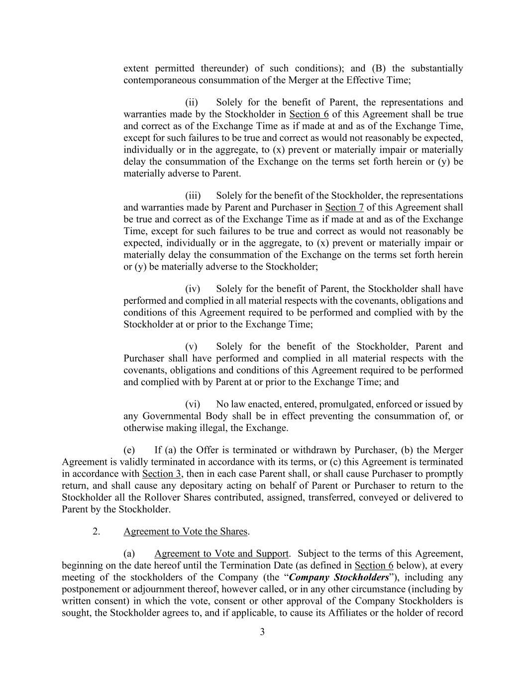 -58- ARTICLE VII CONDITIONS OF MERGER Section 7.1. Conditions to Obligation of Each Party to Effect the Merger. The respective obligations of each party to effect the Merger are subject to the satisfaction at or prior to the Effective Time of each of the following conditions: (a) No order, injunction or decree issued by any Governmental Body of competent jurisdiction restraining, making illegal, enjoining or otherwise prohibiting the consummation of the Merger is in effect. No statute, rule, regulation, order, injunction or decree has been enacted, entered, promulgated or enforced (and continues to be in effect) by any Governmental Body that restrains, makes illegal or otherwise prohibits the consummation of the Merger. (b) Purchaser has irrevocably accepted for purchase the Shares validly tendered (and not validly withdrawn) pursuant to the Offer. ARTICLE VIII TERMINATION, AMENDMENT AND WAIVER Section 8.1. Termination by Mutual Agreement. This Agreement may be terminated, and the Offer and the Merger may be abandoned, at any time prior to the Acceptance Time, by mutual written consent of Parent and the Company. Section 8.2. Termination by Either Parent or the Company. This Agreement may be terminated, and the Offer and the Merger may be abandoned, at any time prior to the Acceptance Time, by Parent or the Company if: (a) any court of competent jurisdiction or other Governmental Body of competent jurisdiction has issued a final order, decree or ruling, or taken any other final action permanently restraining, enjoining or otherwise prohibiting the Offer or the Merger, and such order, decree, ruling or other action has become final and non-appealable; provided, however, that the terms of this Section 8.2(a) are not available to any party unless such party has complied with its obligations under this Agreement in all material respects, including Section 6.6; or (b) the Acceptance Time has not occurred on or prior to July 1, 2026 (the “Outside Date”); provided, however, that right to terminate pursuant to this Section 8.2(b) is not available (i) to any party unless such party has complied in all material respects with its obligations under this Agreement, including Section 6.6 or (ii) to either party at any time the parties are litigating obligations under this Agreement. Section 8.3. Termination by the Company. This Agreement may be terminated, and the Offer and the Merger may be abandoned, at any time prior to the Acceptance Time, by the Company if: (a) (i) Purchaser fails to timely commence the Offer in violation of Section 1.1, except if a breach by the Company of its obligations pursuant to Section 1.1(b) or Section 1.3 is the primary cause of such failure, (ii) the Offer has expired or has been terminated without