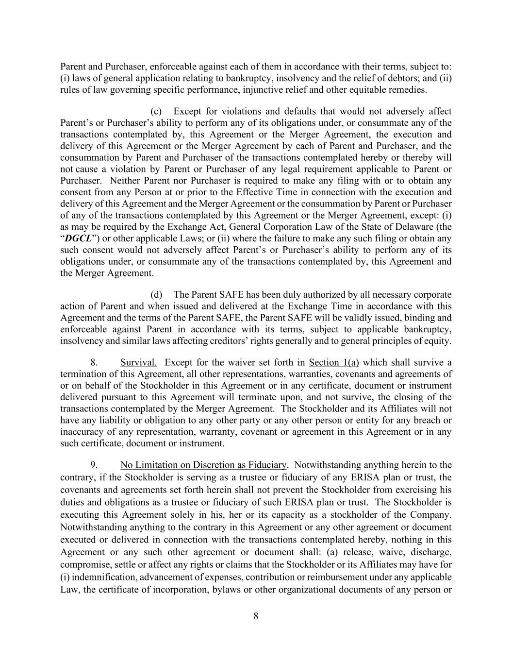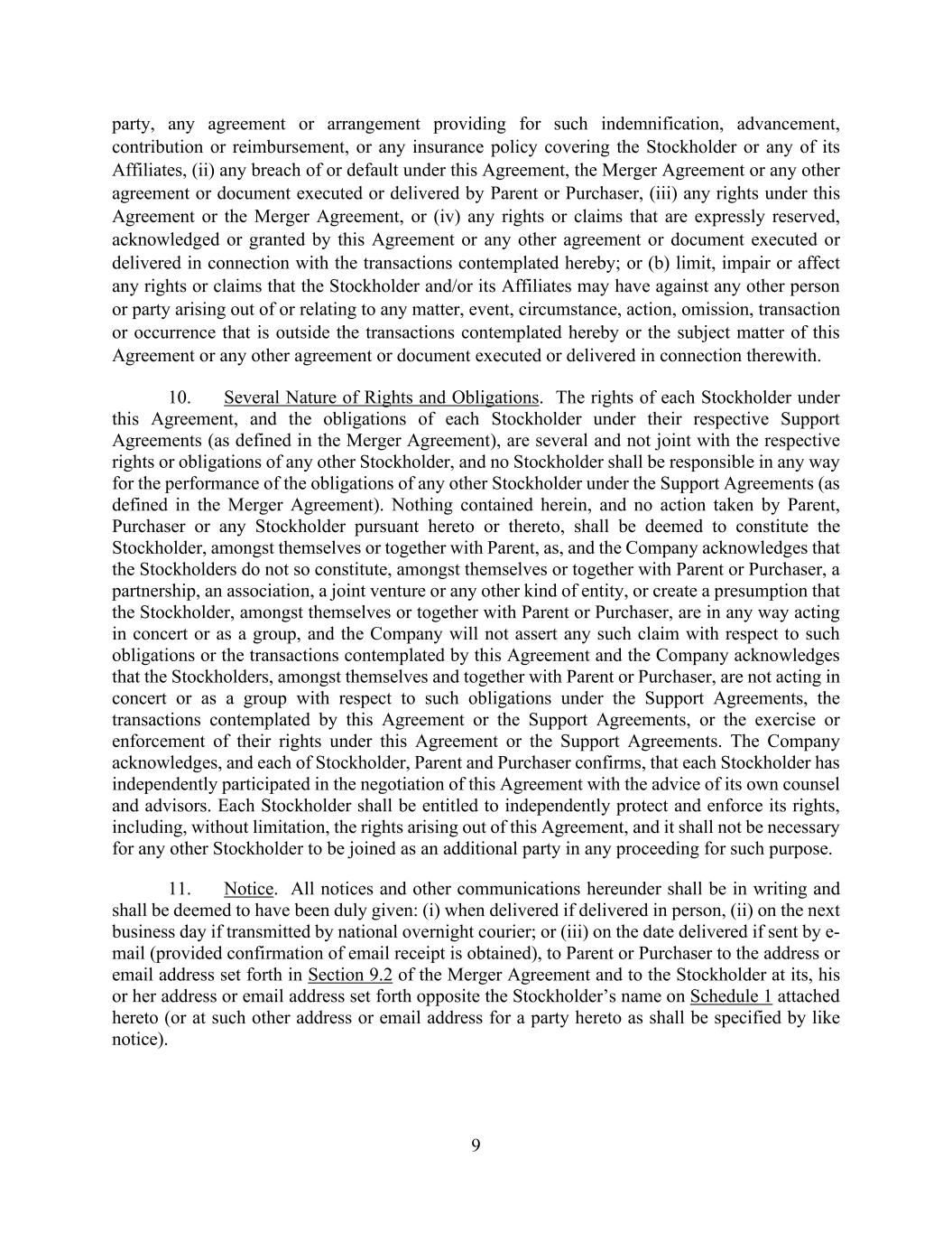 -62- Agreement or the Contemplated Transactions. For the avoidance of doubt, nothing in this Section 8.5(d) limits the liability of any party in the event of Fraud or Willful Breach, which shall include Enforcement Costs. While Parent may pursue both a grant of specific performance in accordance with Section 9.13 and the payment of the Company Termination Fee under this Section 8.5, under no circumstances shall Parent be permitted or entitled to receive both a grant of specific performance that results in a Closing and any money damages (other than Enforcement Costs), including all or any portion of the Company Termination Fee. While the Company may pursue both a grant of specific performance in accordance with Section 9.13 and the payment of the Parent Termination Fee under this Section 8.5, under no circumstances shall Company be permitted or entitled to receive both a grant of specific performance that results in a Closing and any money damages (other than Enforcement Costs), including all or any portion of the Parent Termination Fee. Section 8.6. Expenses. Except as otherwise specifically provided herein, each party will bear its own expenses in connection with this Agreement and the Contemplated Transactions. Section 8.7. Amendment and Waiver. This Agreement may not be amended except by an instrument in writing signed by the parties hereto prior to the Acceptance Time. At any time prior to the Acceptance Time, the Company, on the one hand, and Parent and Purchaser, on the other hand, may (a) extend the time for the performance of any of the obligations or other acts of the other, (b) waive any inaccuracies in the representations and warranties of the other contained herein or in any document delivered pursuant hereto, and (c) subject to the requirements of applicable Law, waive compliance by the other with any of the agreements or conditions contained herein, except that the Minimum Tender Condition may only be waived by Purchaser with the prior written consent of the Company. Any such extension or waiver will be valid only if set forth in an instrument in writing signed by the party or parties to be bound thereby. The failure of any party to assert any rights or remedies will not constitute a waiver of such rights or remedies. ARTICLE IX GENERAL PROVISIONS Section 9.1. Non-Survival of Representations, Warranties, Covenants and Agreements. None of the representations, warranties, covenants and agreements in this Agreement or in any instrument delivered pursuant to this Agreement will survive the Effective Time, except for (a) those covenants and agreements contained herein that by their terms apply or are to be performed in whole or in part after the Effective Time and (b) this Article IX. The Confidentiality Agreement will survive termination of this Agreement in accordance with its terms. Section 9.2. Notices. All notices, requests, claims, demands and other communications hereunder must be in writing and must be given (and will be deemed to have been duly given): (a) when delivered, if delivered in Person, (b) when sent, if sent by email (assuming no “Bounce- Back” message is received), (c) three (3) Business Days after sending, if sent by registered or certified mail (postage prepaid, return receipt requested) and (d) one (1) Business Day after sending, if sent by overnight courier, in each case, to the respective parties at the following addresses (or at such other address for a party as have been specified by like notice):
