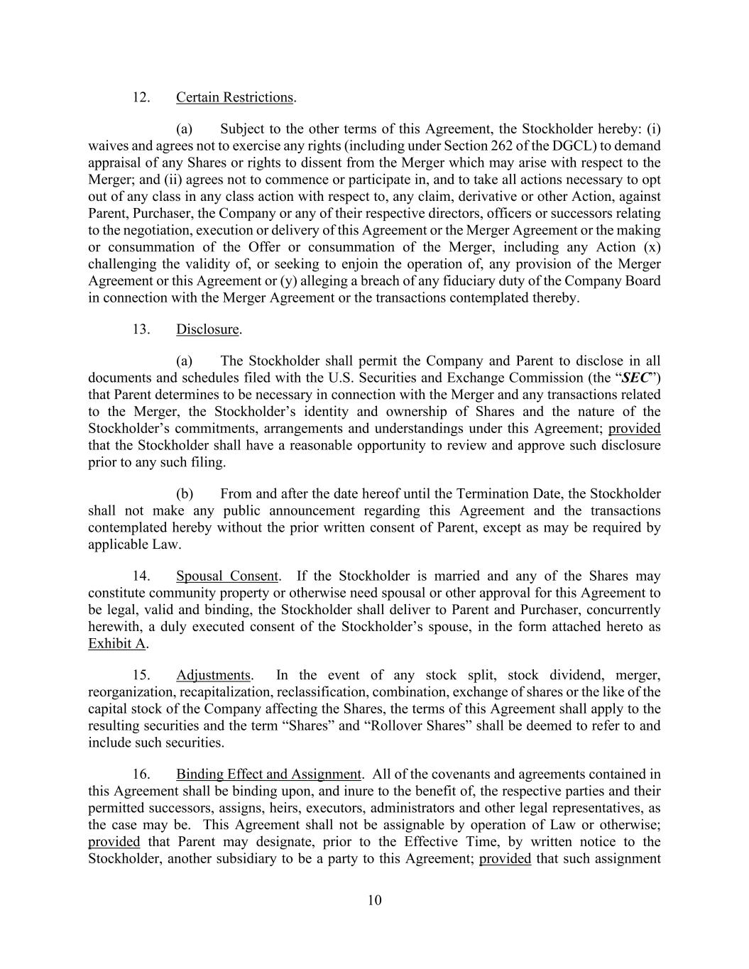 -55- exchange to which the relevant party is subject, in which case the party required to make the release, announcement or disclosure will use commercially reasonable efforts to allow each other party reasonable time to comment on such release or announcement in advance of such issuance; it being understood that the final form and content of any such release or announcement, to the extent so required, will be at the final discretion of the disclosing party. The restrictions of this Section 6.7 do not apply to communications by the Company in connection with evaluation of a potential Change of Board Recommendation or following a Change of Board Recommendation or any dispute or Action among the parties to this Agreement. Notwithstanding the foregoing, each party may, without complying with the foregoing obligations, make internal announcements to employees that are not publicly disclosed or external announcements to third parties to the extent that such statements are not inconsistent with previous press releases, public disclosures or public statements made jointly by the parties or approved by the parties, and otherwise in compliance with this Section 6.7. Section 6.8. Approval of Compensation Actions. Prior to the Acceptance Time, the Compensation Committee of the Company Board shall take all such actions as may be required to approve, as an employment compensation, severance, or other employee benefit arrangement in accordance with Rule 14d-10(d)(2) under the Exchange Act and the instructions thereto, any and all Compensation Actions taken after January 1 of the current fiscal year and prior to the Acceptance Time that have not already been so approved. For the purposes of this Agreement, “Compensation Action” means any (a) granting by the Company or any of its Subsidiaries to any present or former director or officer of any increase in compensation or benefits or of the right to receive any severance or termination compensation or benefit, (b) entry by the Company or any of its Subsidiaries into any employment, consulting, indemnification, termination, change of control, non-competition, or severance agreement with any present or former director or officer, or any approval, amendment, or modification of any such agreement, or (c) approval of, amendment to, or adoption of any Company Plan. Section 6.9. Conduct of Parent and Purchaser. (a) Parent will not, and will cause Purchaser to not, take any action or fail to take any action that is intended to, or would reasonably be expected to, individually or in the aggregate, result in any Offer Conditions or the conditions to the Merger not being satisfied or prevent, materially delay or materially impede the ability of Parent and Purchaser to consummate the Offer, the Merger or the other Contemplated Transactions. (b) Parent shall, immediately following execution of this Agreement, cause this Agreement to be approved by the sole stockholder of Purchaser in accordance with applicable Law and the certificate of incorporation and bylaws (or other governing documents) of Purchaser and deliver evidence thereof to the Company. (c) Purchaser has been formed solely for the purpose of engaging in the Contemplated Transactions and since the date of its incorporation, has engaged in no business activities and will have incurred no liabilities or obligations except as contemplated by this Agreement or incident to its incorporation. All of the issued and outstanding capital stock of Purchaser is, and at the Effective Time will be, owned, directly or indirectly, by Parent.